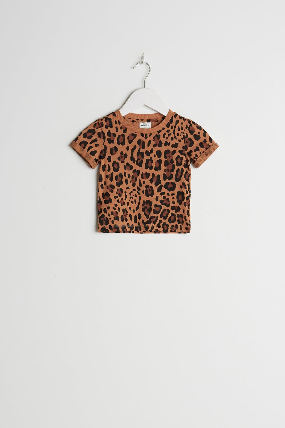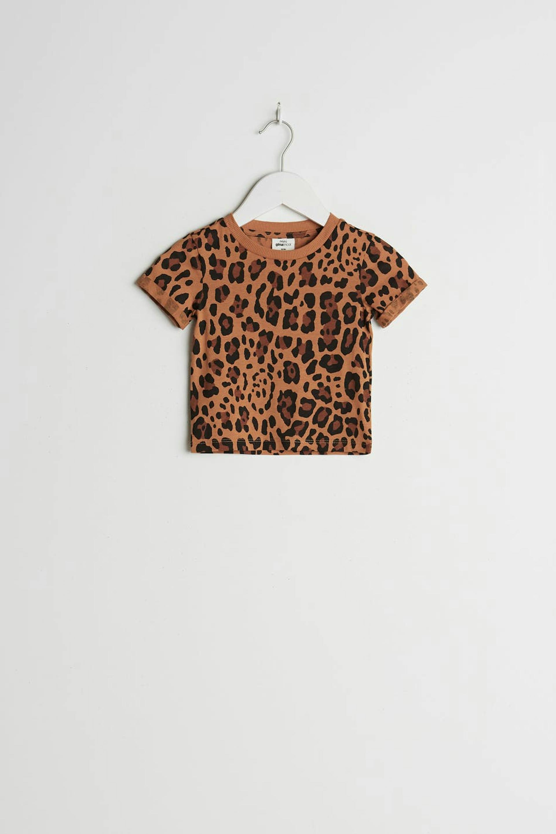 Short-sleeved t-shirt for babies with a normal fit. The t-shirt is leopard.