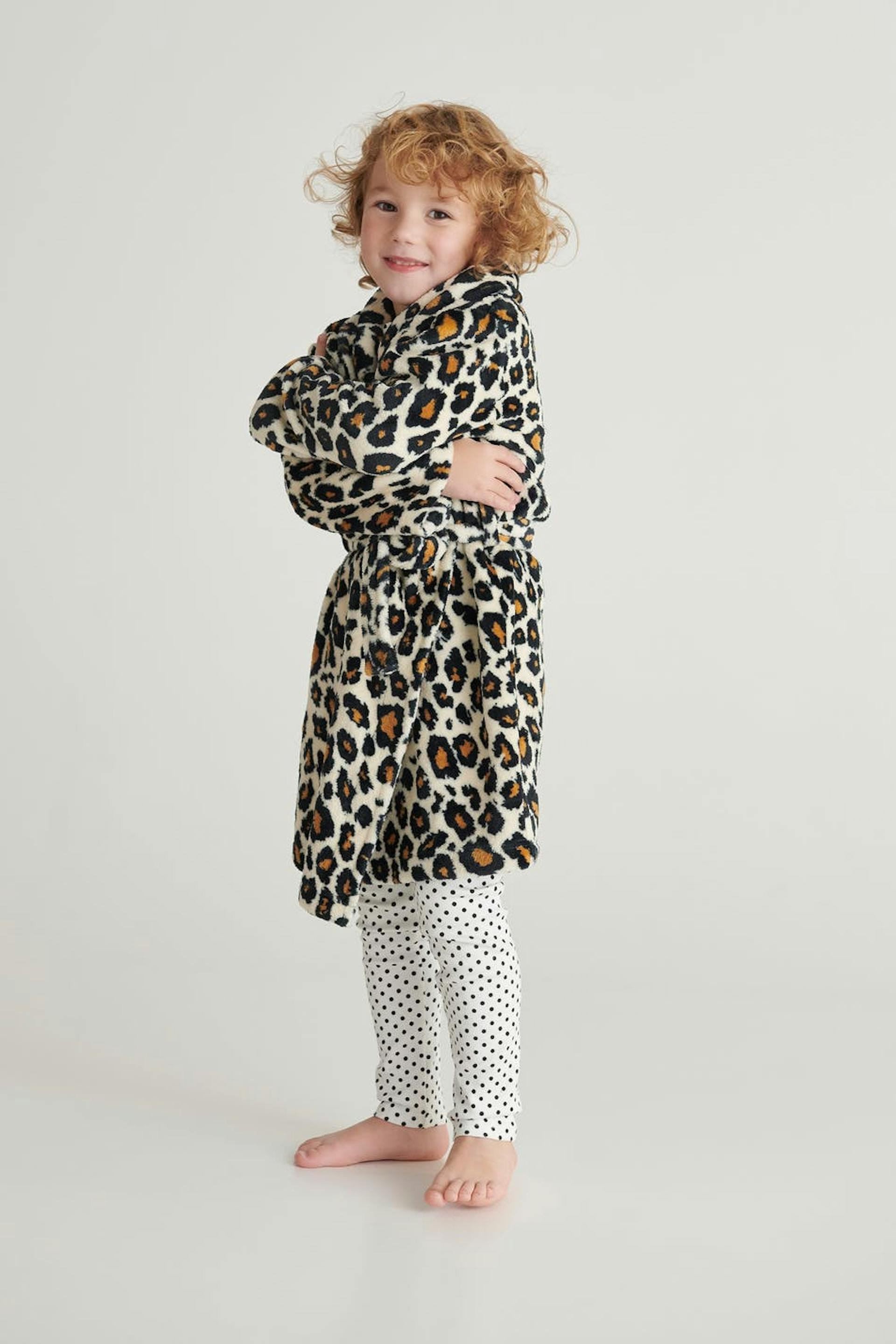 Robe for children with a belt tie at the waist. The robe is leopard. It is made of fleece. Keep away from fire.