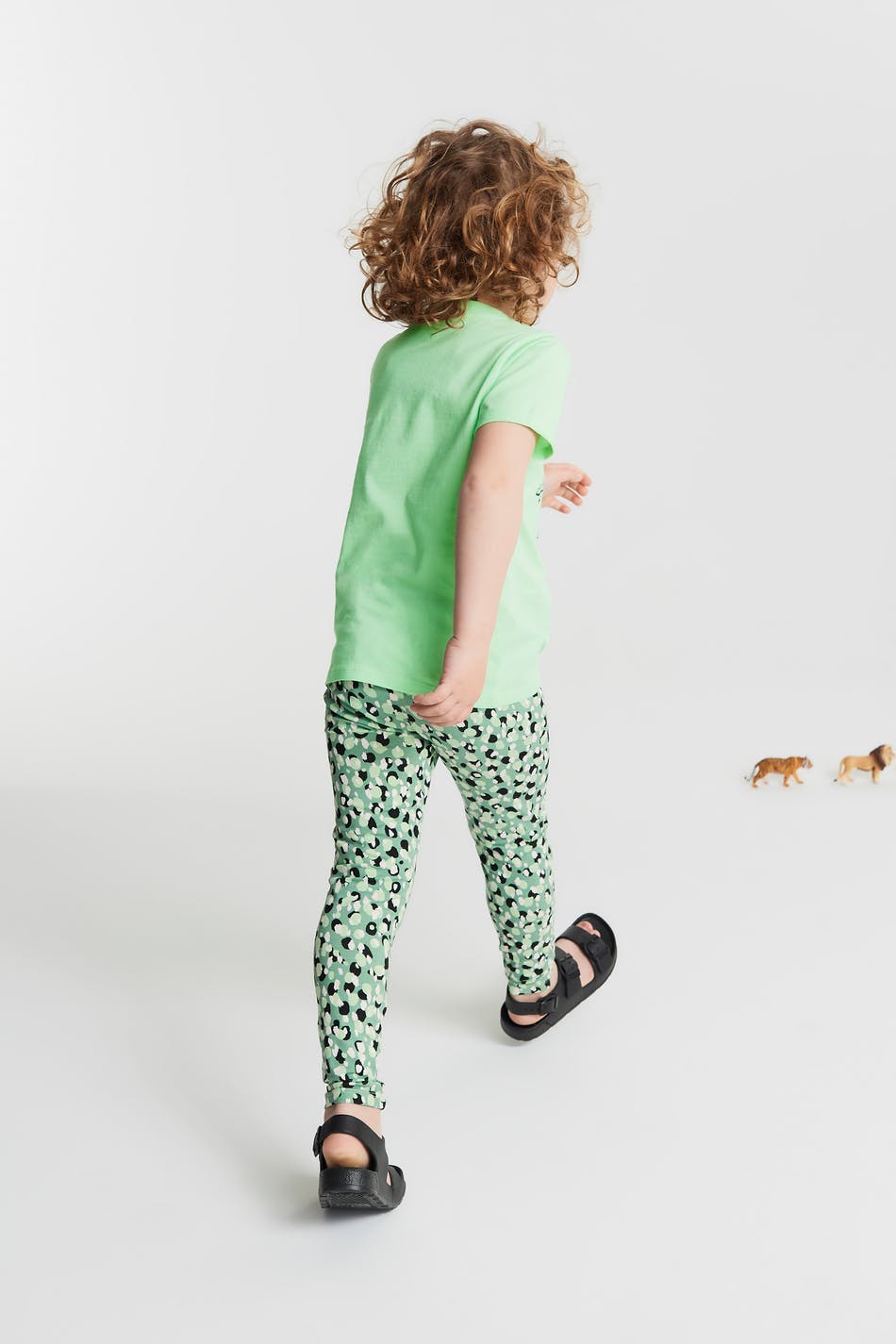 Unisex leggings for children. The leggings is green and patterned. It is made of jersey.