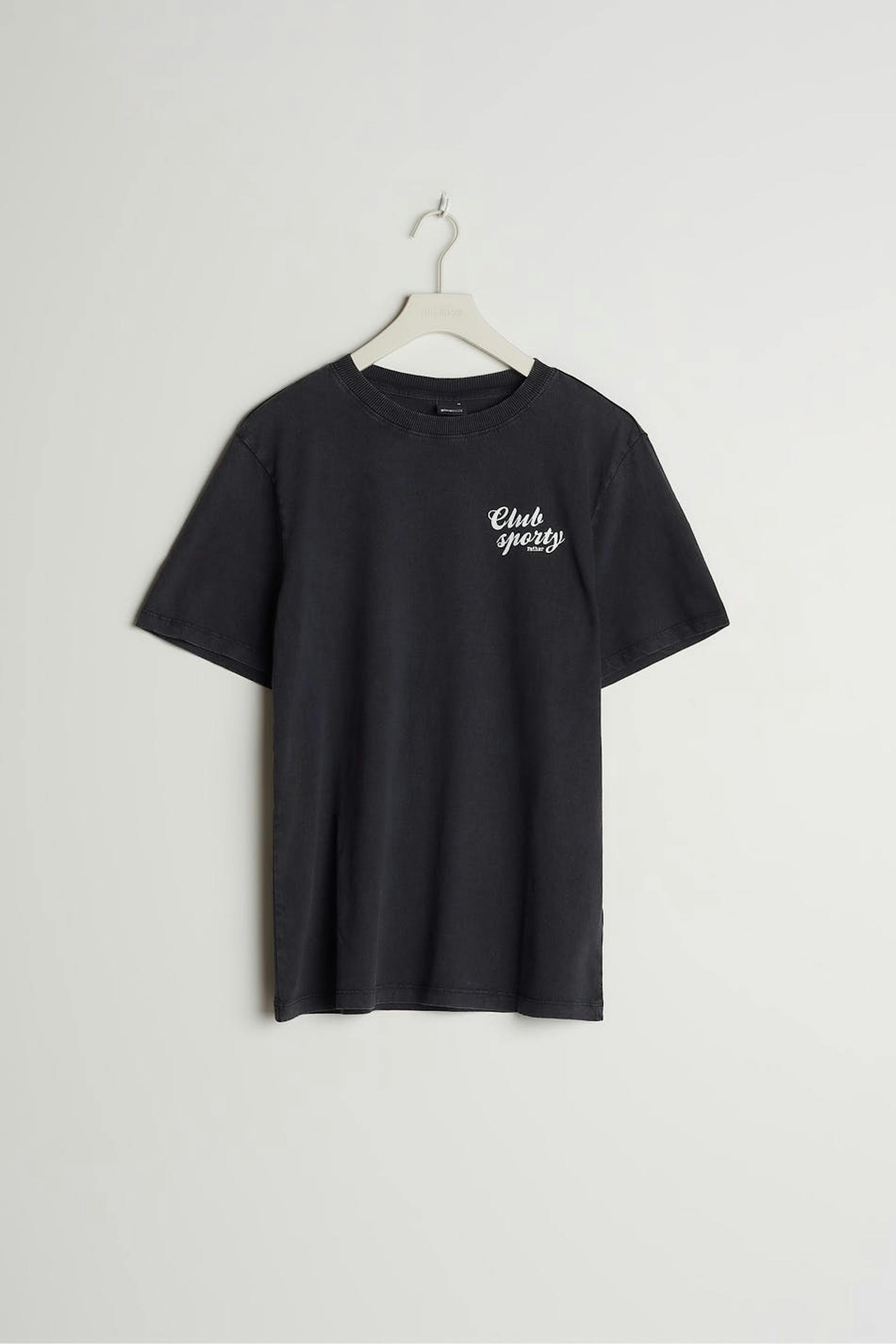 Short-sleeved t-shirt with a regular fit. The t-shirt is black and unisex and has a printed text on the chest.