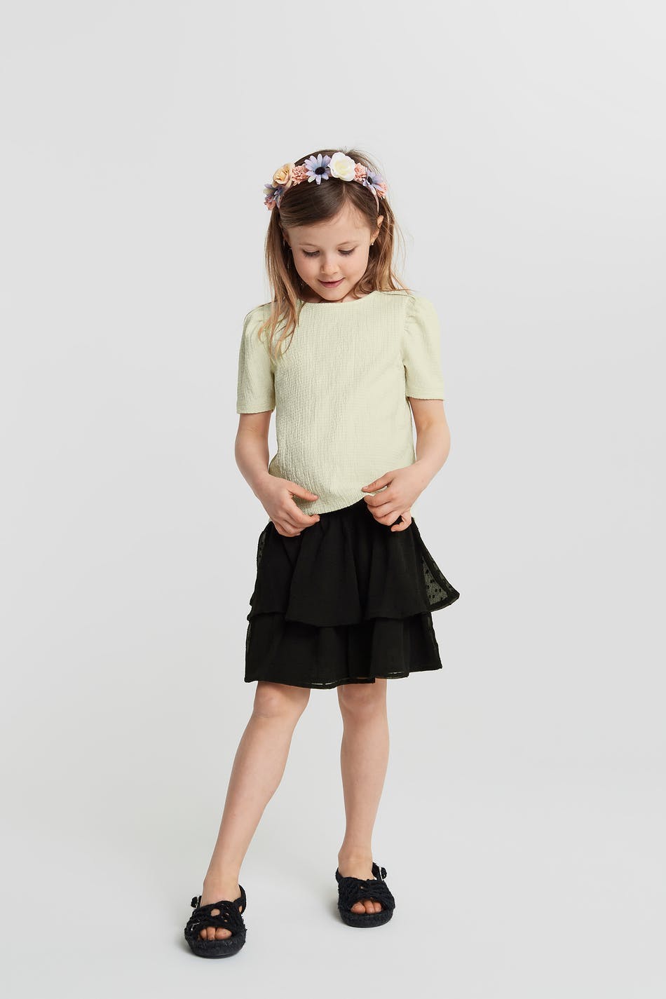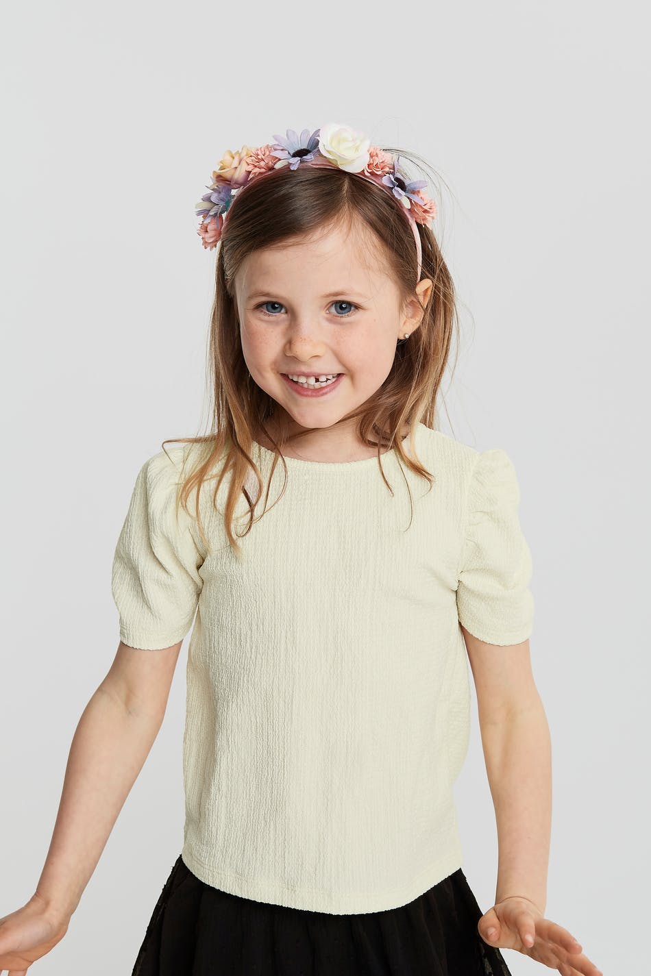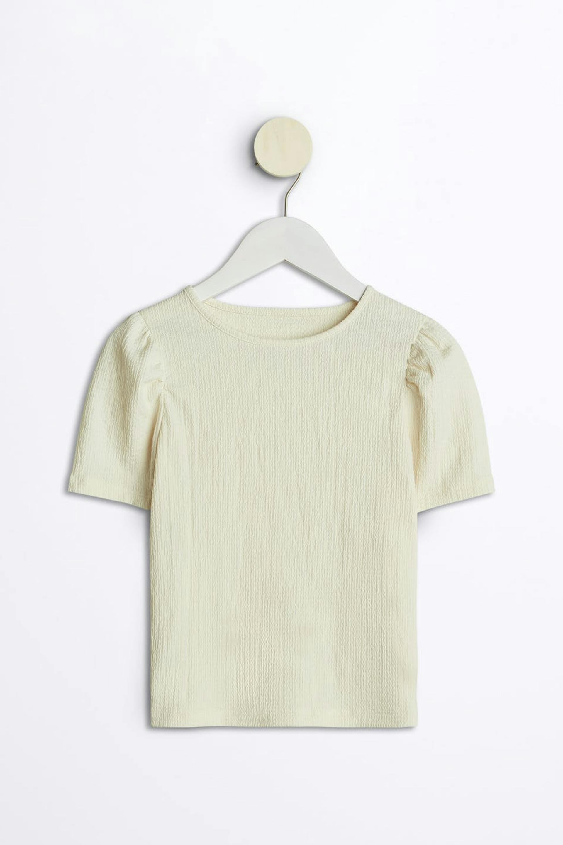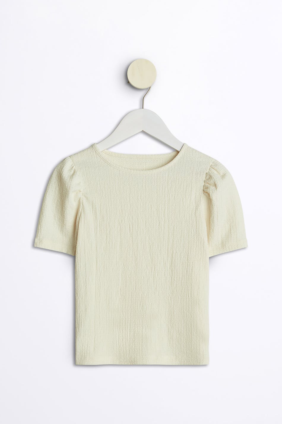 Short-sleeved top for children with puff sleeves. The top is beige.