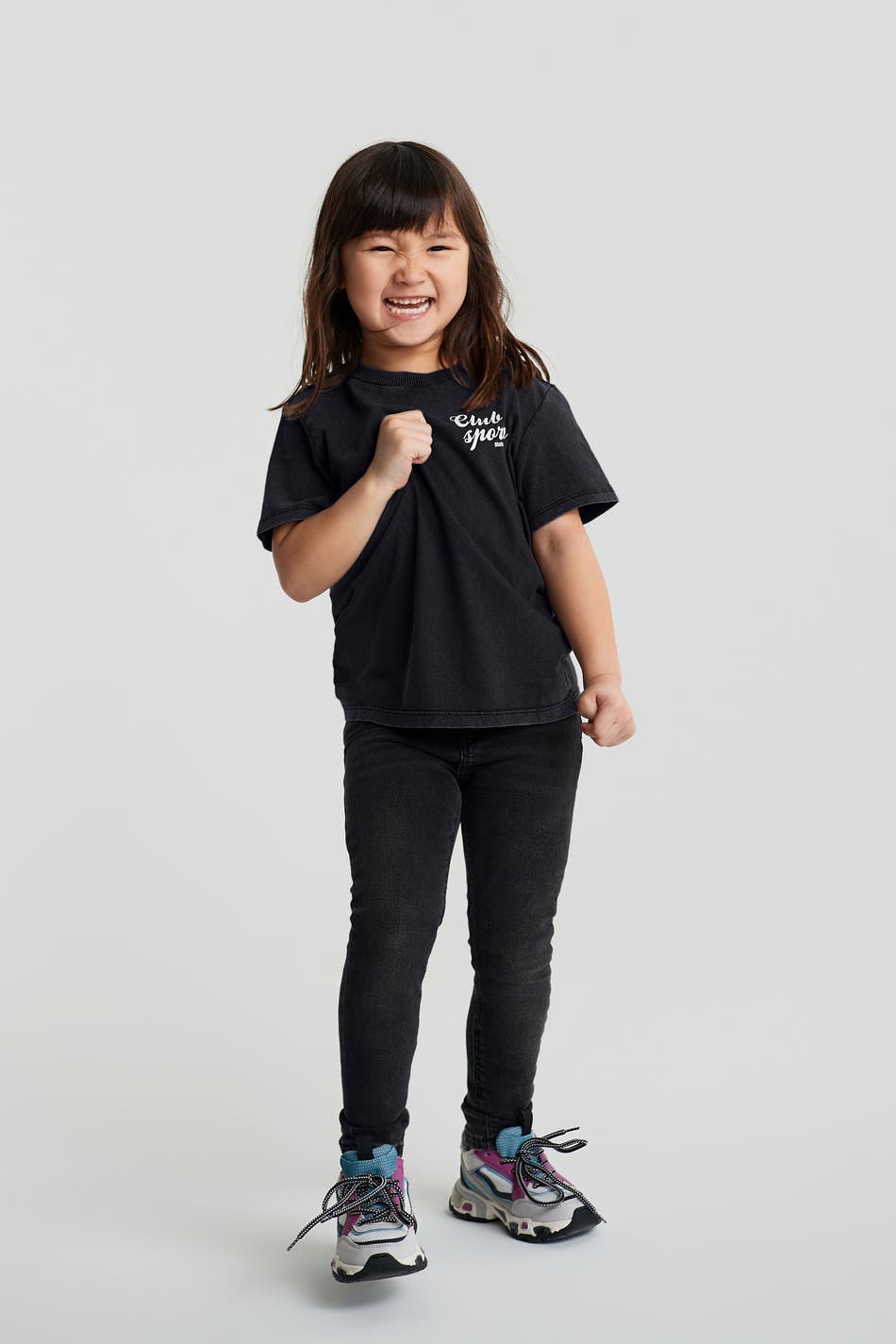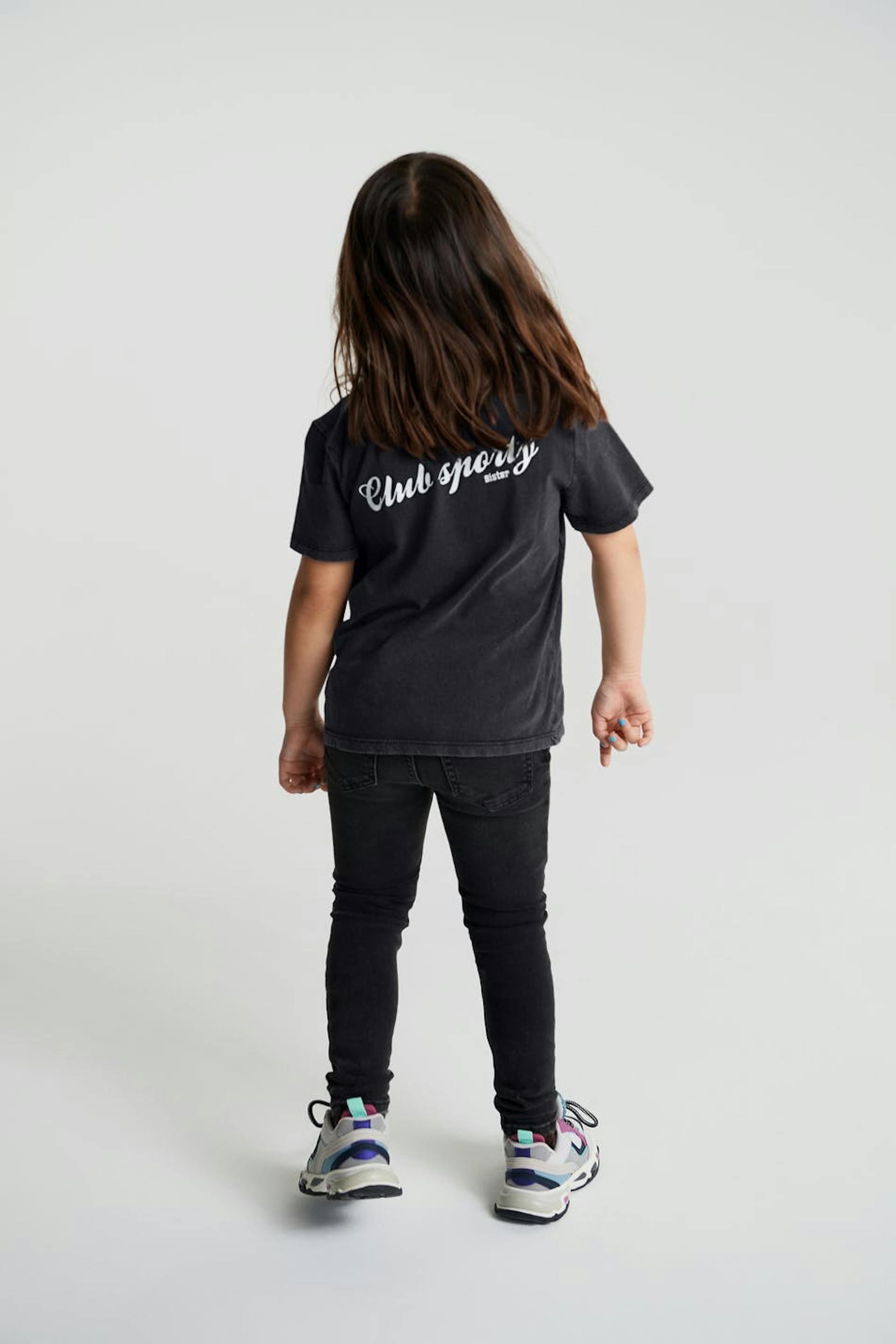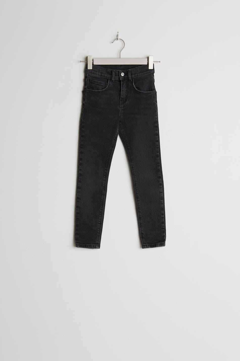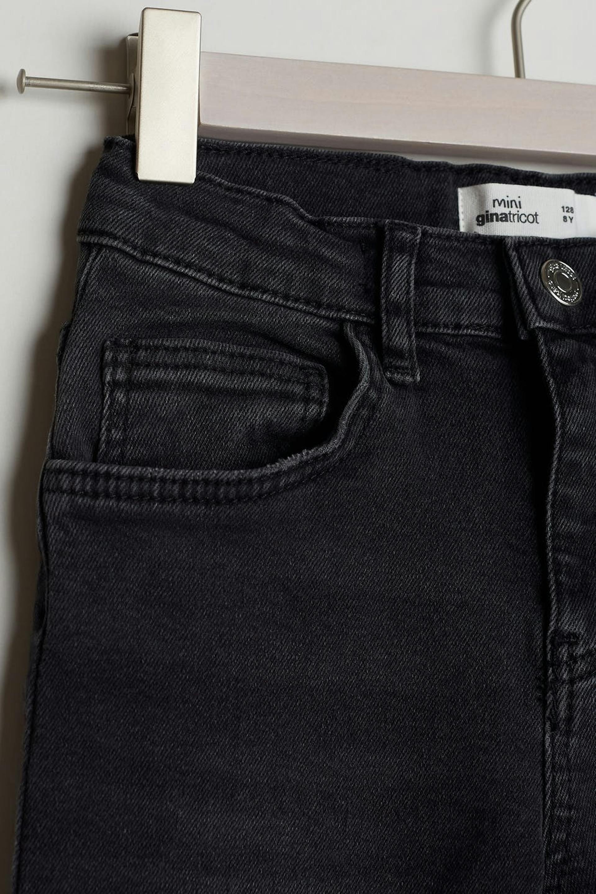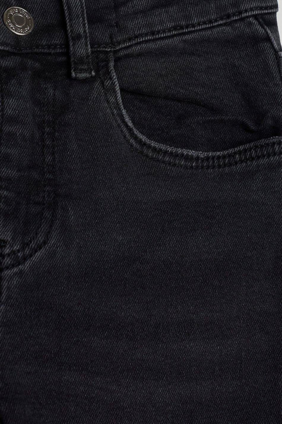 Unisex jeans for children with a fitted fit. The jeans are black and have a skinny fit. They have comfort stretch and an adjustable elastic band at the waist.