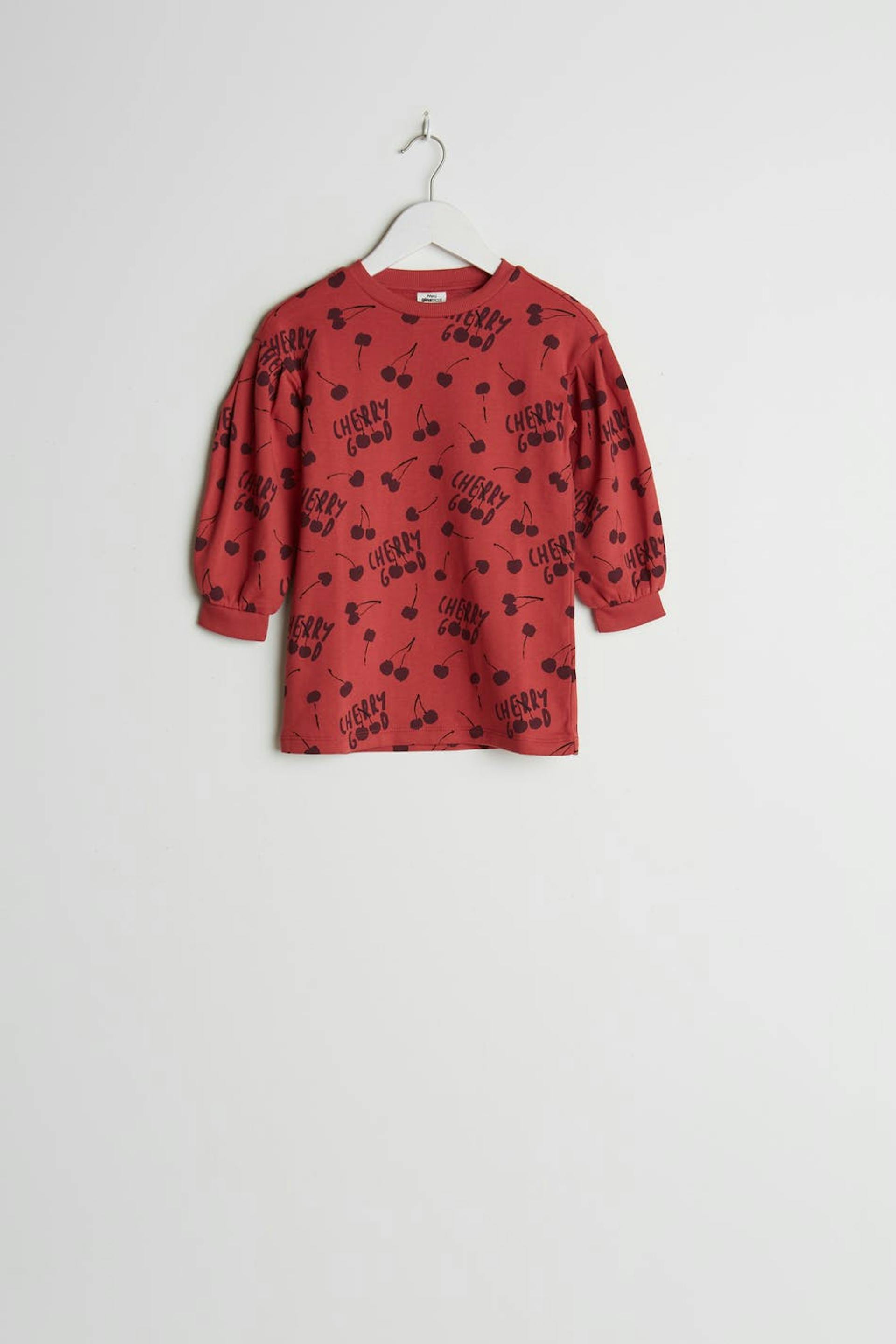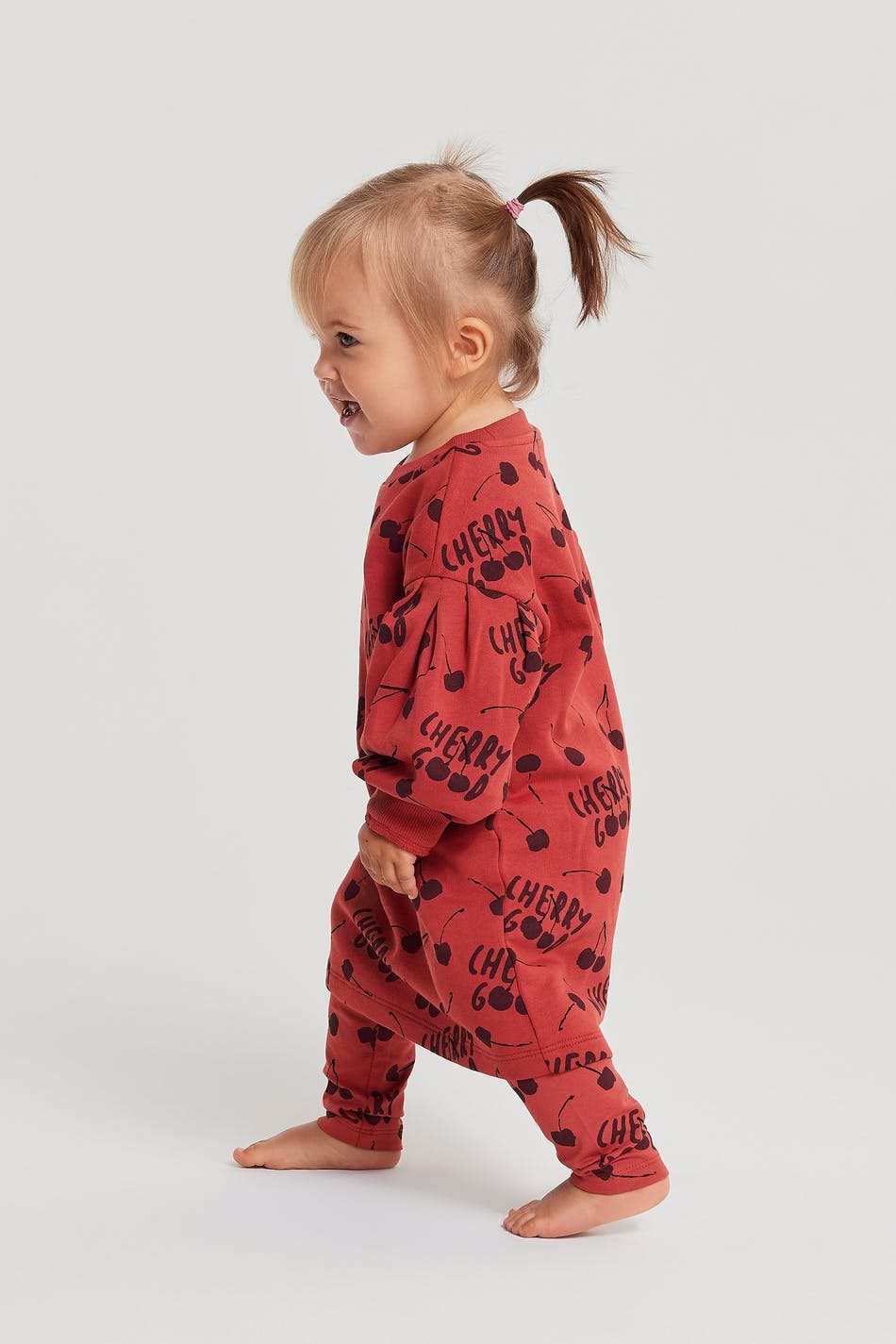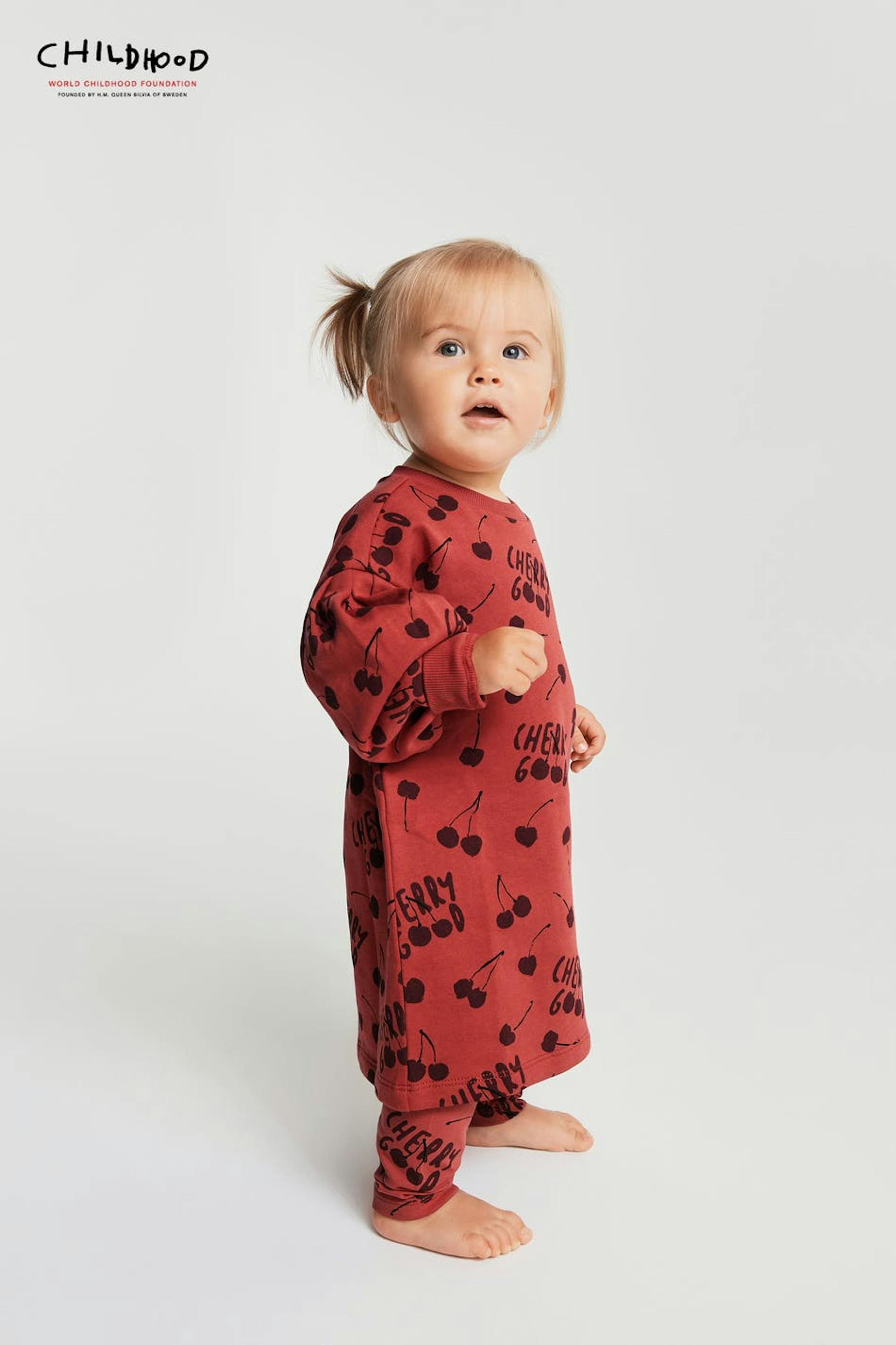 Dress for children with a ribbed cuff on the sleeve ends and on the neckline. The dress is red. It is made of sweatshirt fabric.
