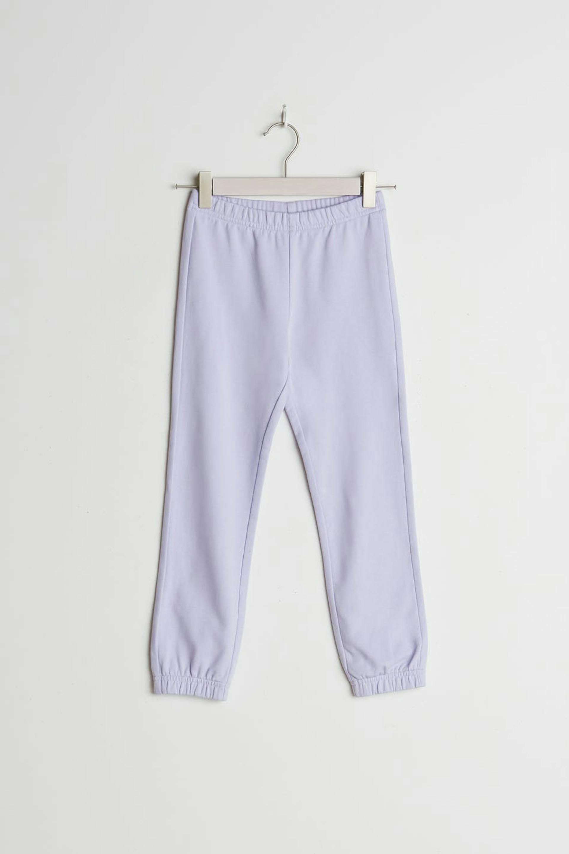 Tracksuit trousers for children with a regular fit. The trousers are purple and have an elastic band at the waist and at the end of the legs.