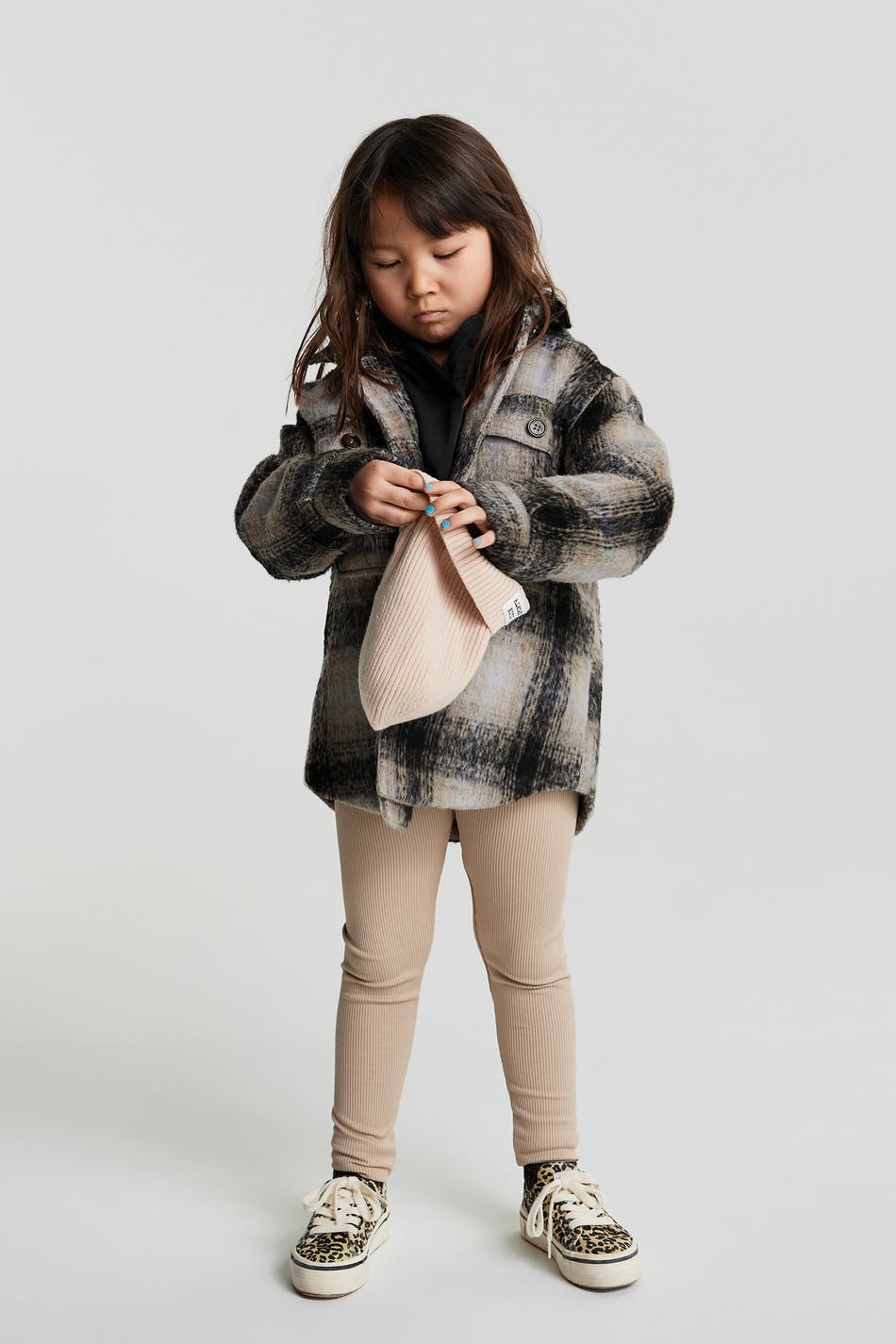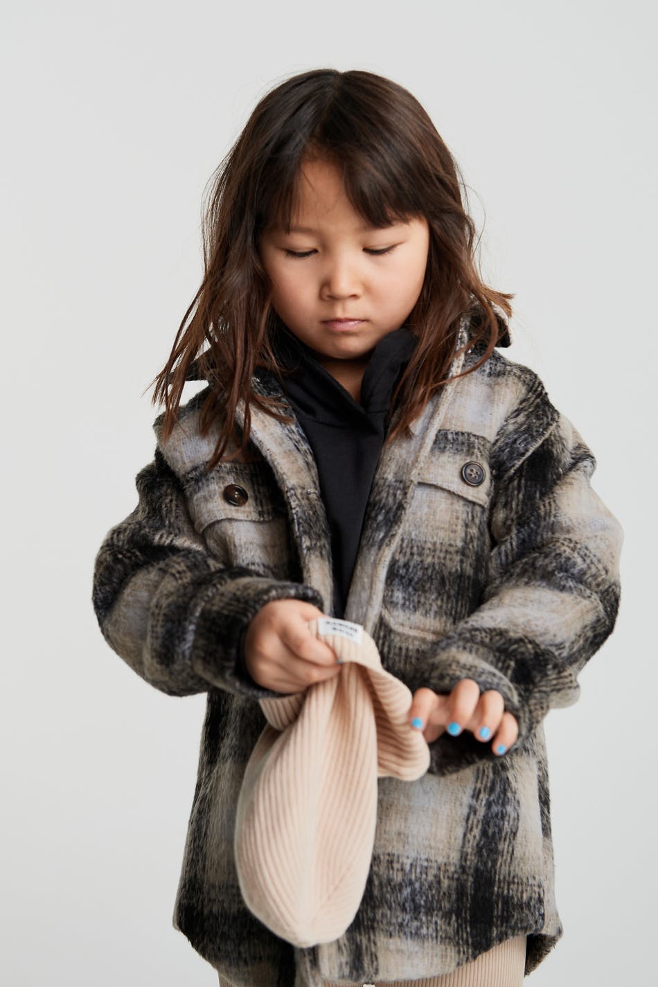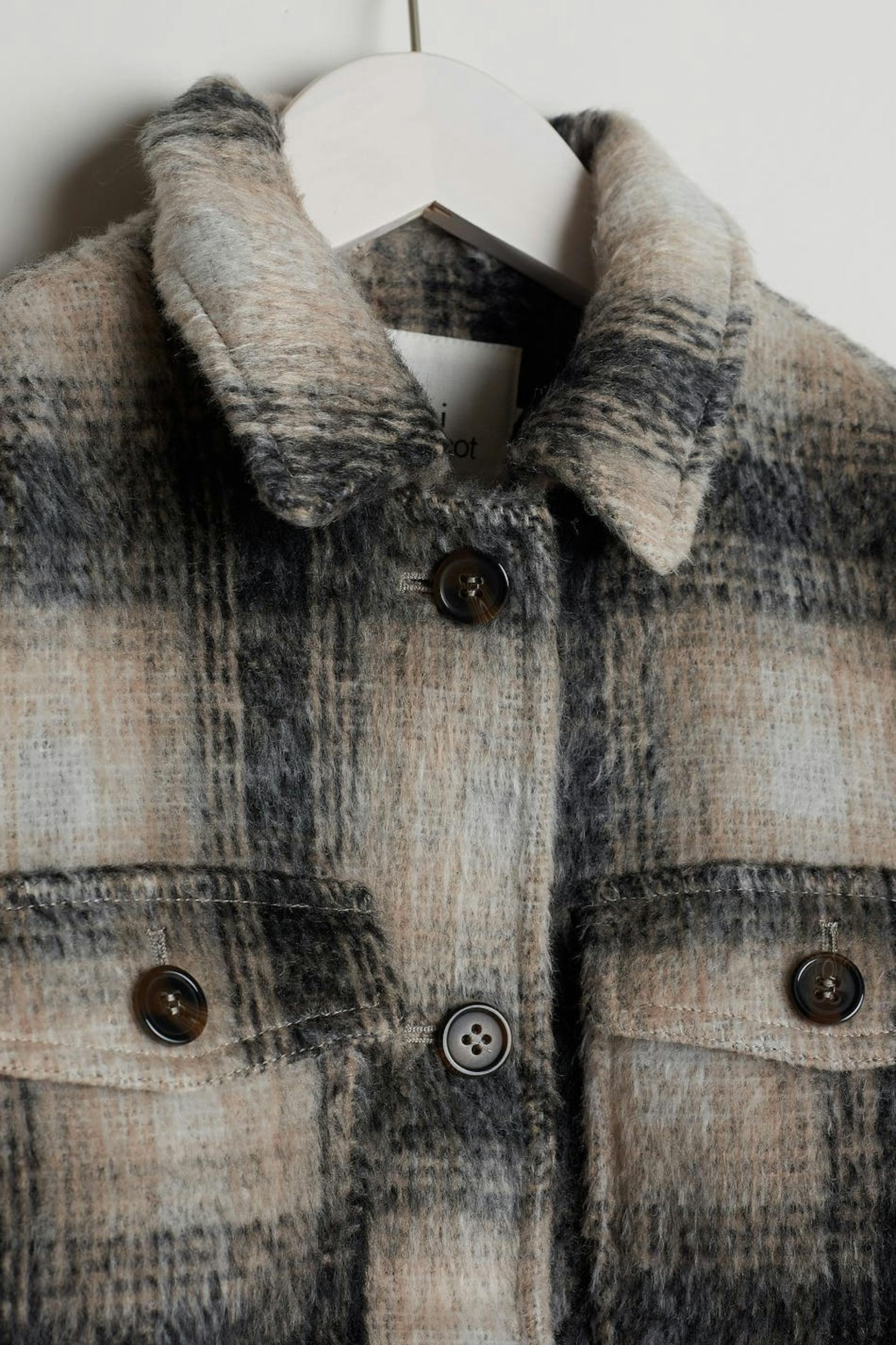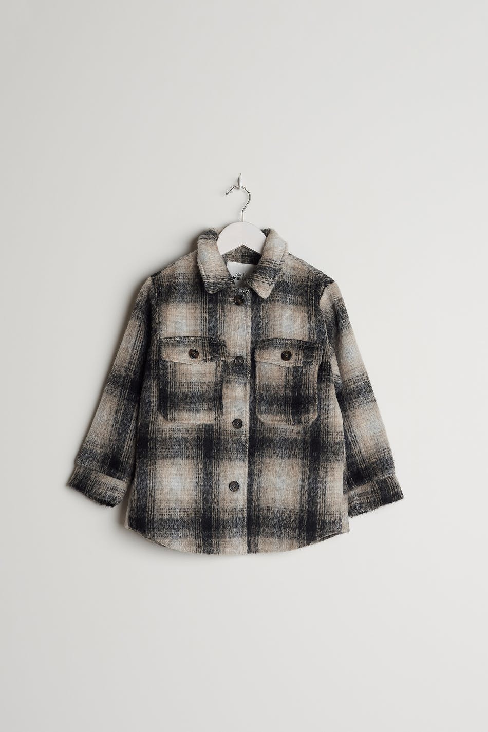 Checked jackets for children with a normal fit. The jackets are grey and have a shirt collar. They have chest pockets and buttons at the front and on the pockets.
