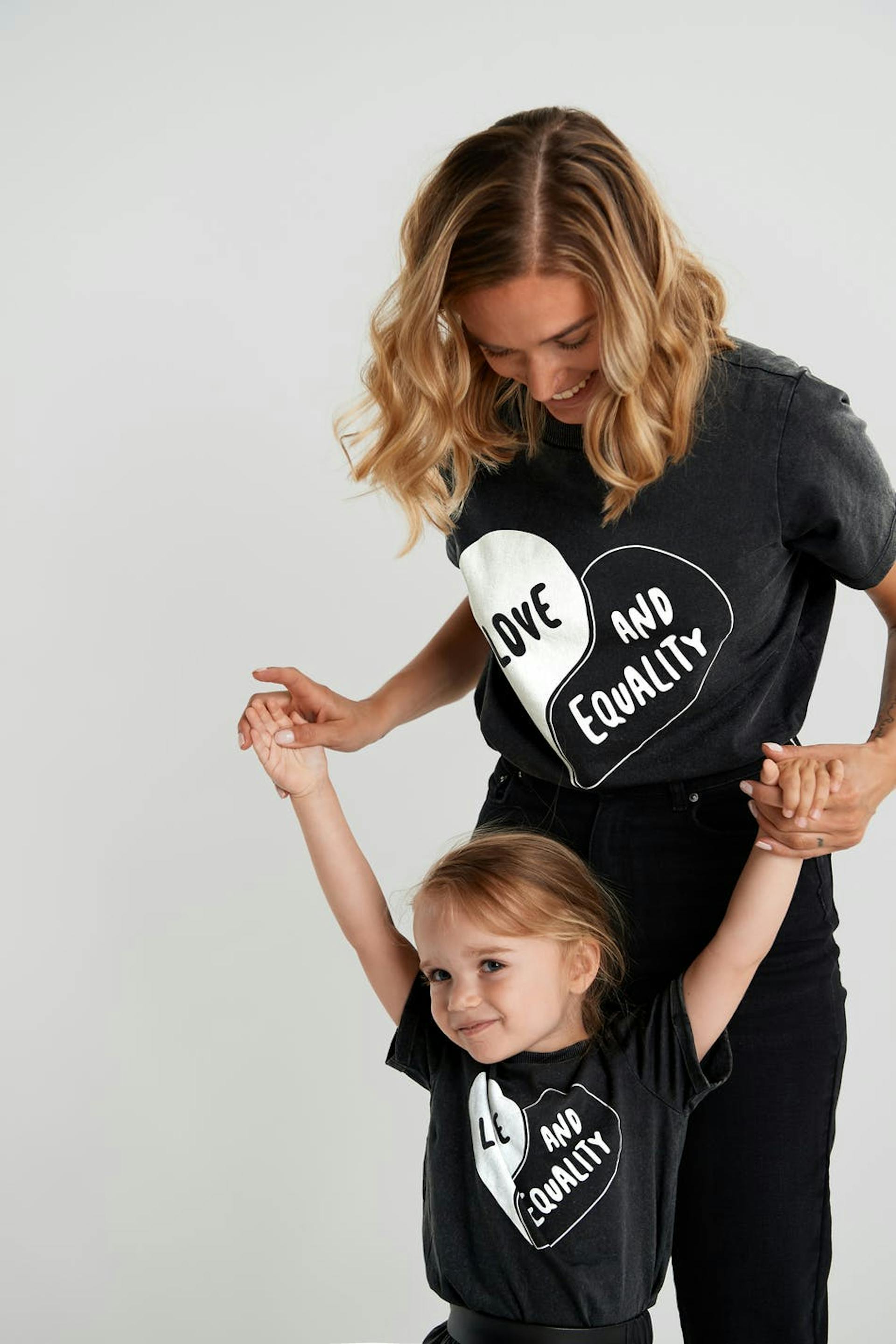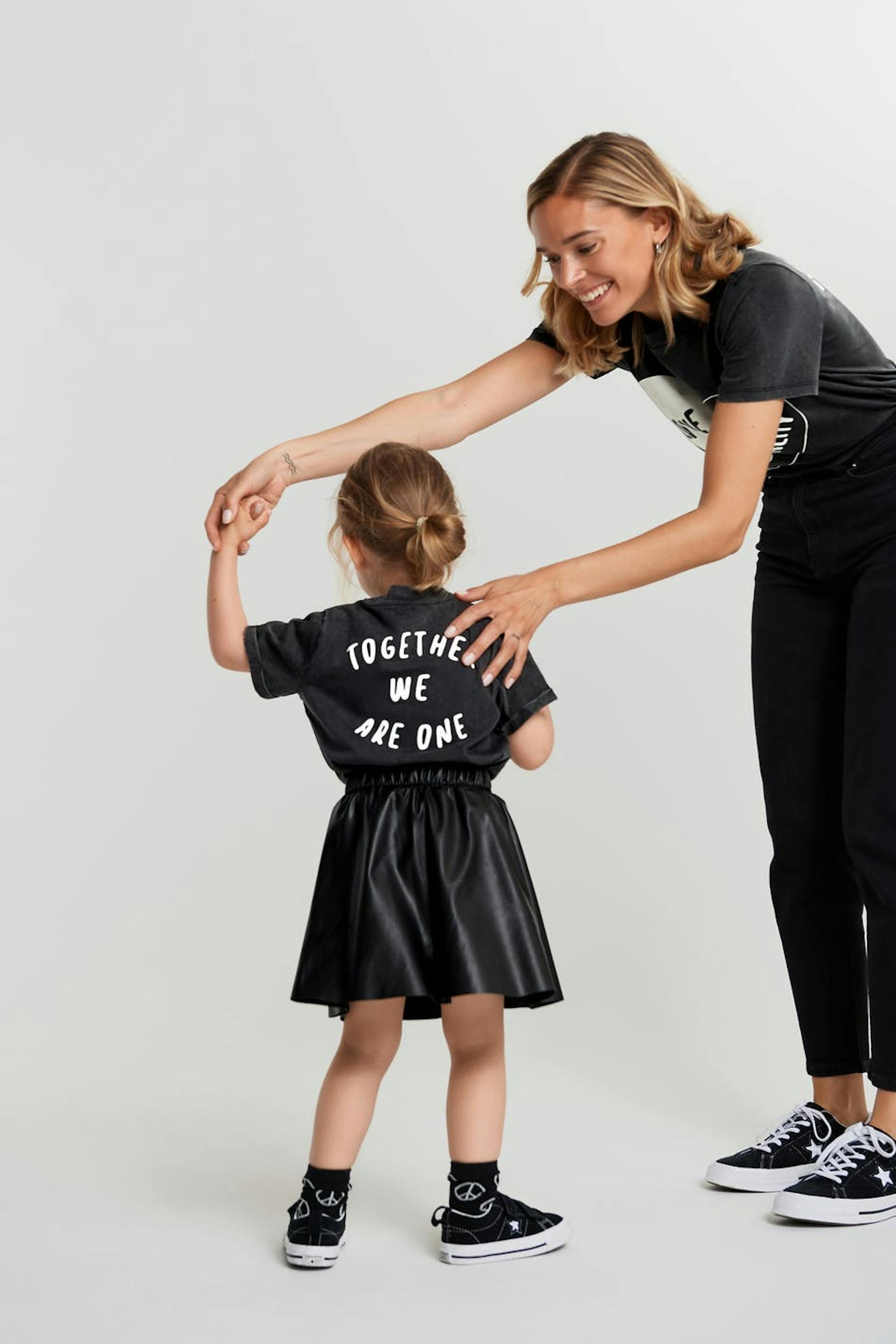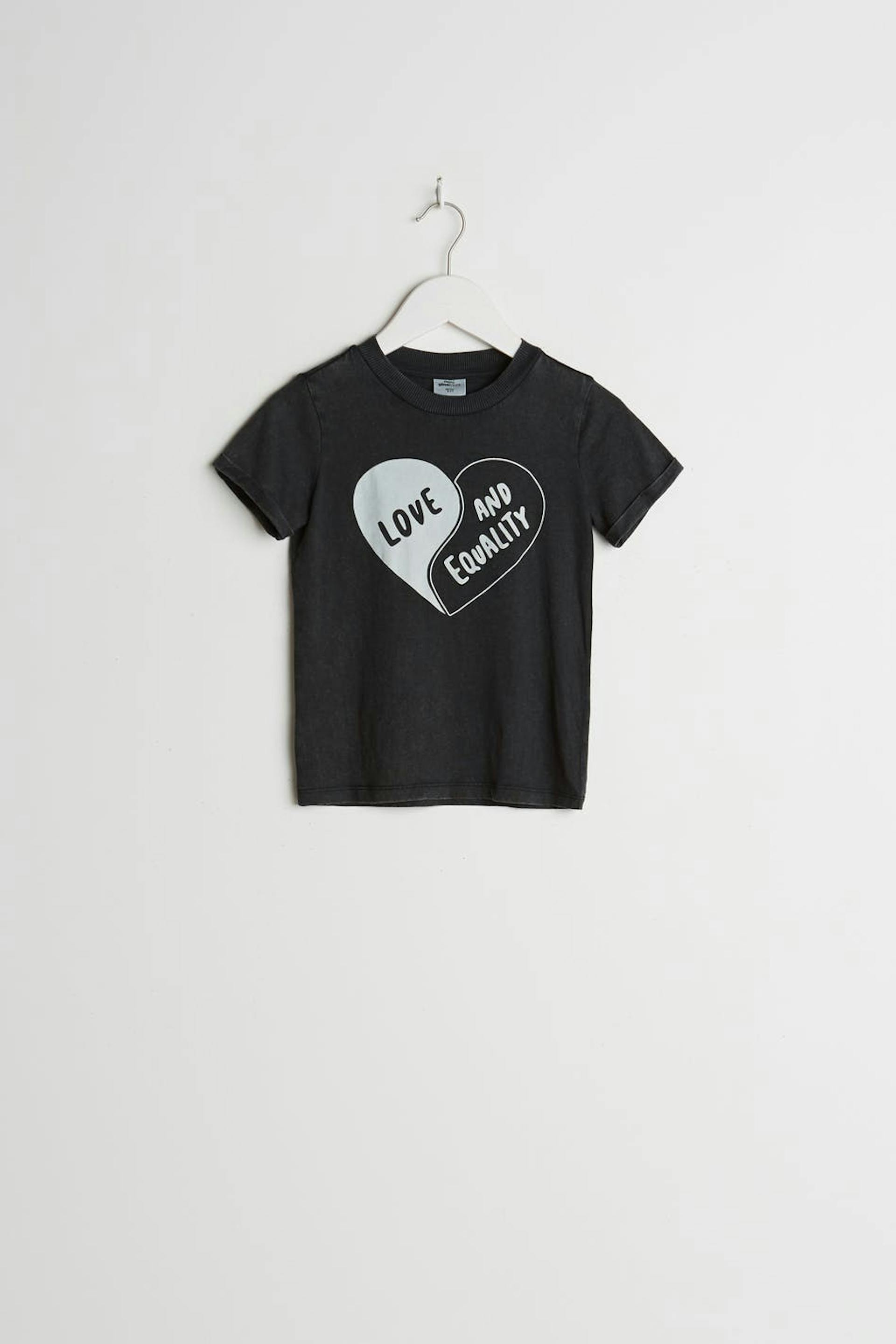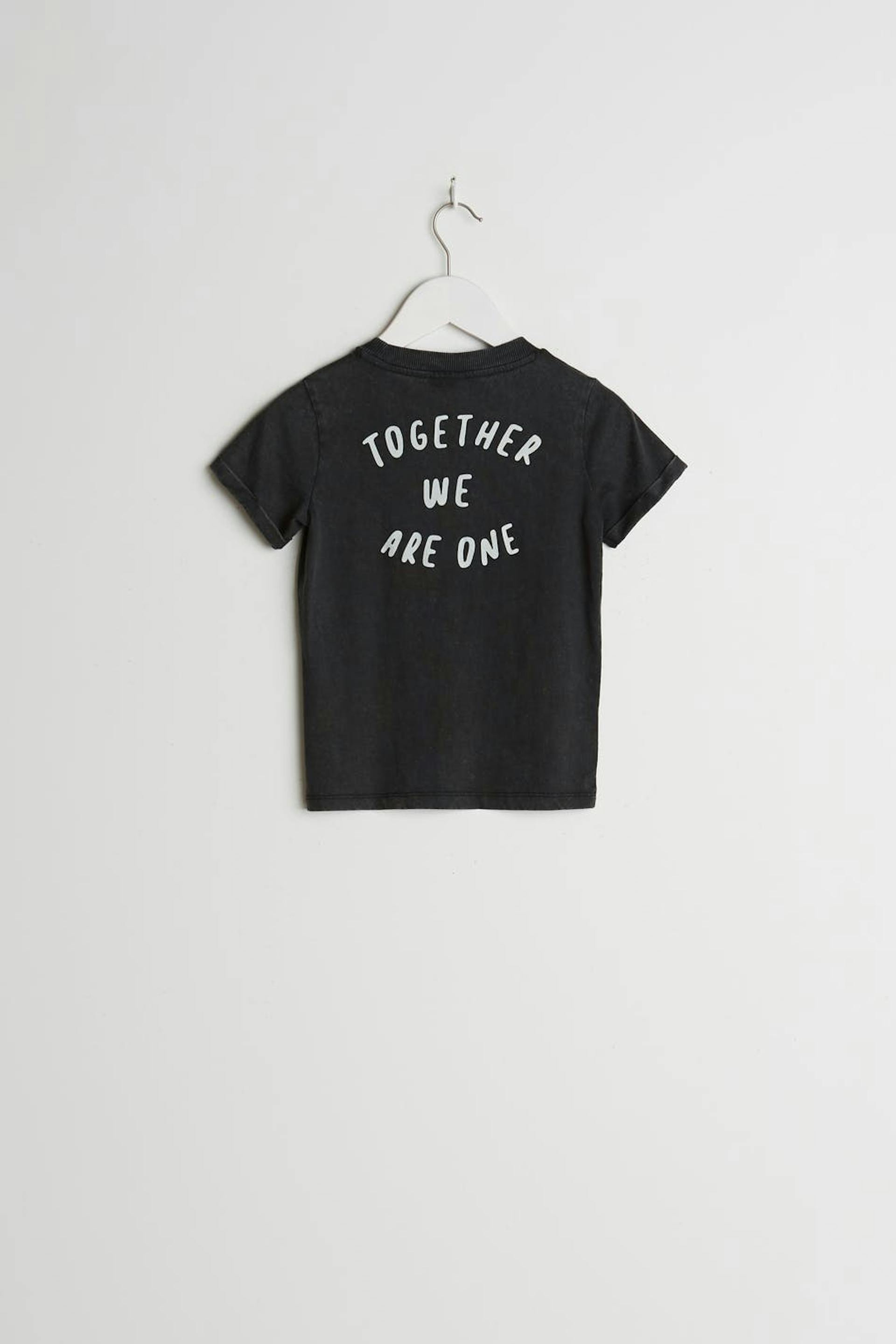 T-shirt for children with a print with a text in the back. The t-shirt is black and has a washed quality.