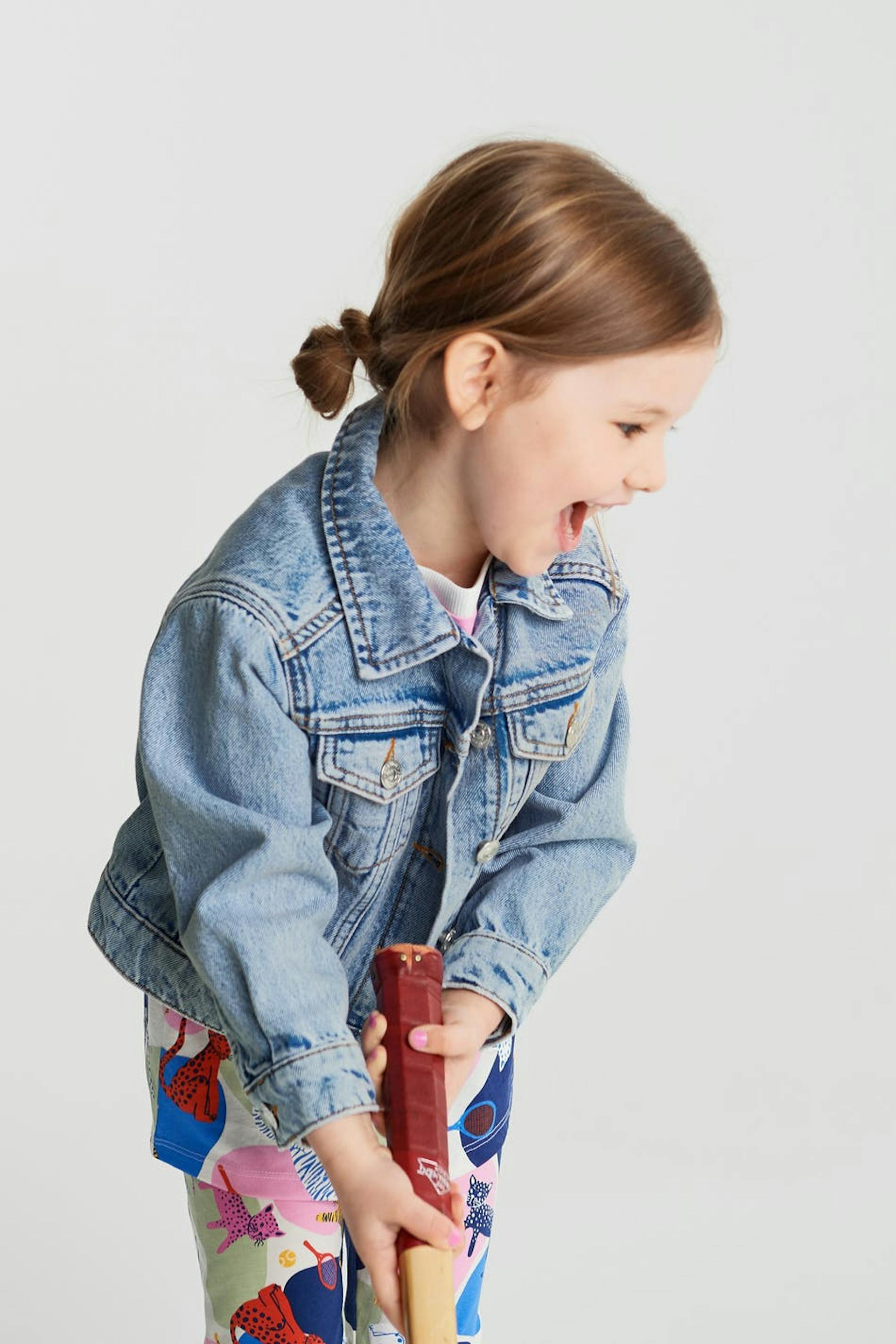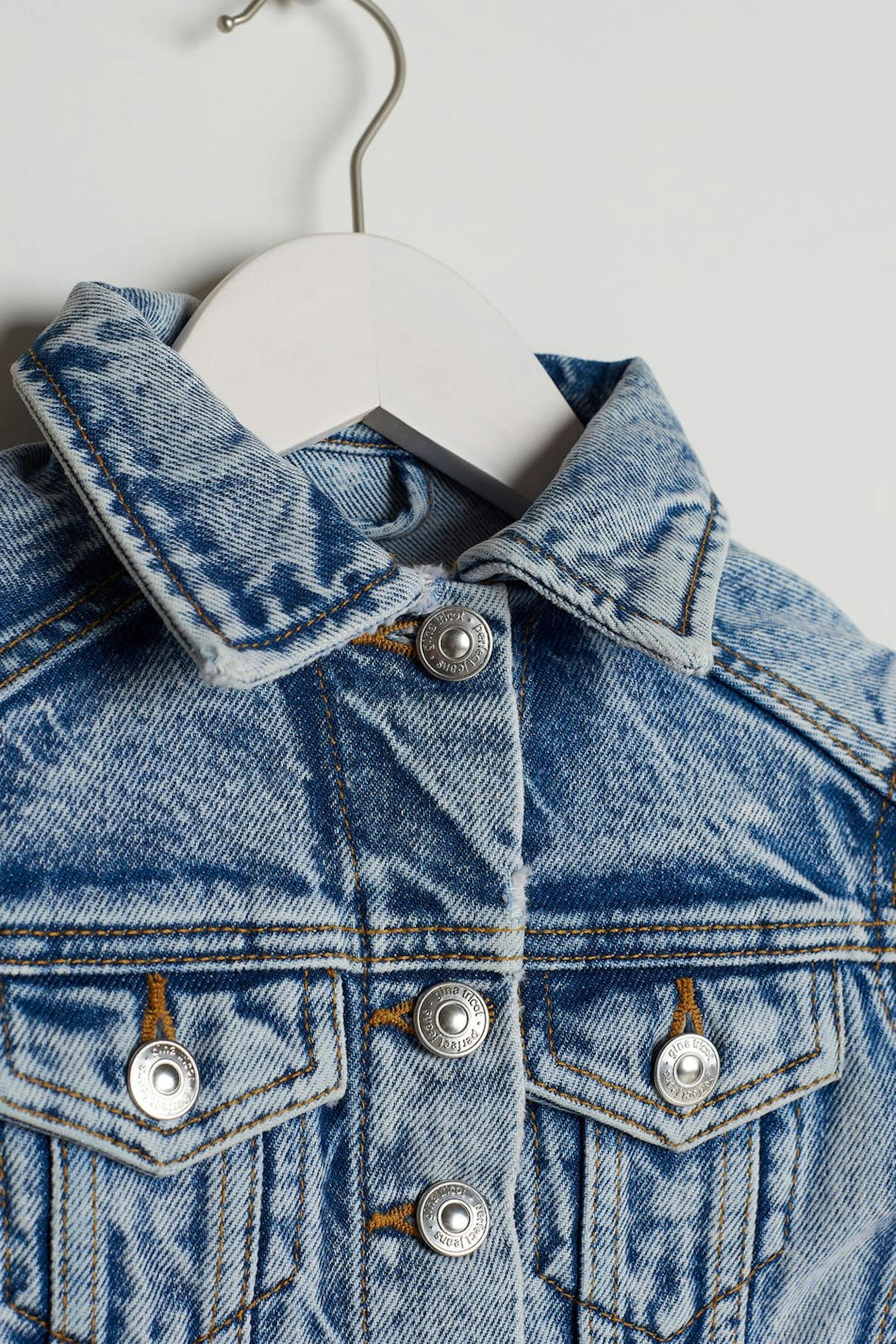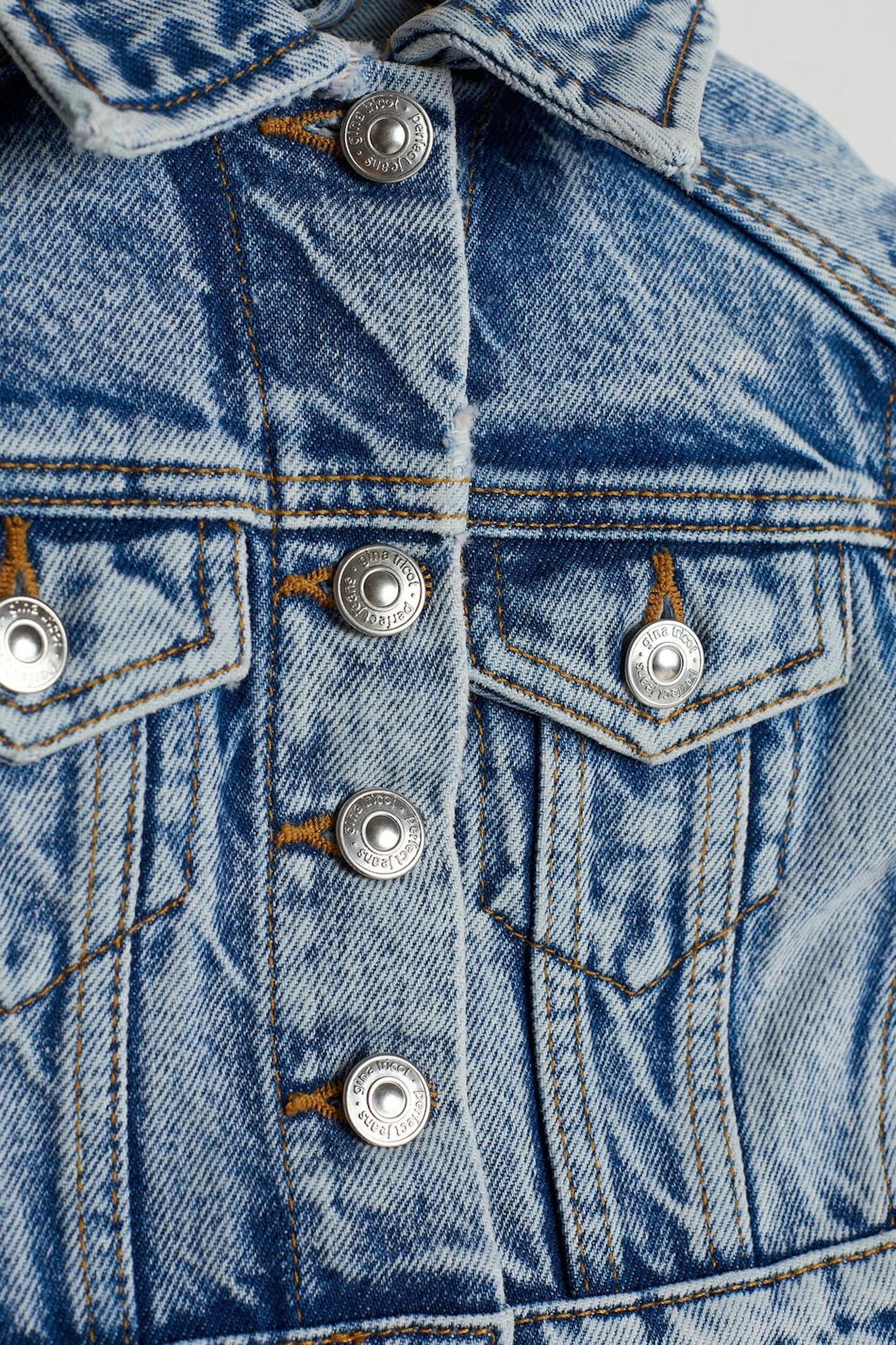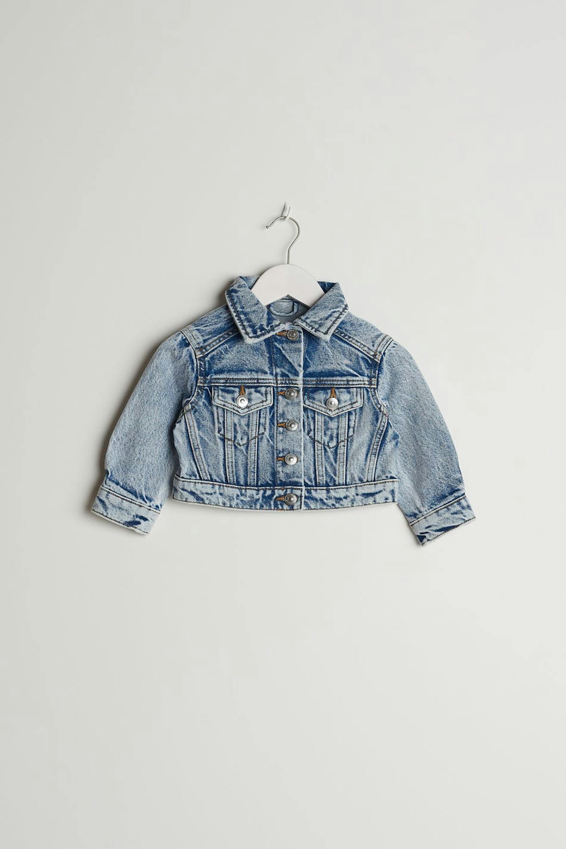 Cropped denim jacket for children. The jacket is blue and unisex.
