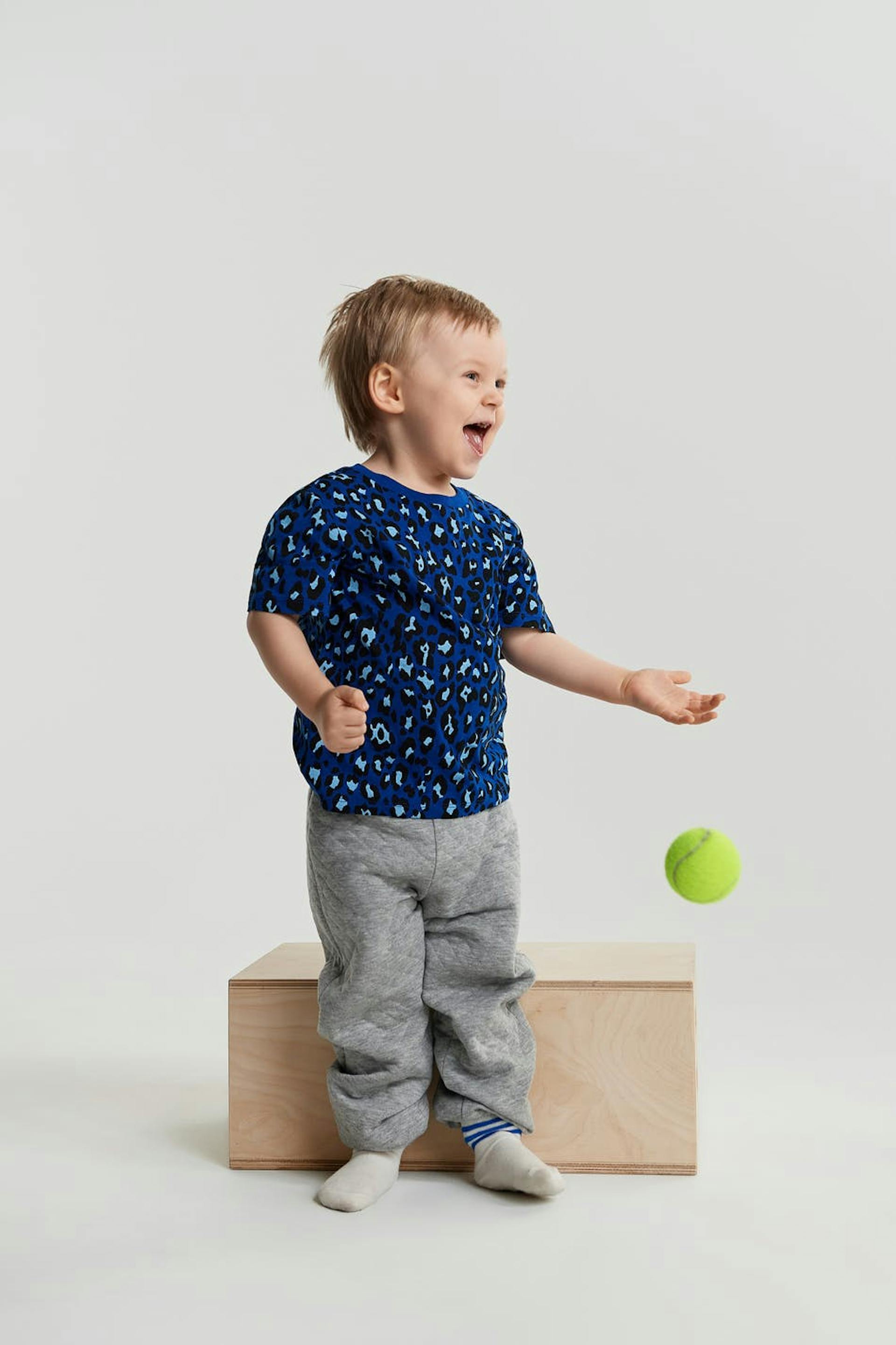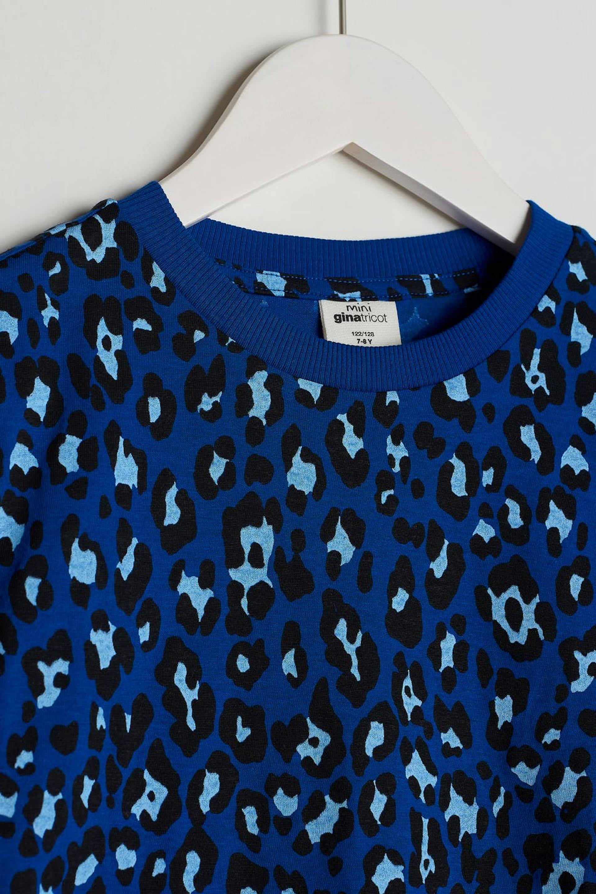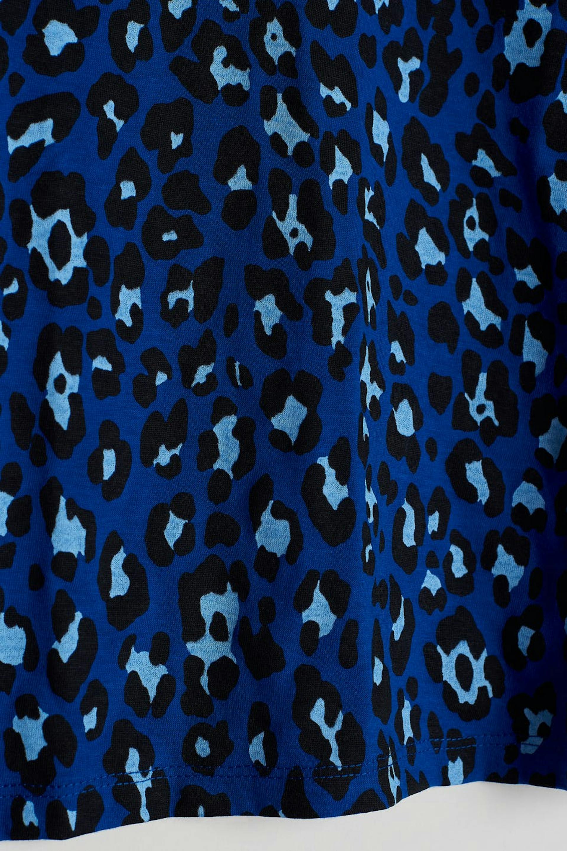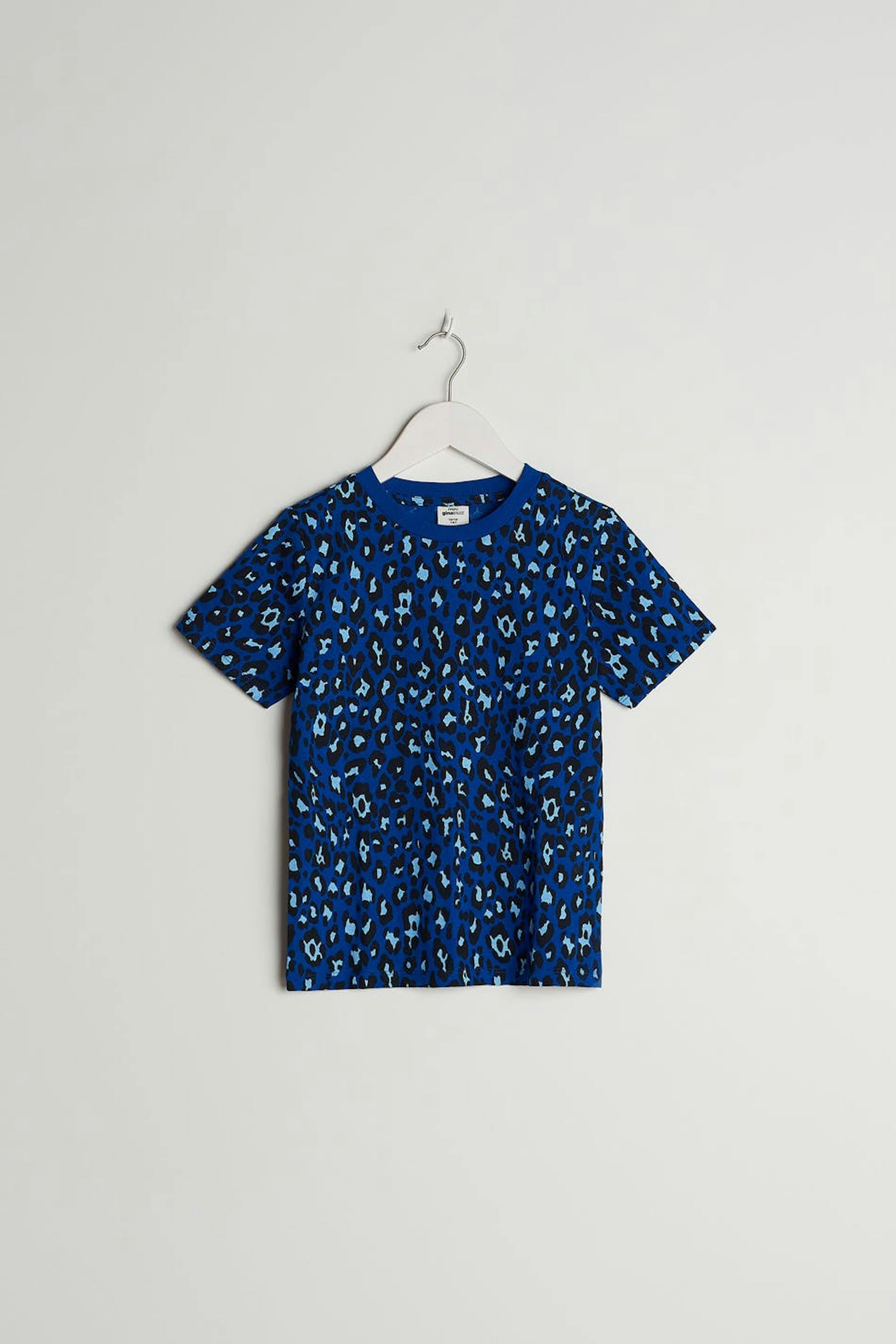 Unisex t-shirt for children with an oversize fit. The t-shirt is blue and leopard.