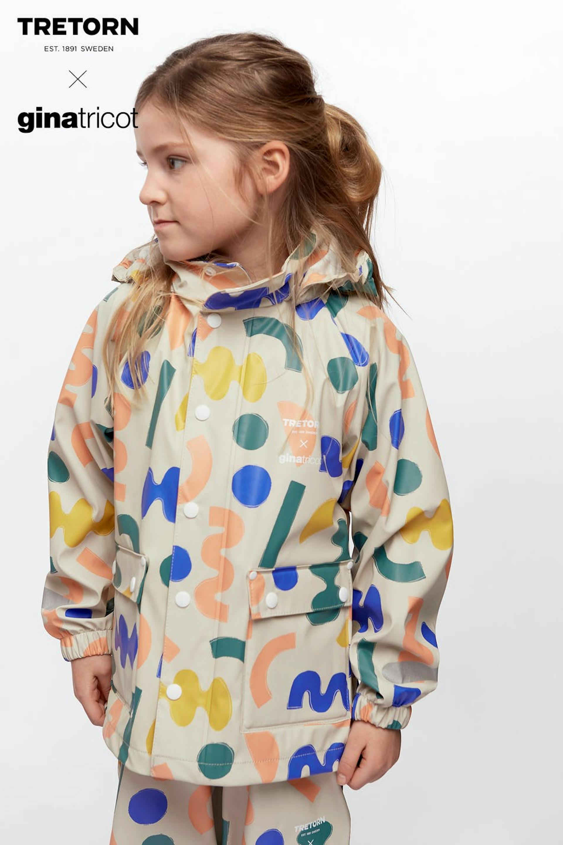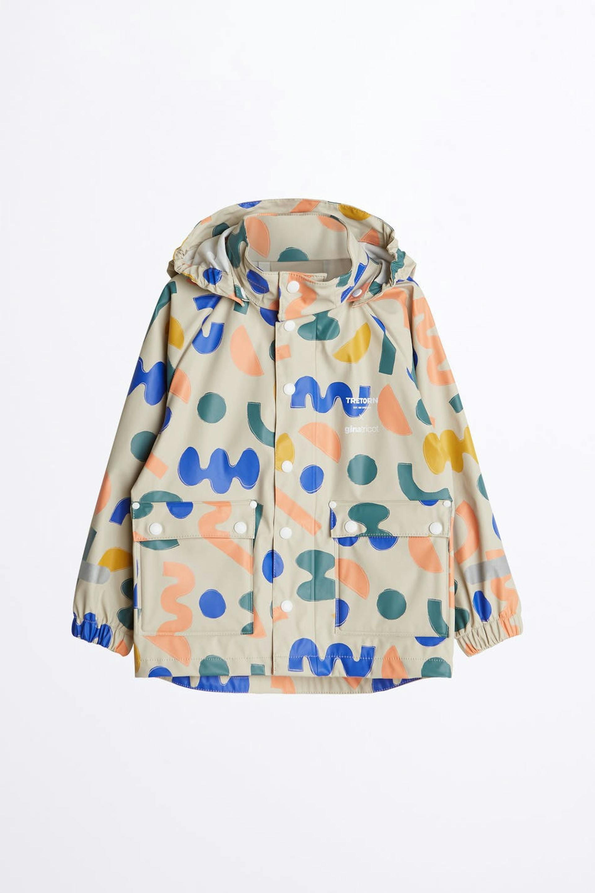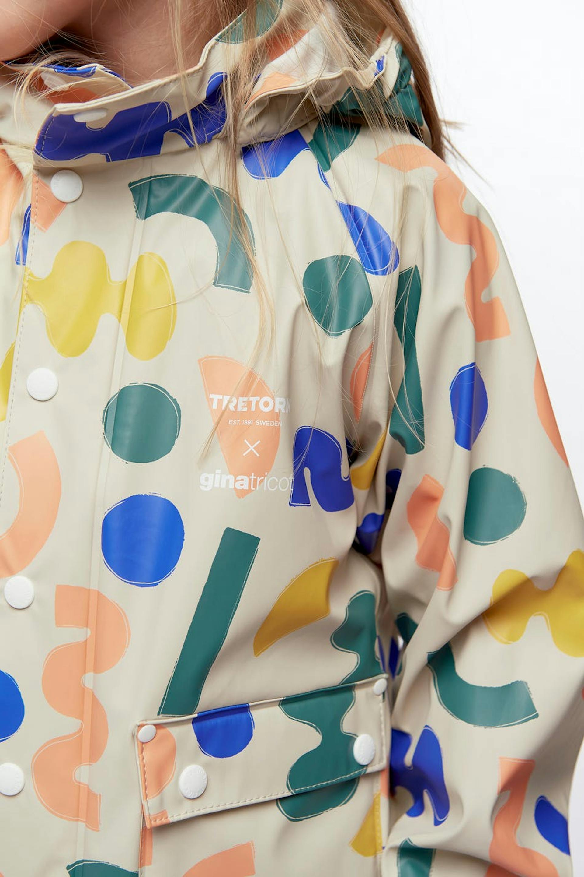 Tretorn X Gina tricot. Raincoat in collaboration with Tretorn. Raincoat for children with a generous fit. The jacket is beige and has a geometric, multi coloured pattern. It has snap buttons at the front, a hood with a drawstring and reflective detail on the sleeves. Water column: 5000 mm.
