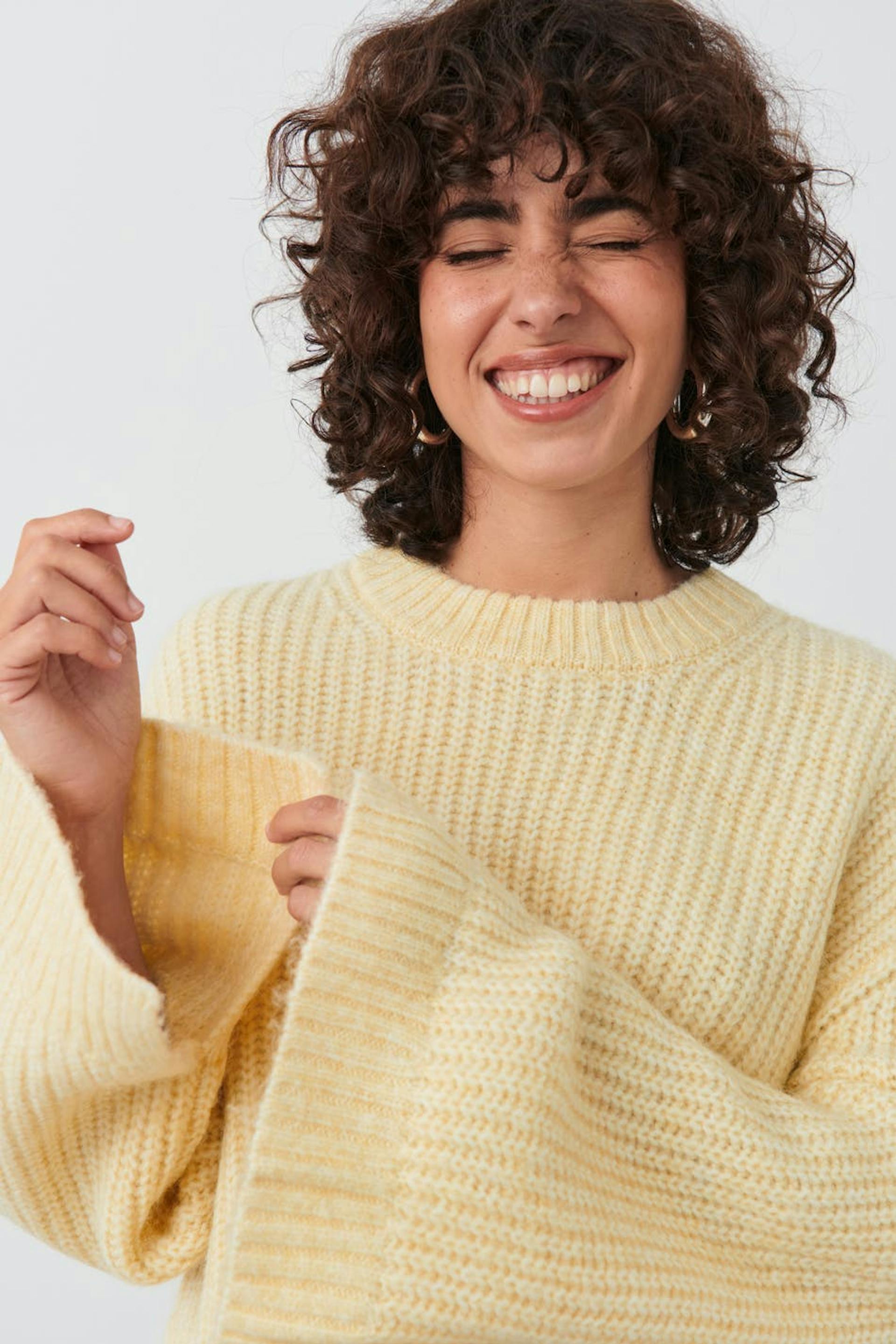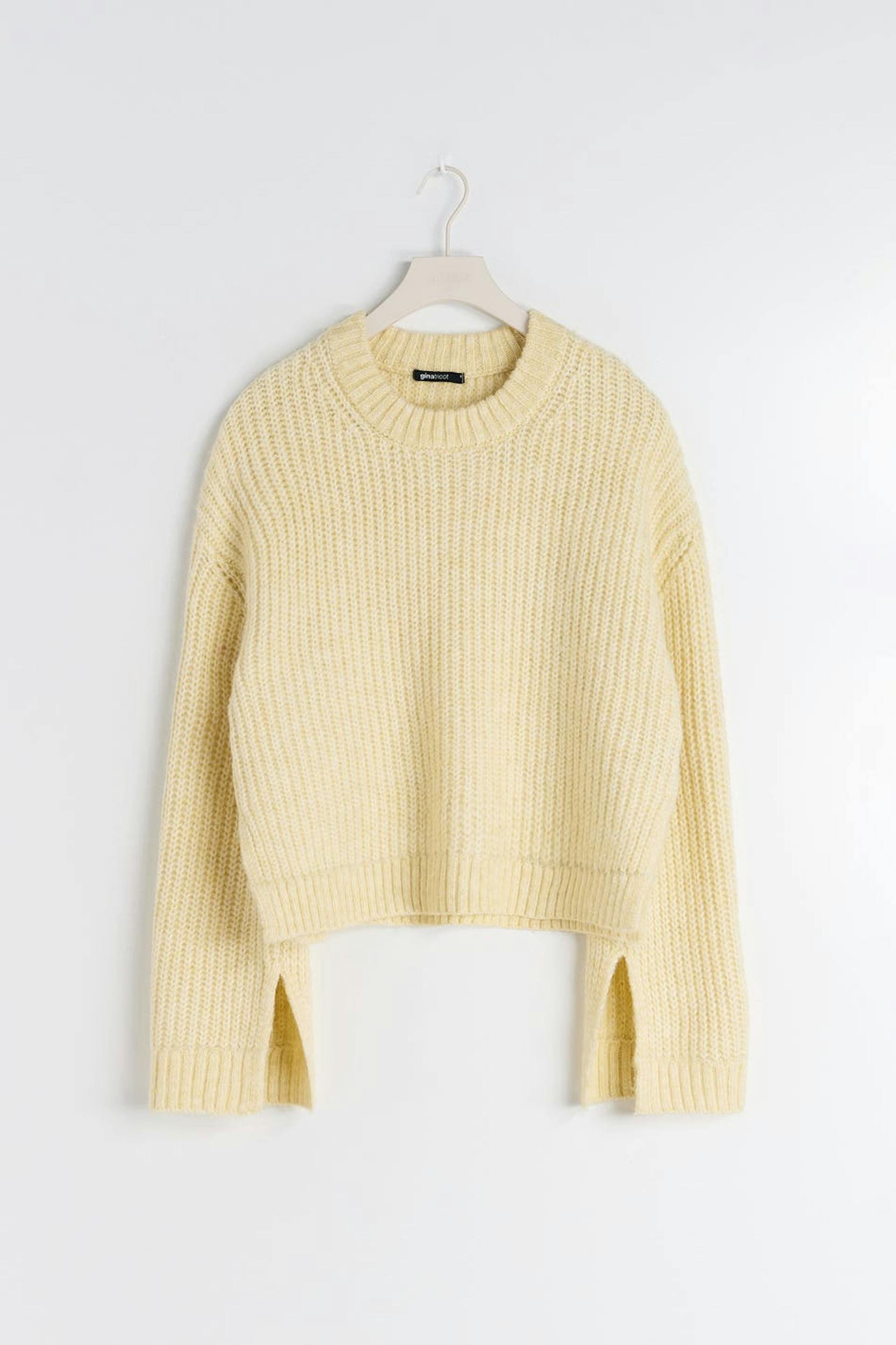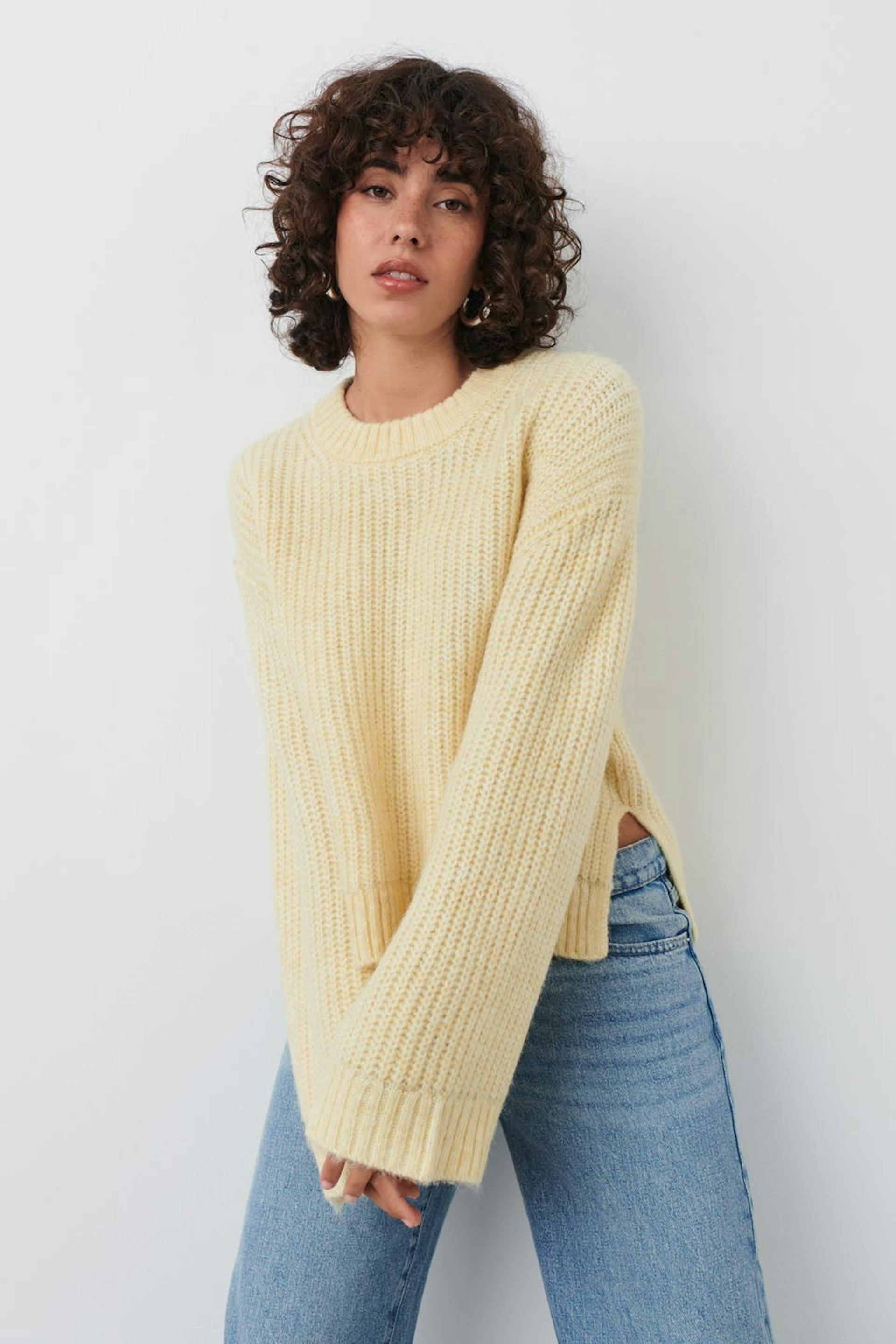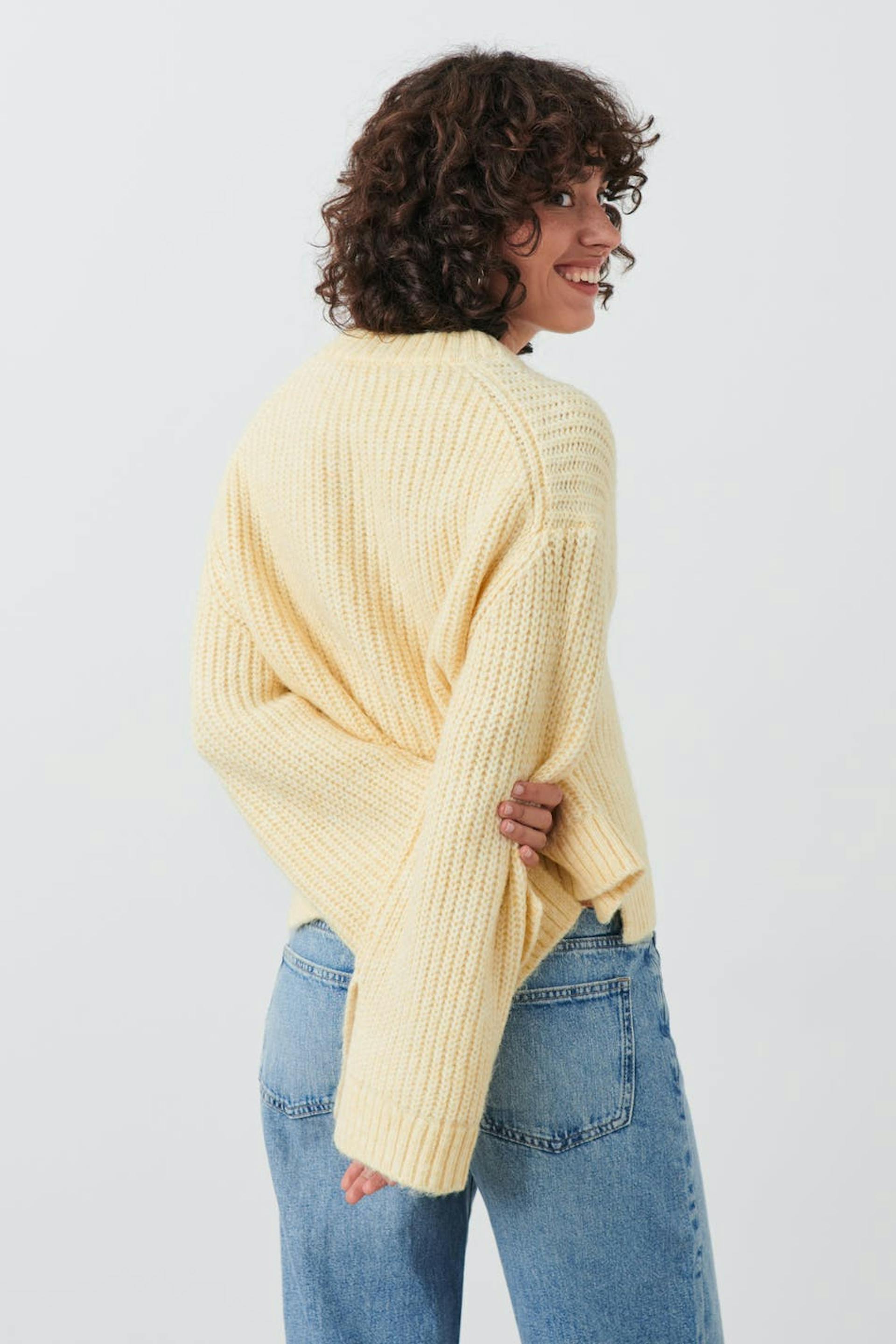 Knitted sweater with round neckline. The sweat is yellow and has boxy fit. It has straight sleeve, slit in the sides and rib knit at sleeve ends and at the bottom.