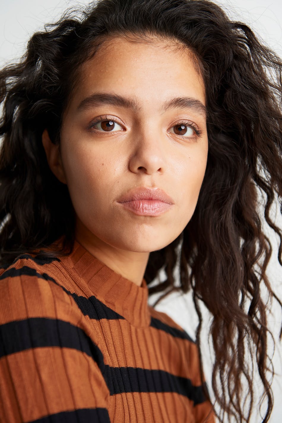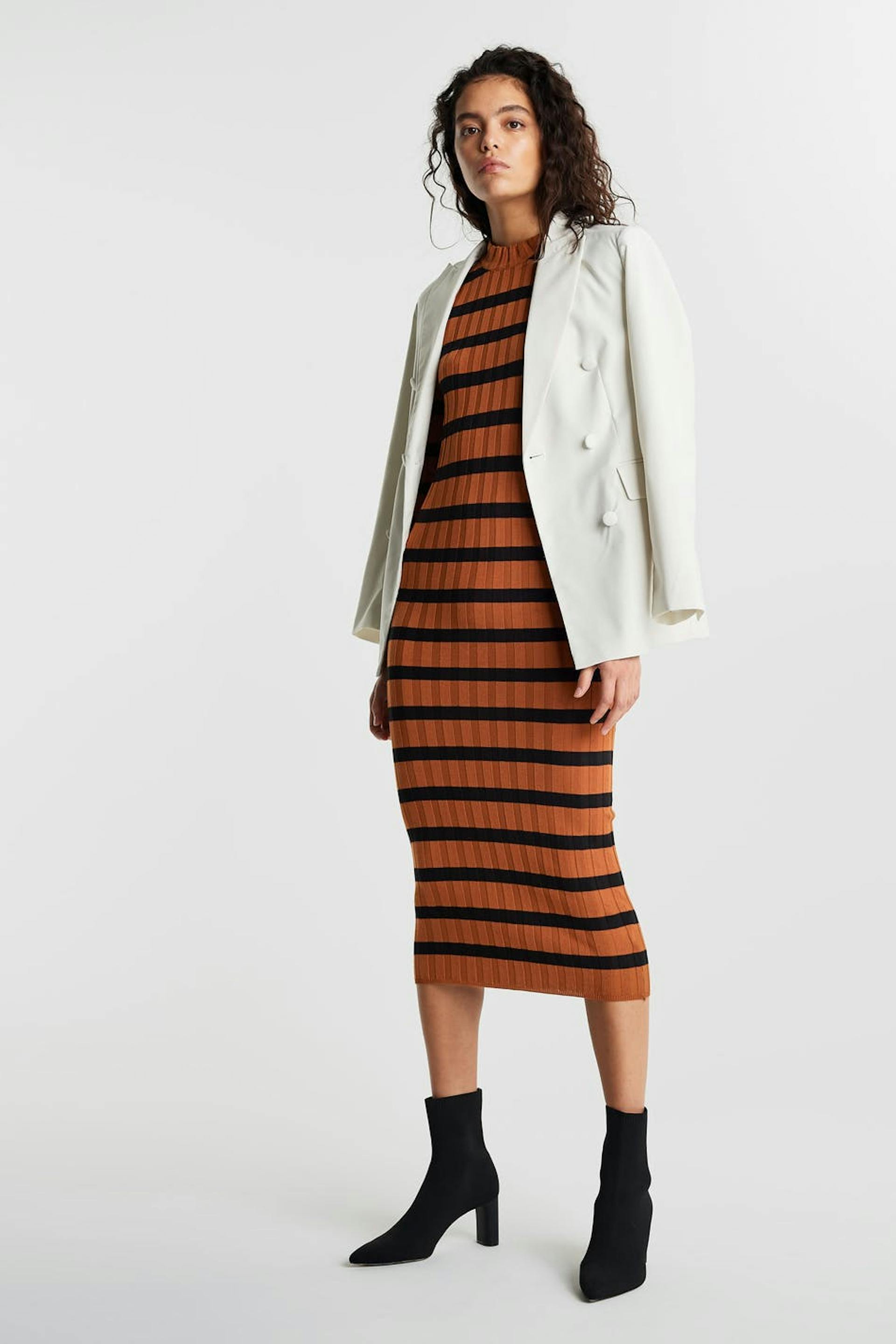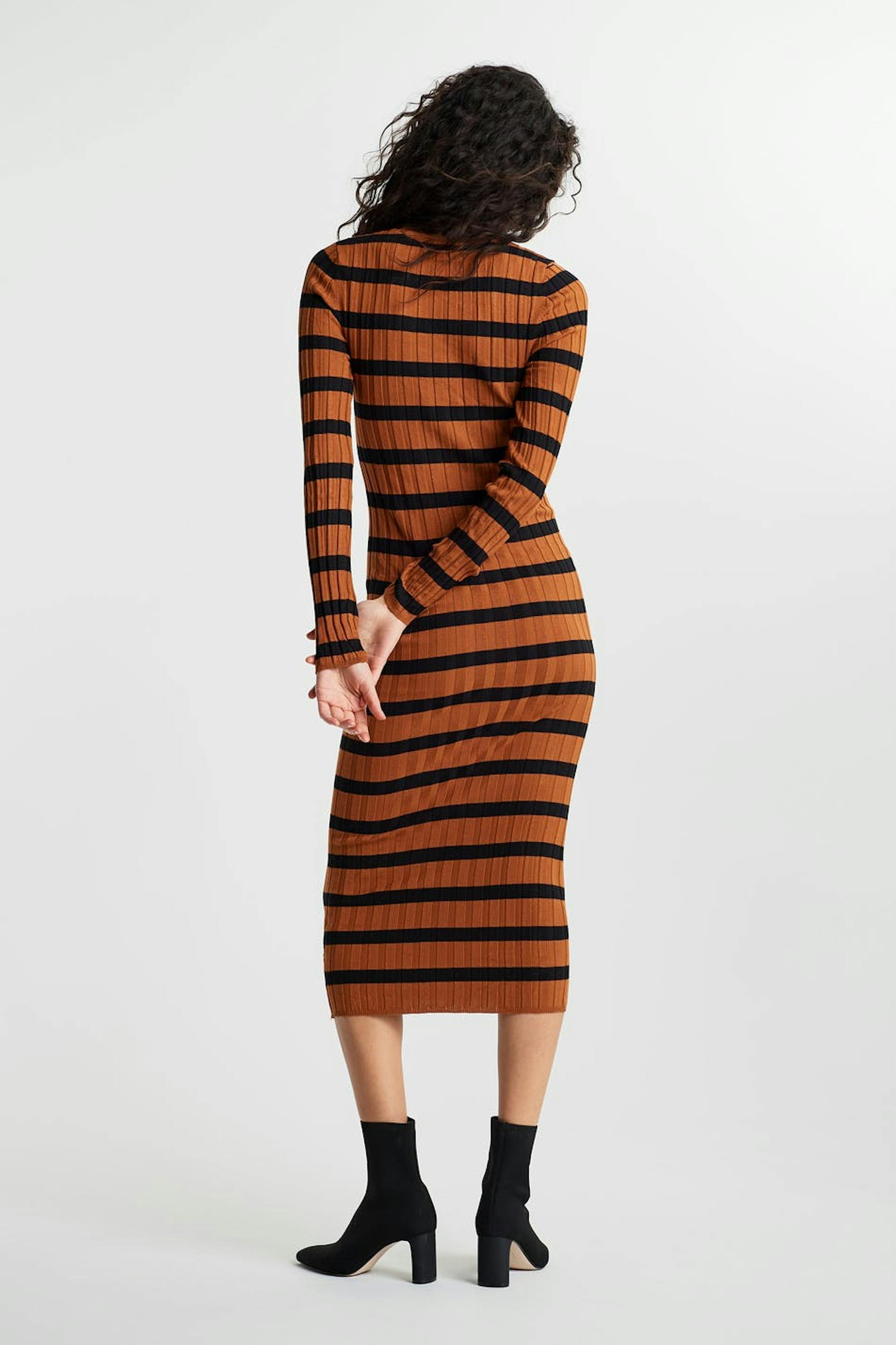 Striped dress with a fitted fit. Black, light brown, calf-length and long-sleeved. It is rib-knit and stretchy.