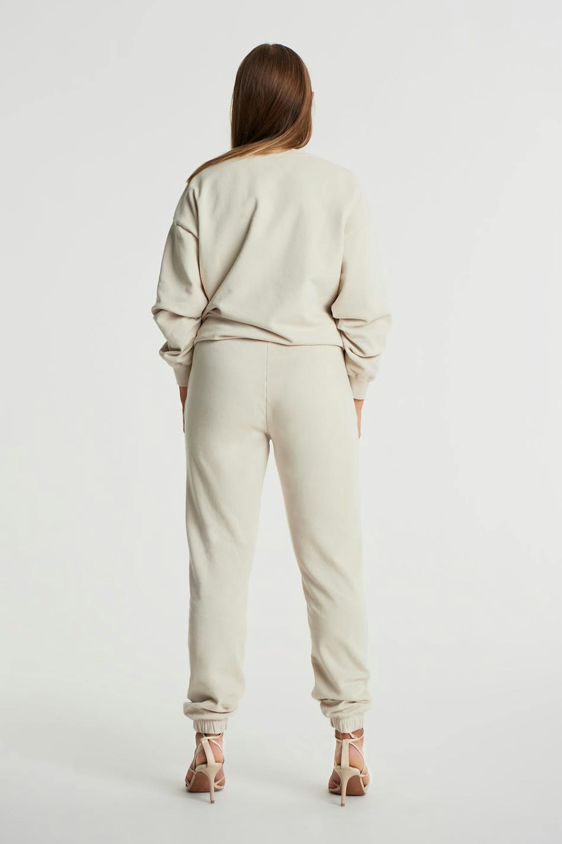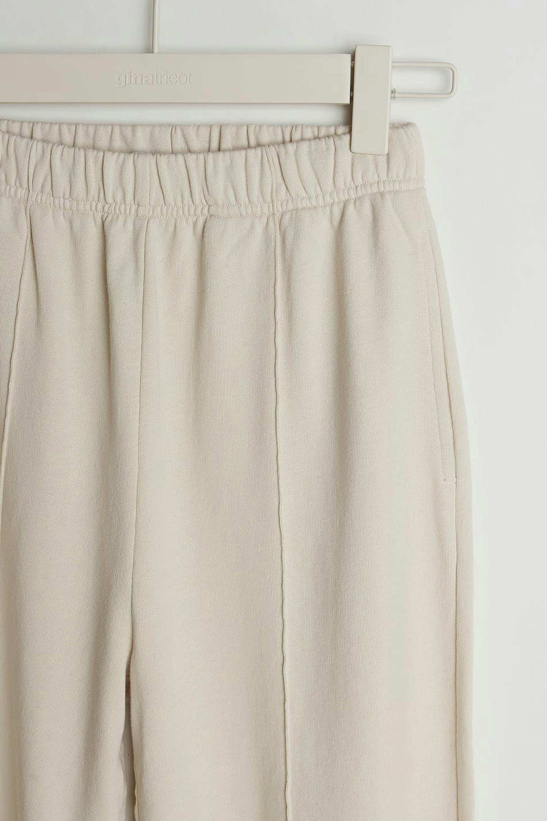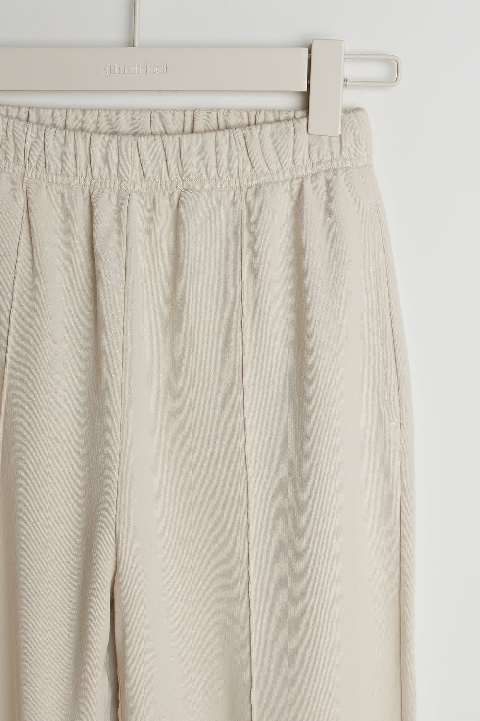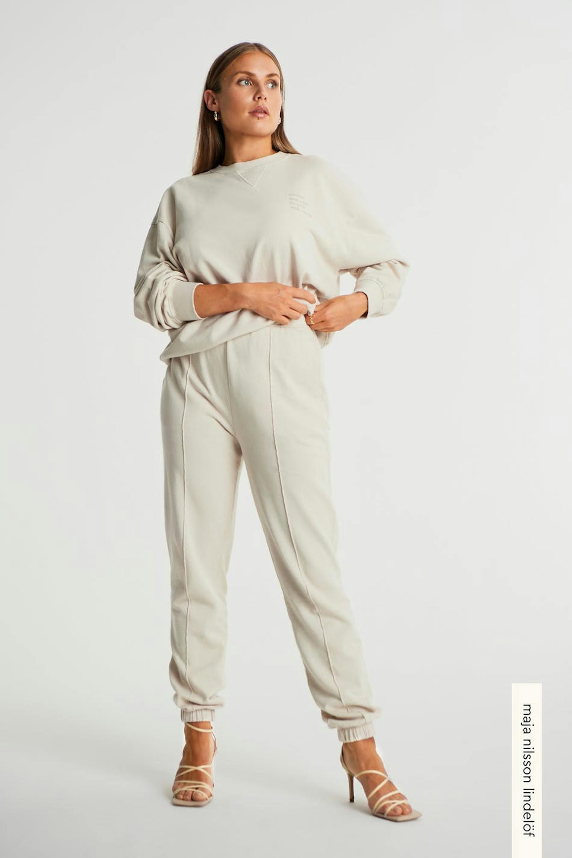 Maja X Gina tricot. Soft tracksuit trousers with a regular fit. The trousers are beige and have seam details at the front of the legs. They have an elastic band at the waist and at the end of the legs and side pockets.
