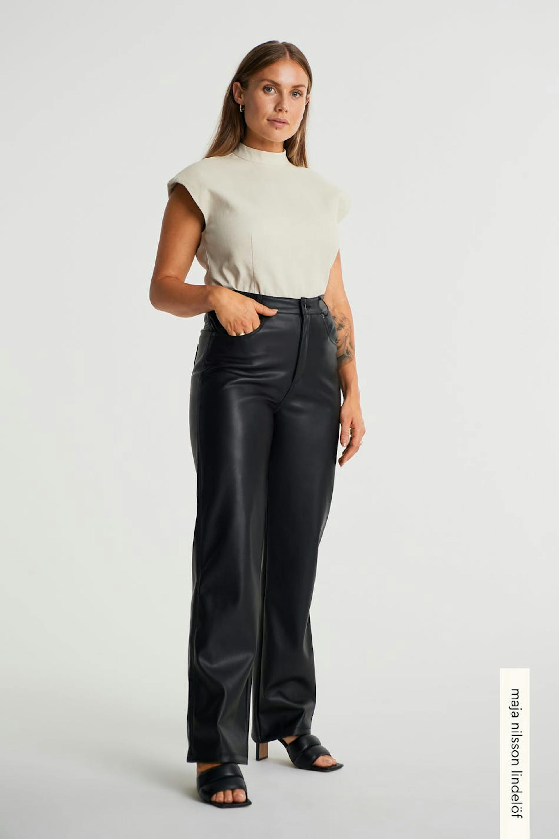 Maja X Gina tricot. Trousers with a high waist. The trousers are black and have a fitted fit. They are made of PU and have straight legs and pockets in front and at the back.