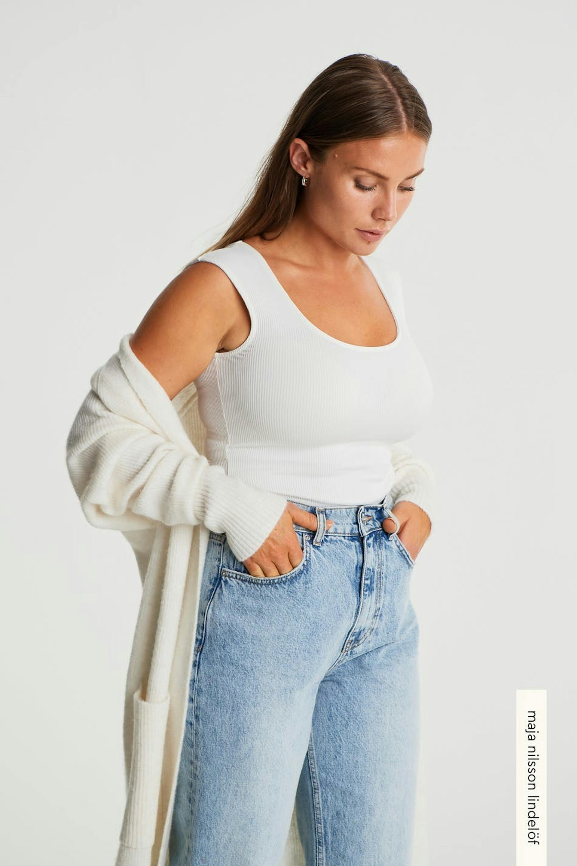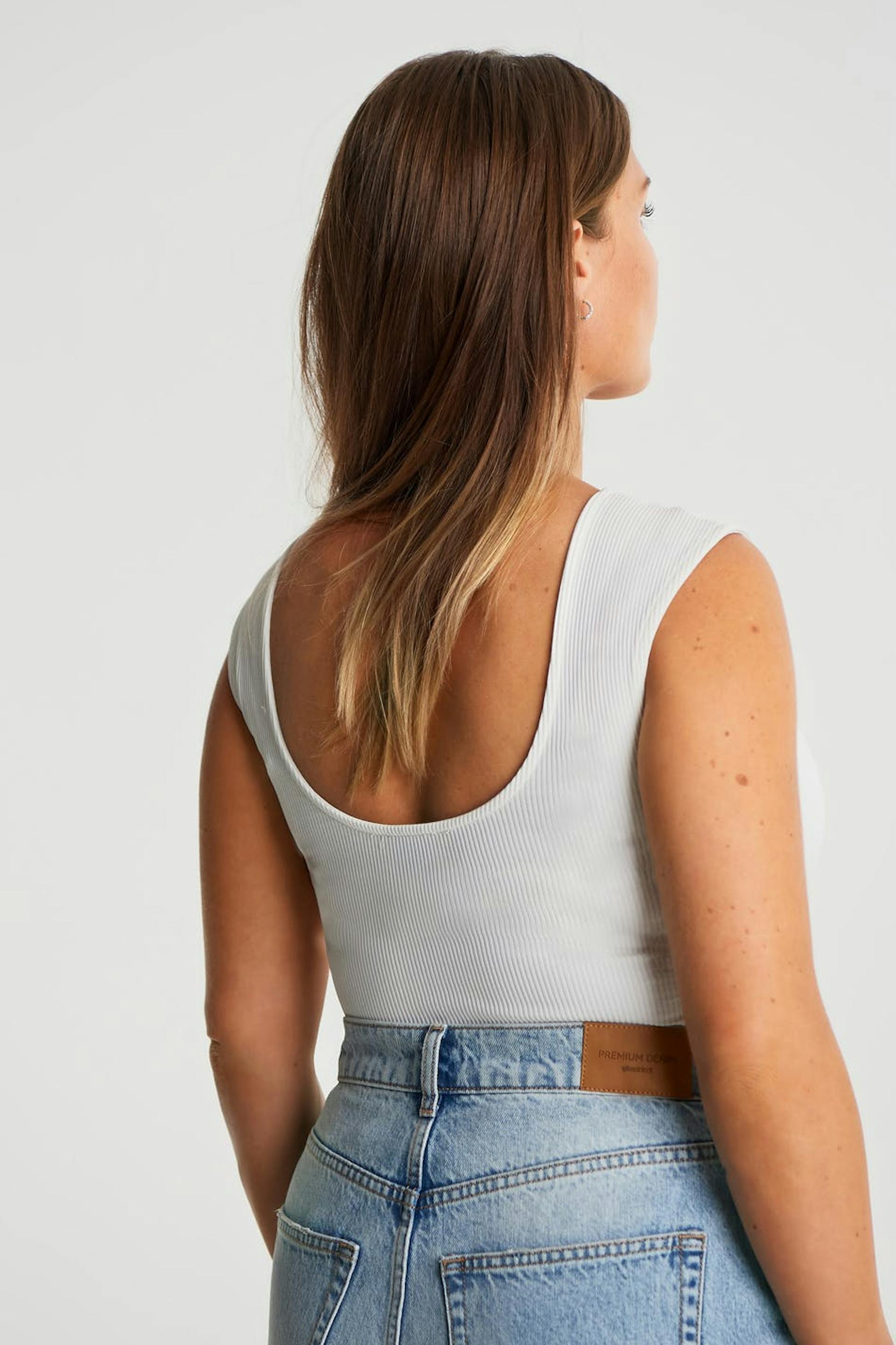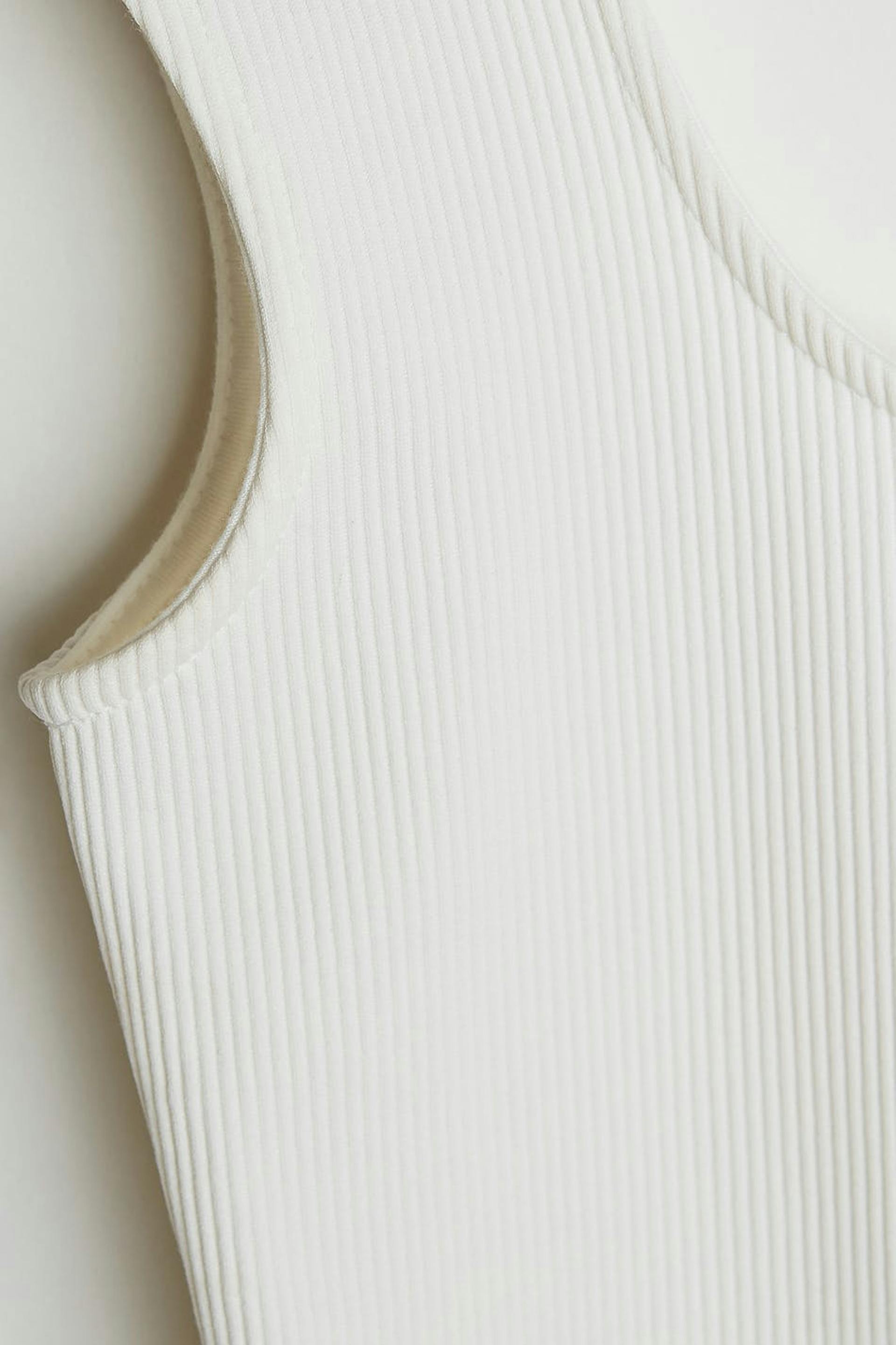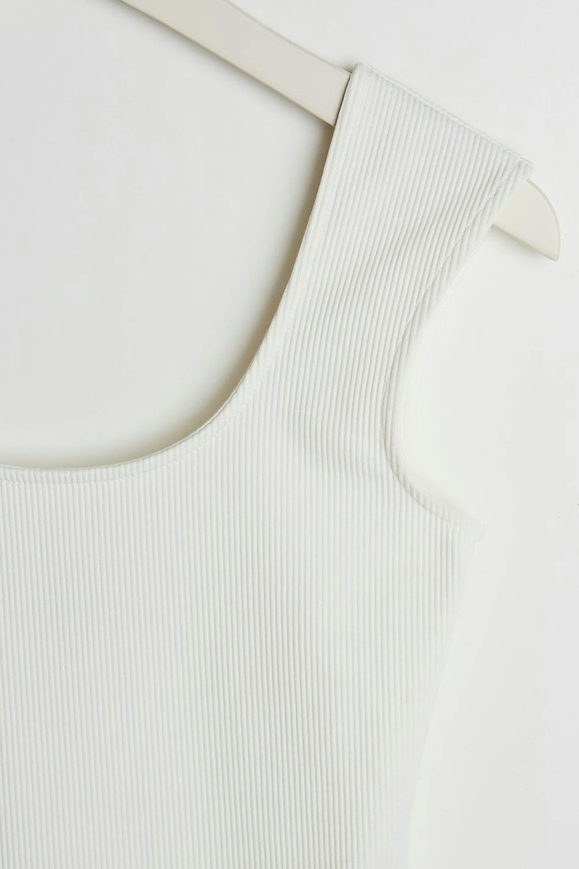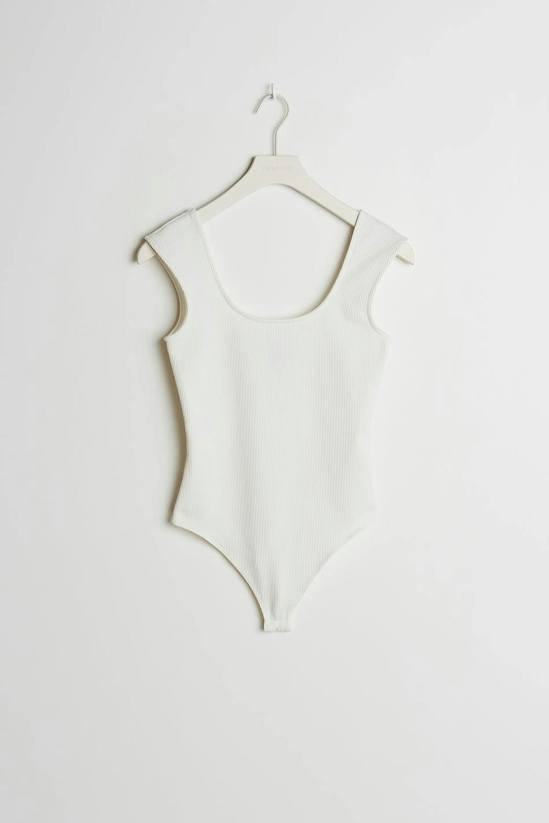Maja X Gina tricot. Soft body with a fitted fit. White, stretchy, ribbed and sleeveless. It has a button placket between the legs and a thong design.