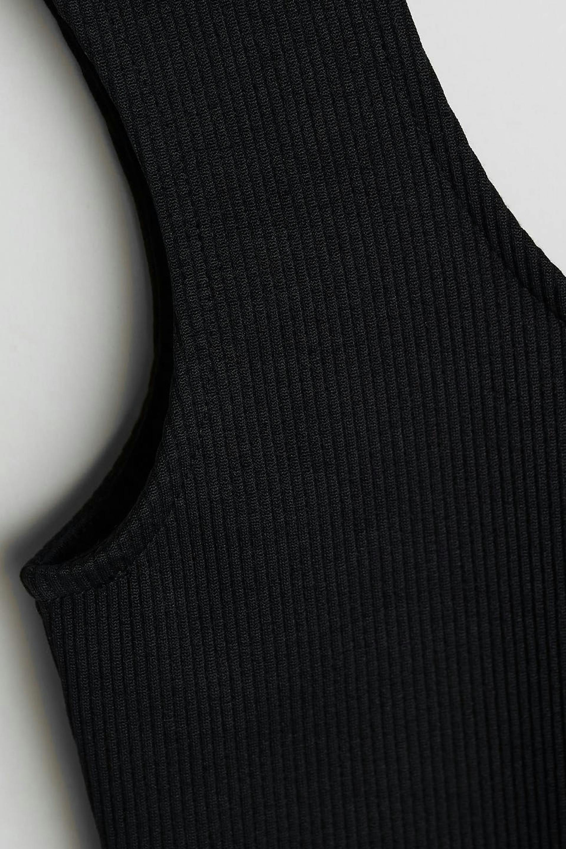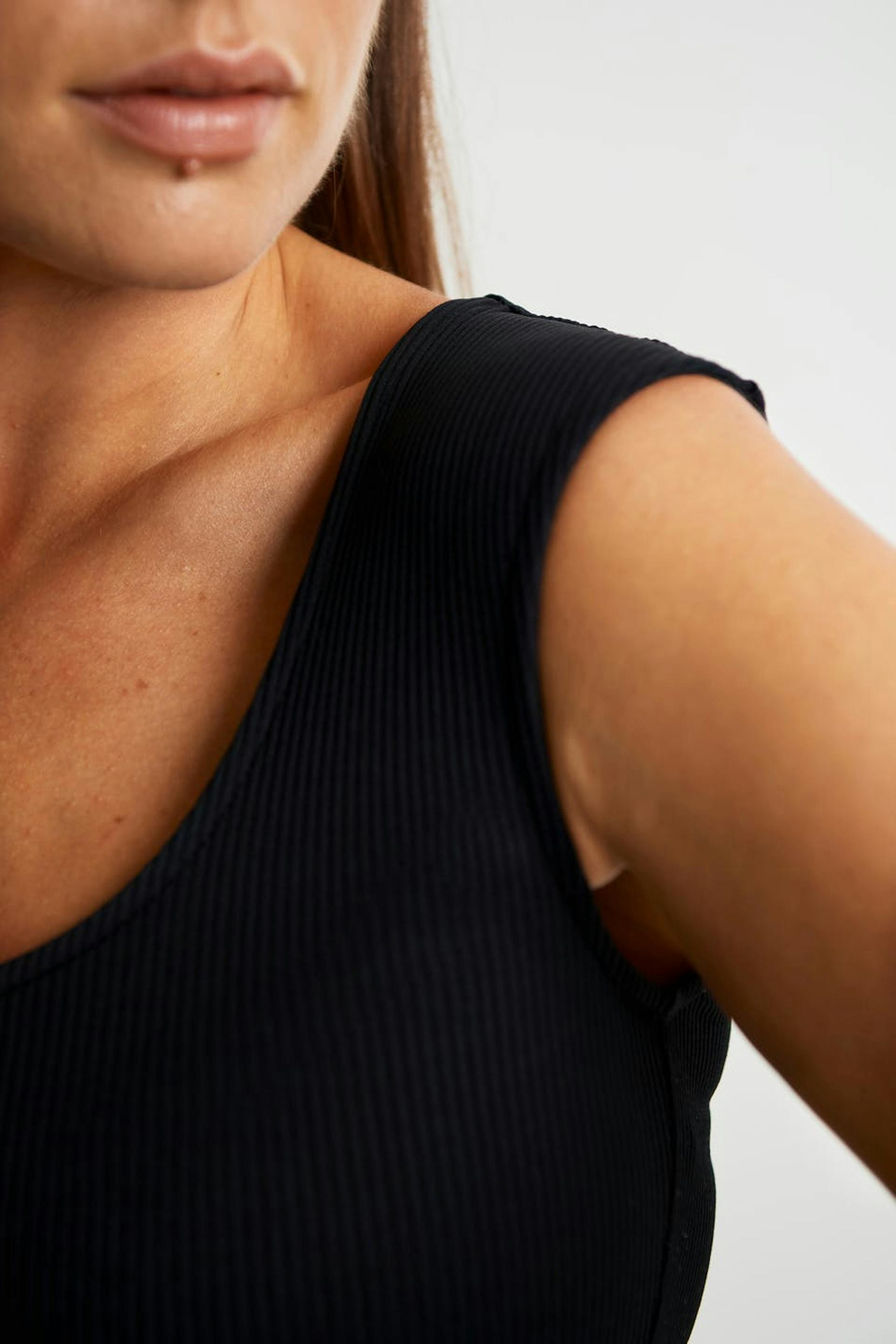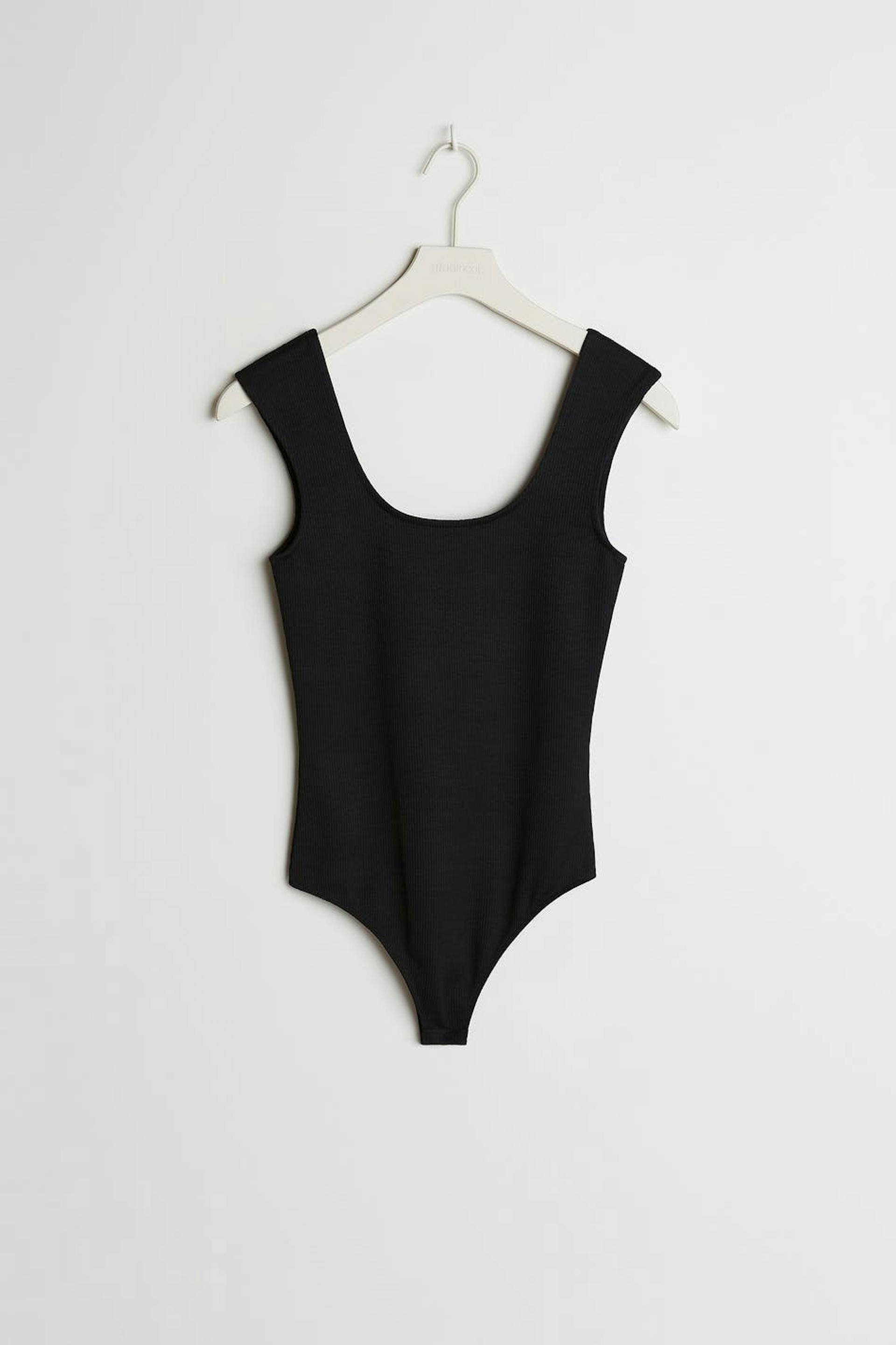 Maja X Gina tricot. Soft body with a fitted fit. Black, stretchy, ribbed and sleeveless. It has a button placket between the legs and a thong design.