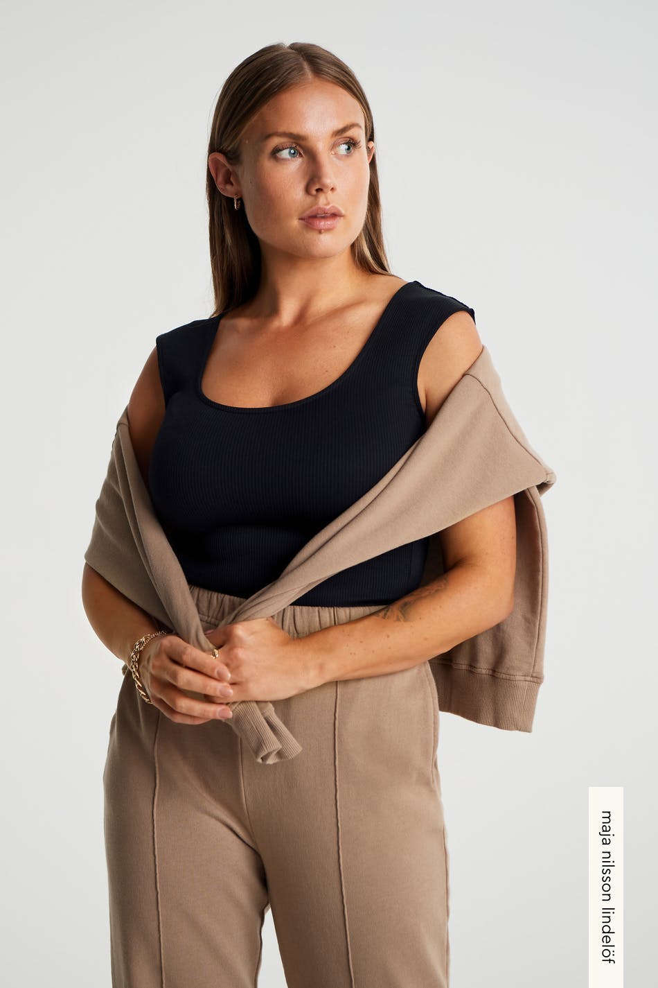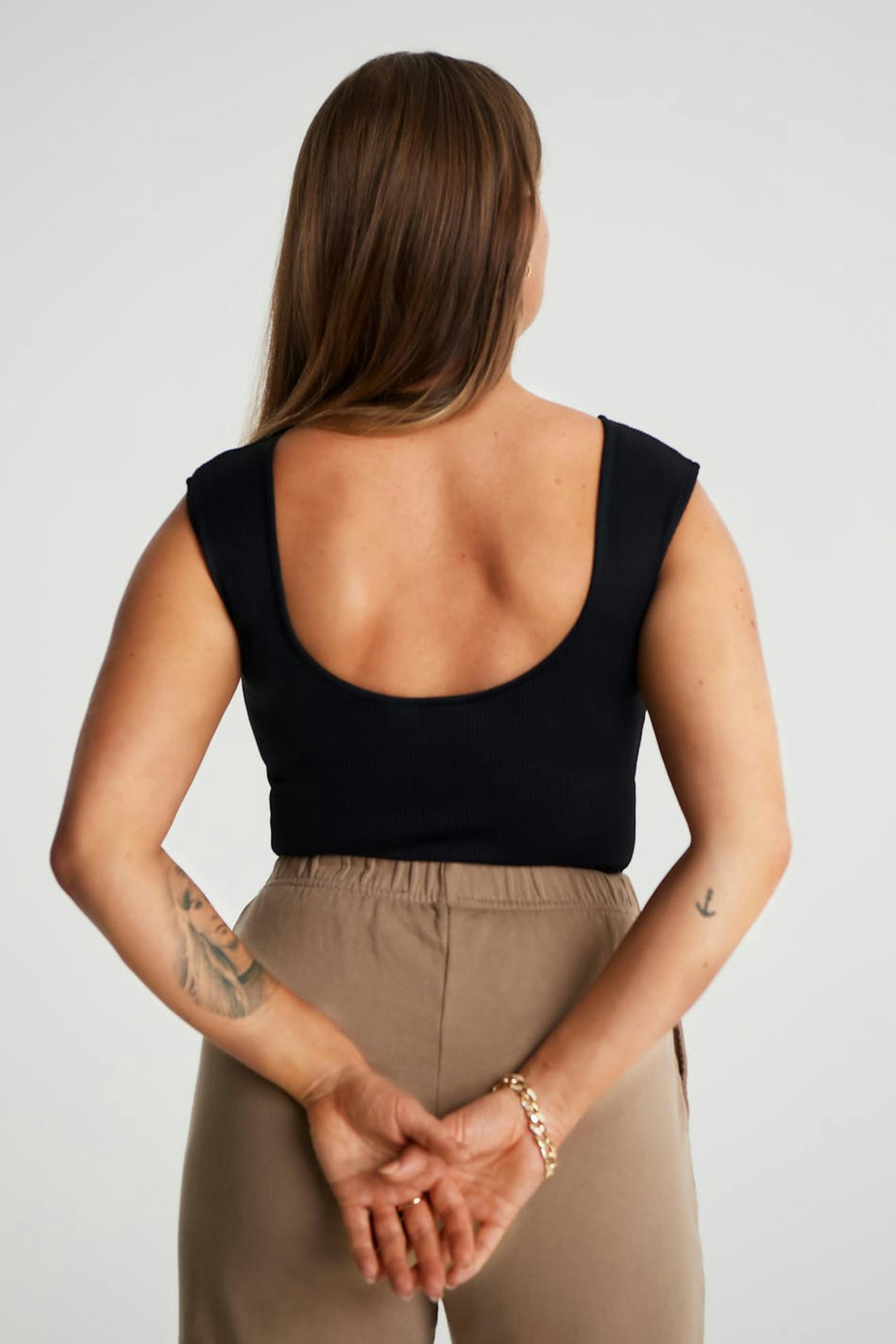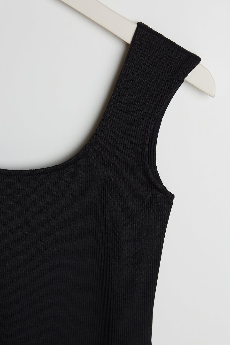 Maja X Gina tricot. Soft body with a fitted fit. Black, stretchy, ribbed and sleeveless. It has a button placket between the legs and a thong design.