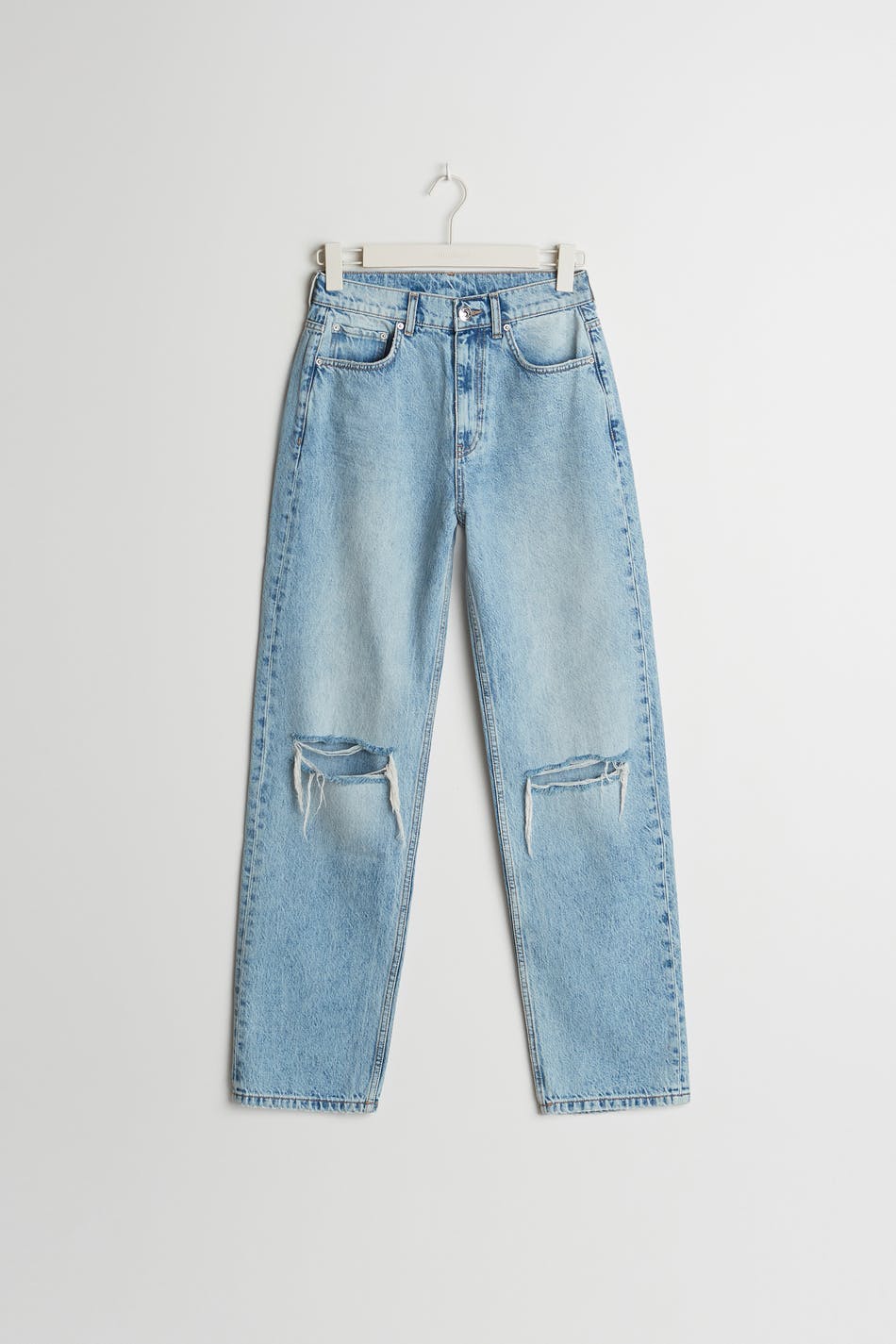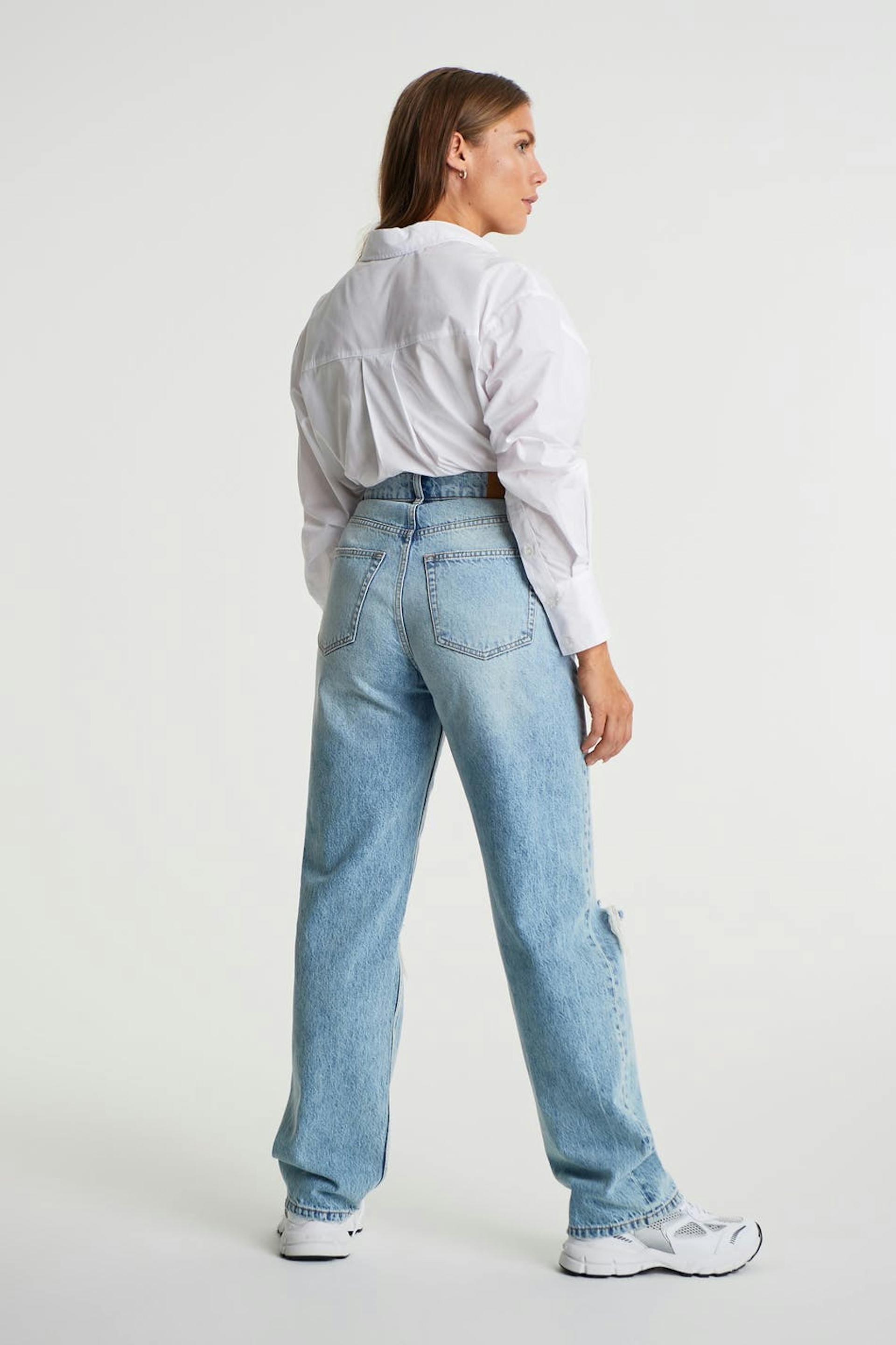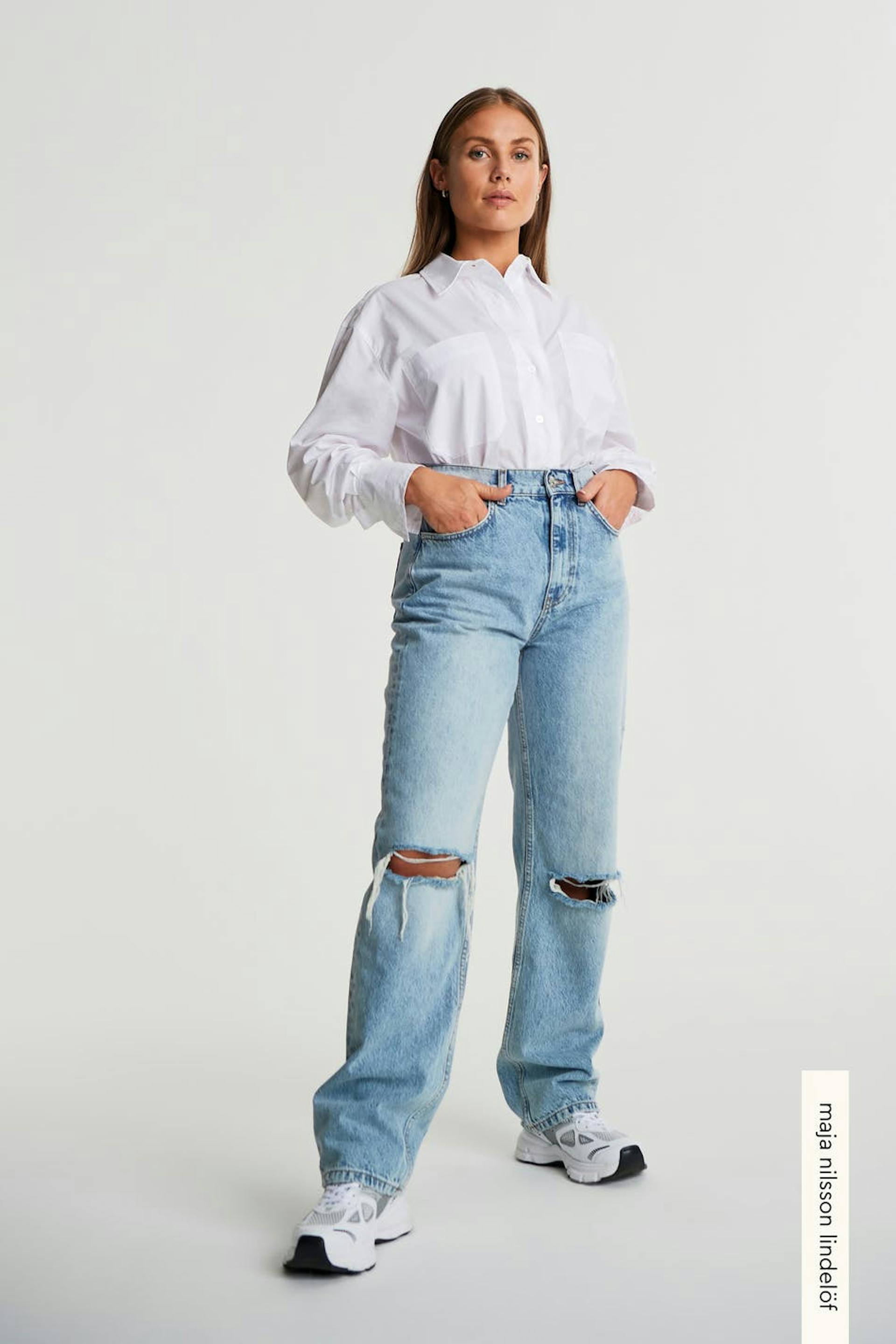 Maja X Gina tricot. Highwaist jeans with distressed knees. The jeans is blue and has a 90s inspired, straight fit. It is made of denim.
