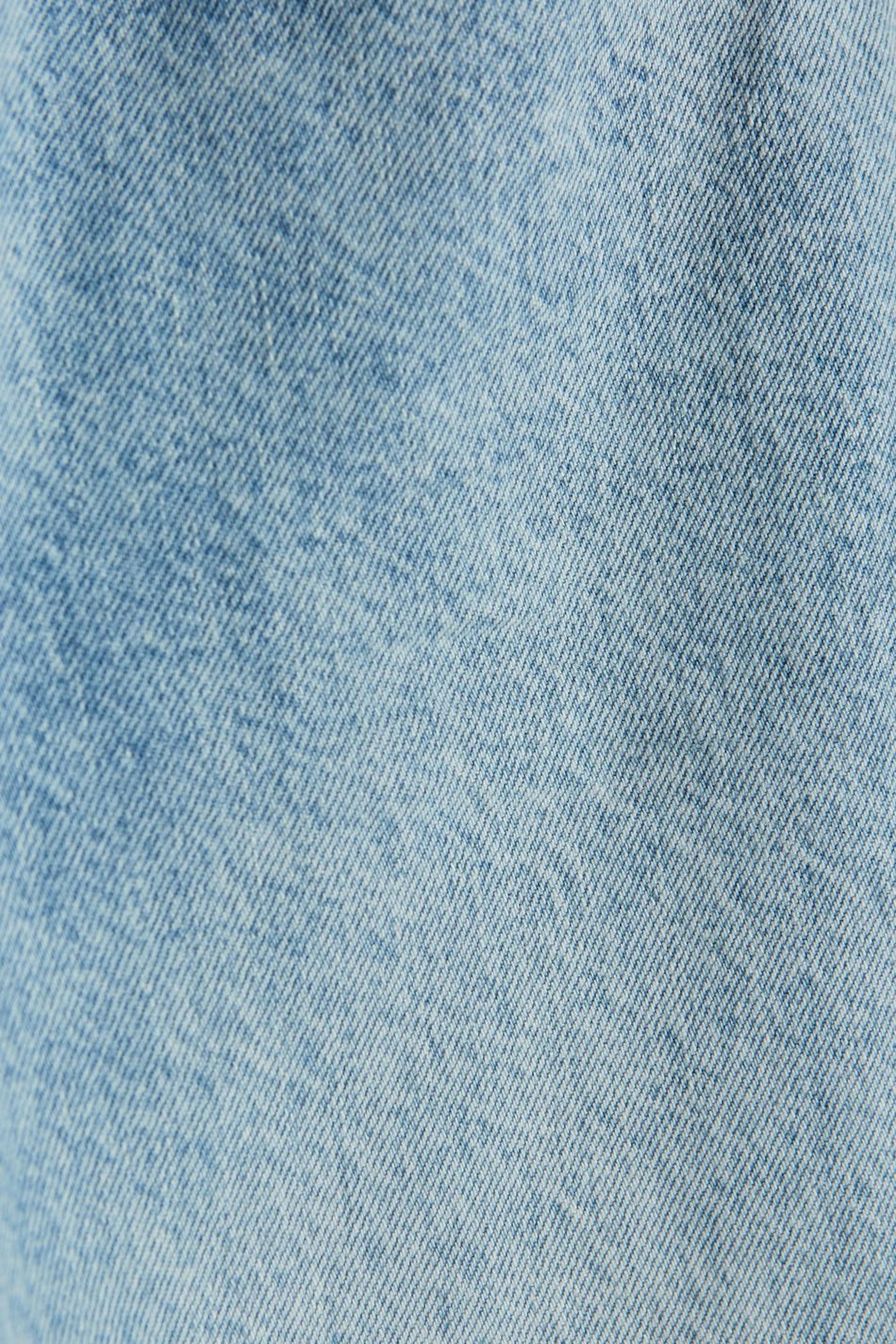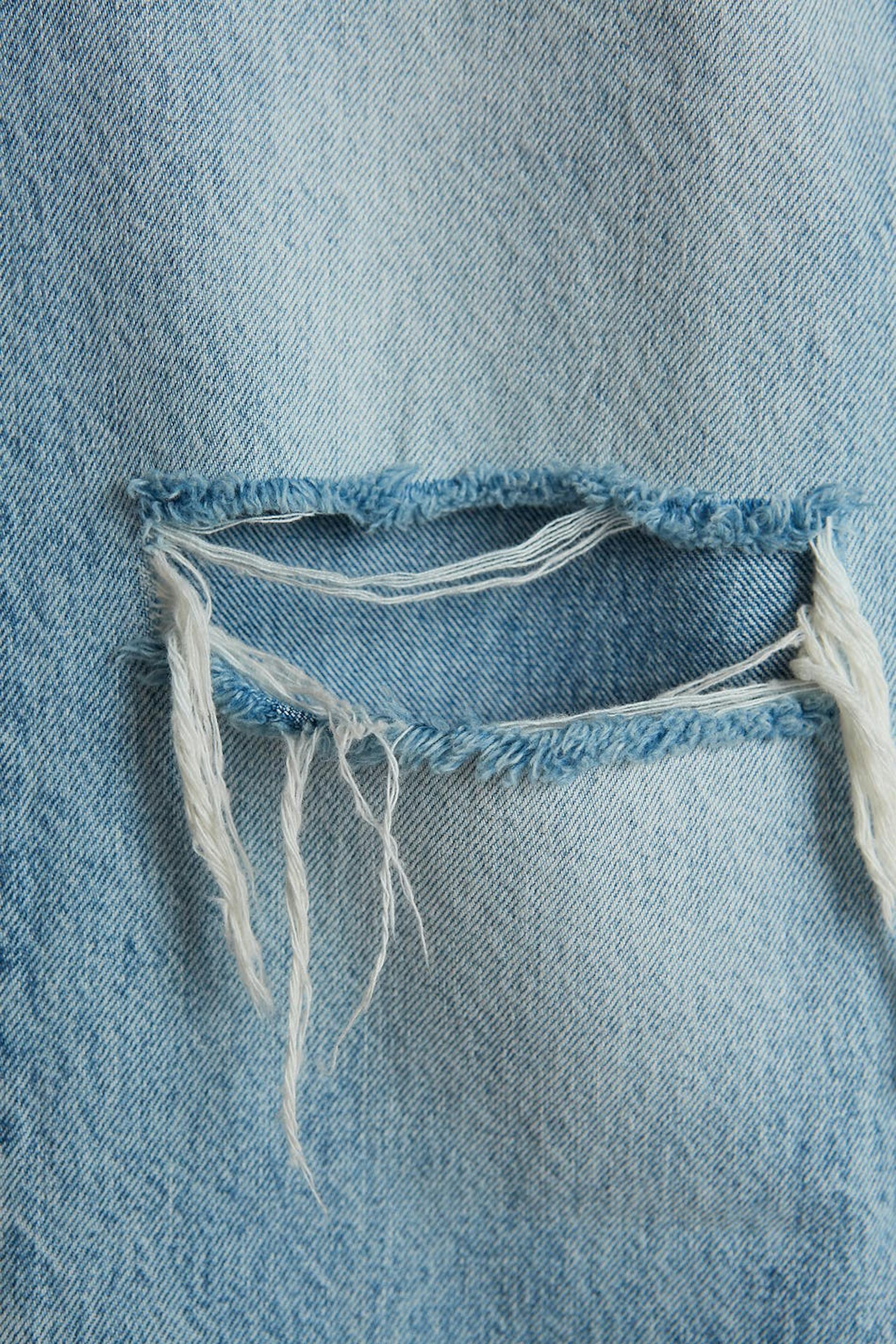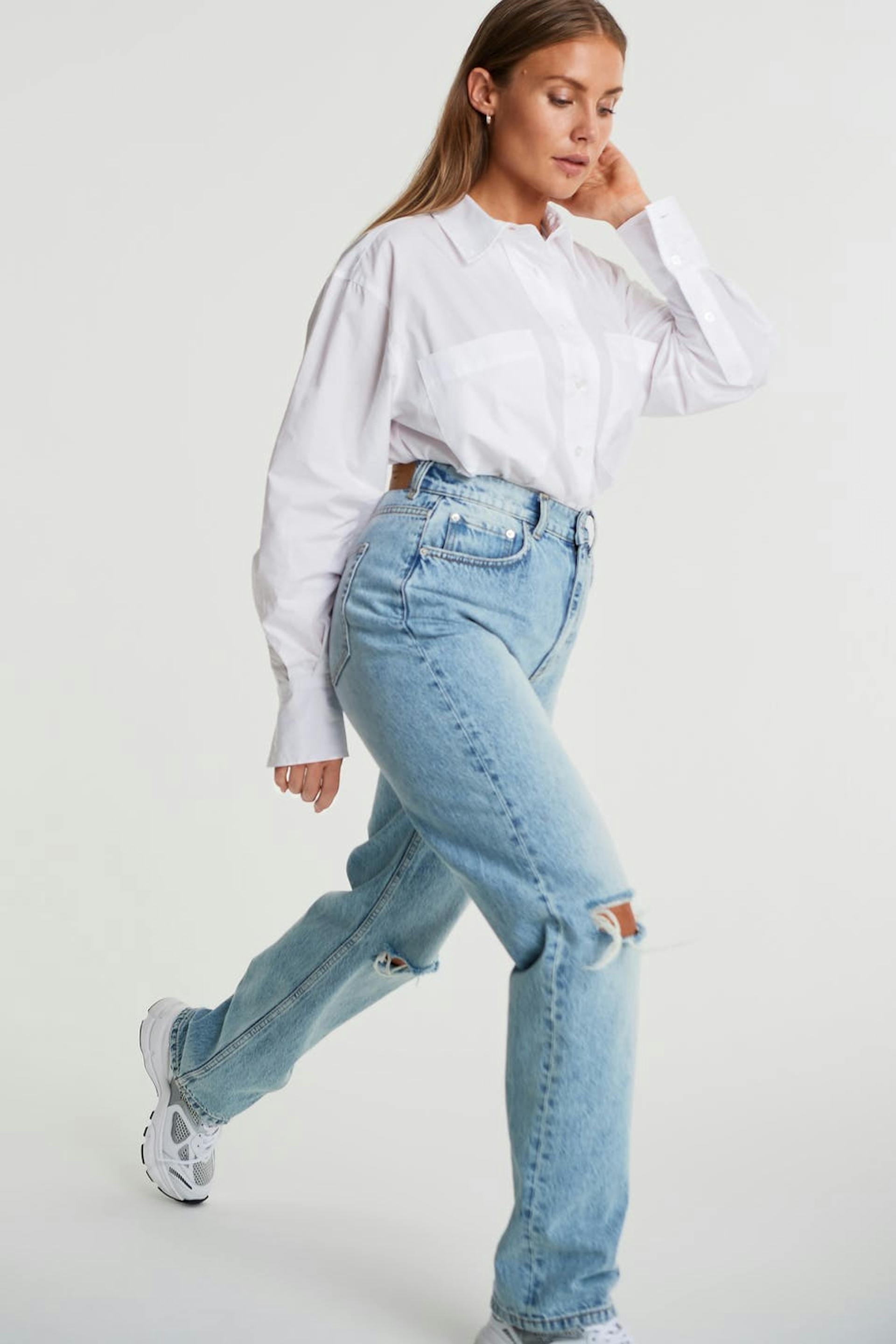 Maja X Gina tricot. Highwaist jeans with distressed knees. The jeans is blue and has a 90s inspired, straight fit. It is made of denim.