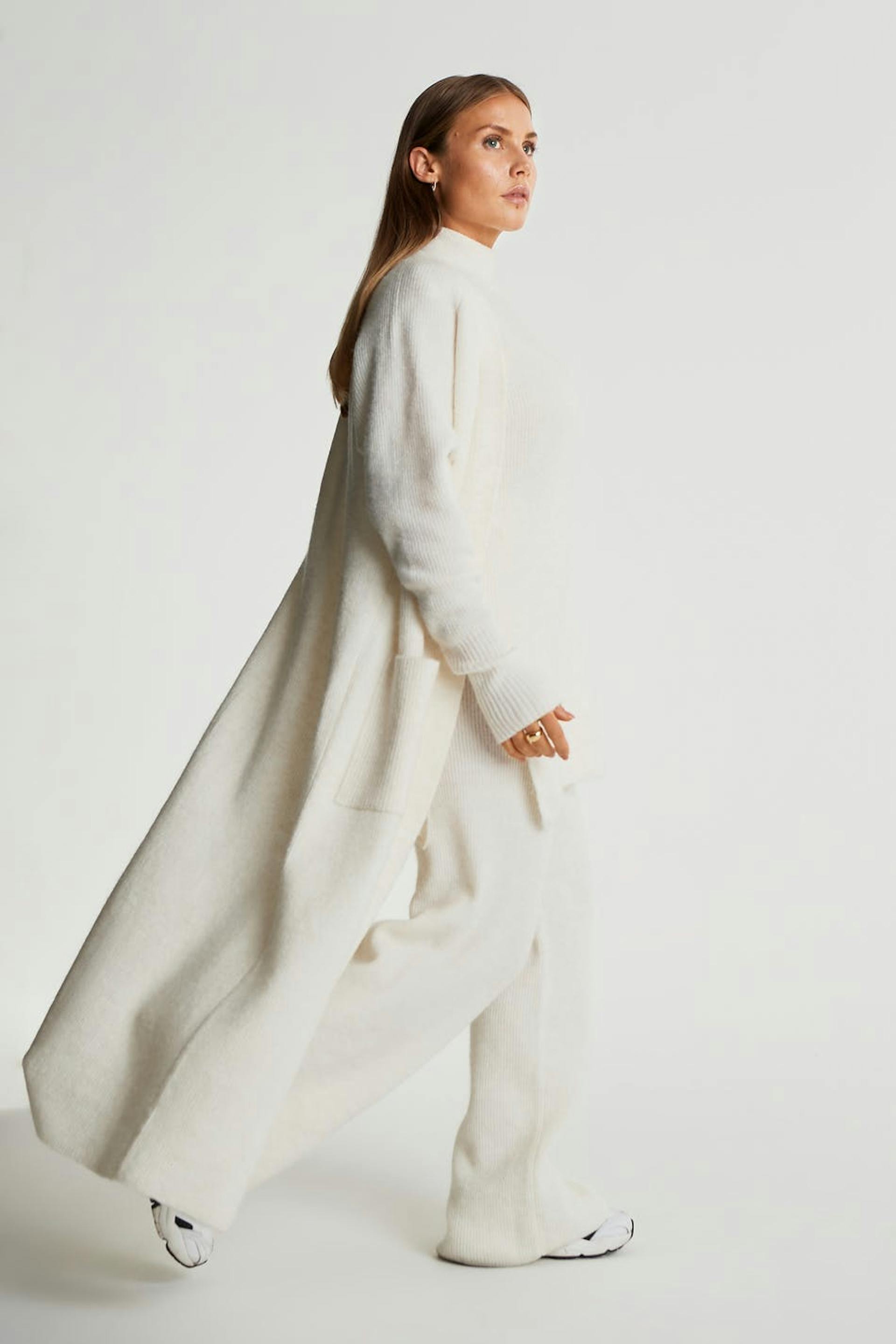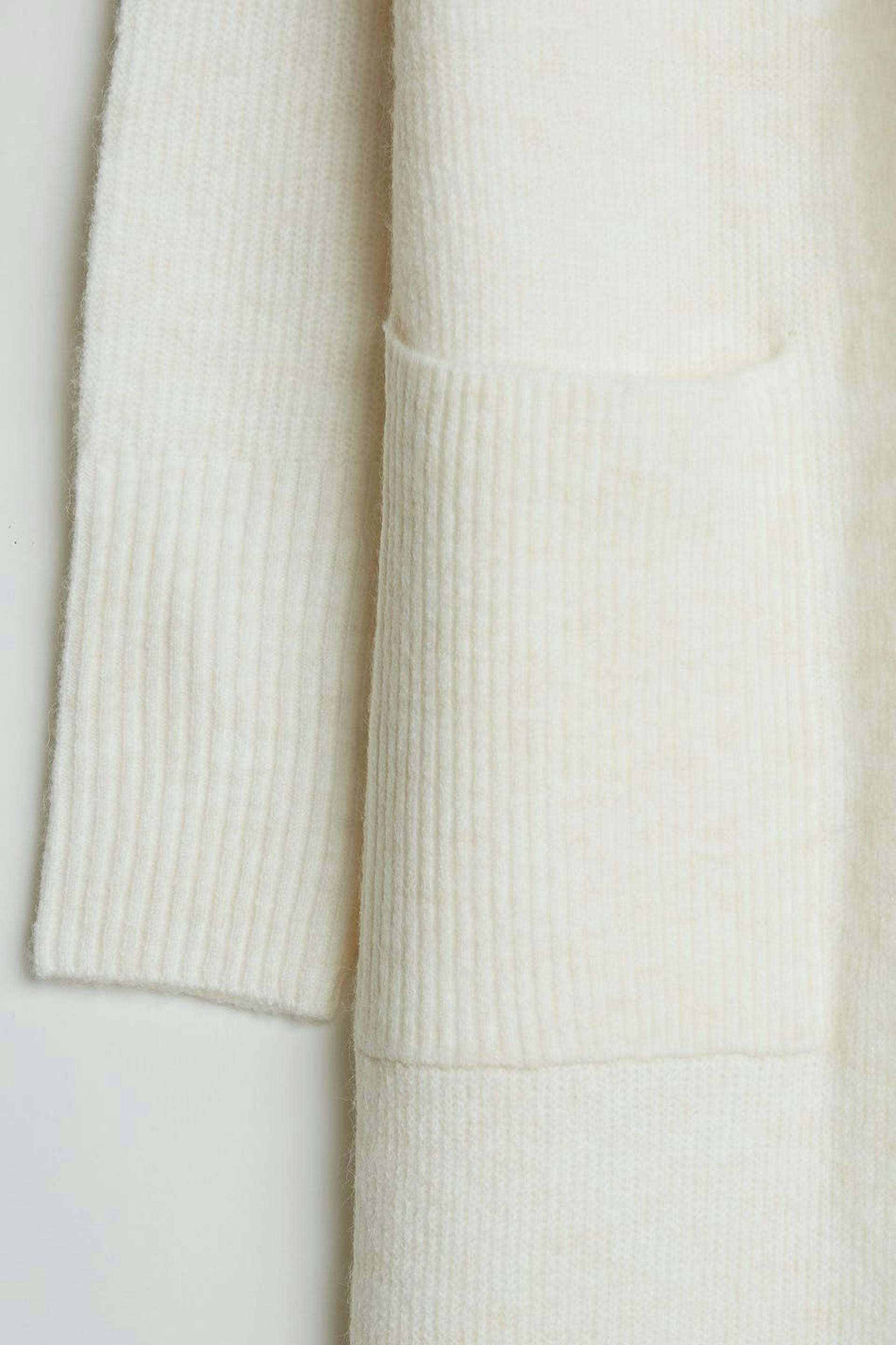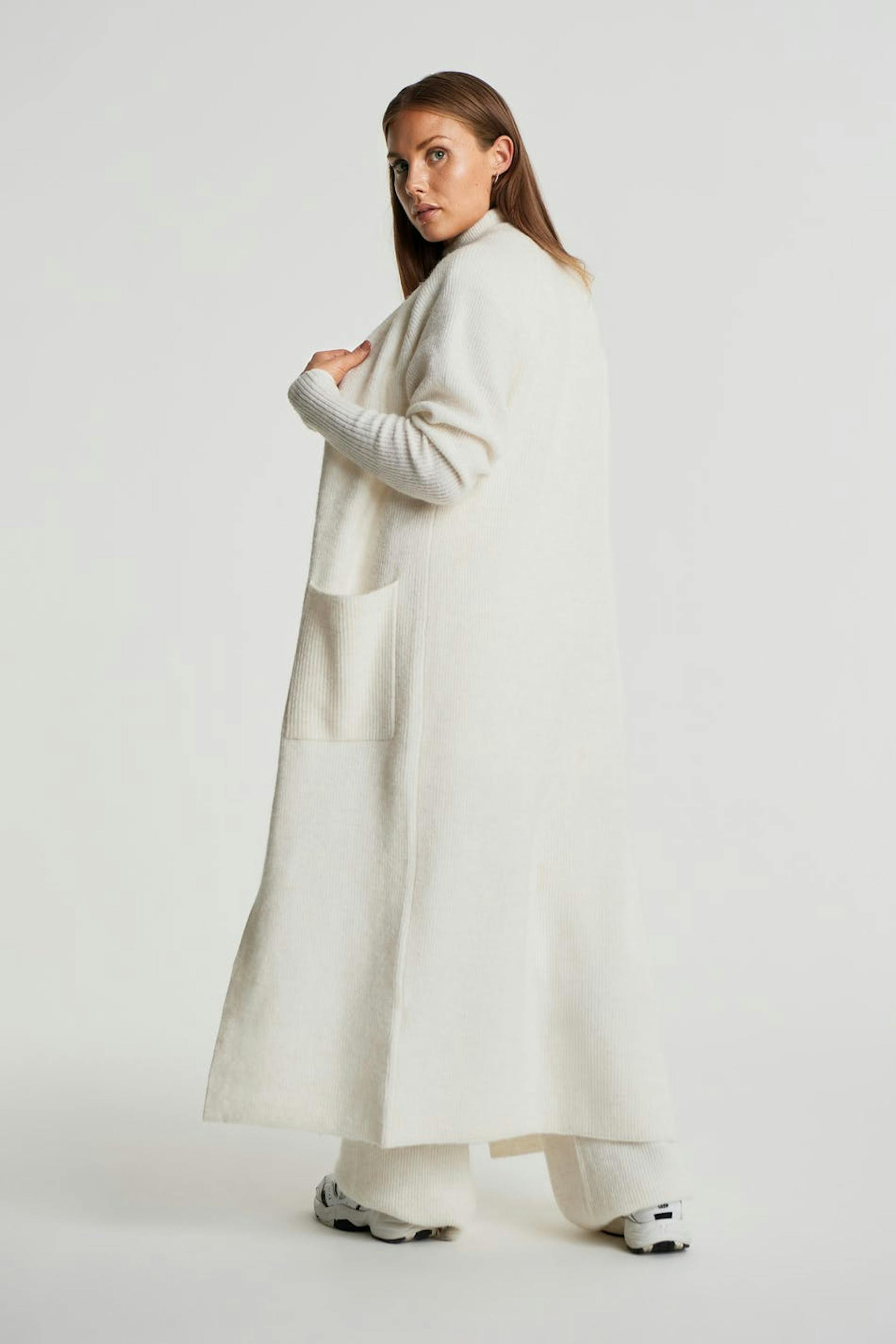 Maja X Gina tricot. Long cardigan with an opening at the front. The cardigan is white and has big pockets. It has raglan sleeves with ribbed cuff and a small slit on the sides.