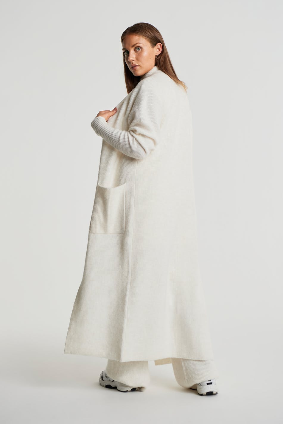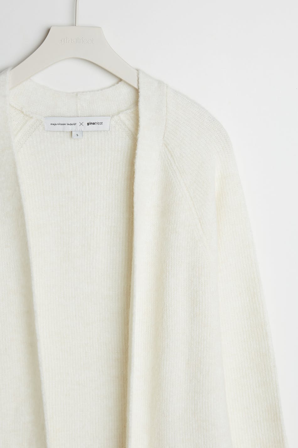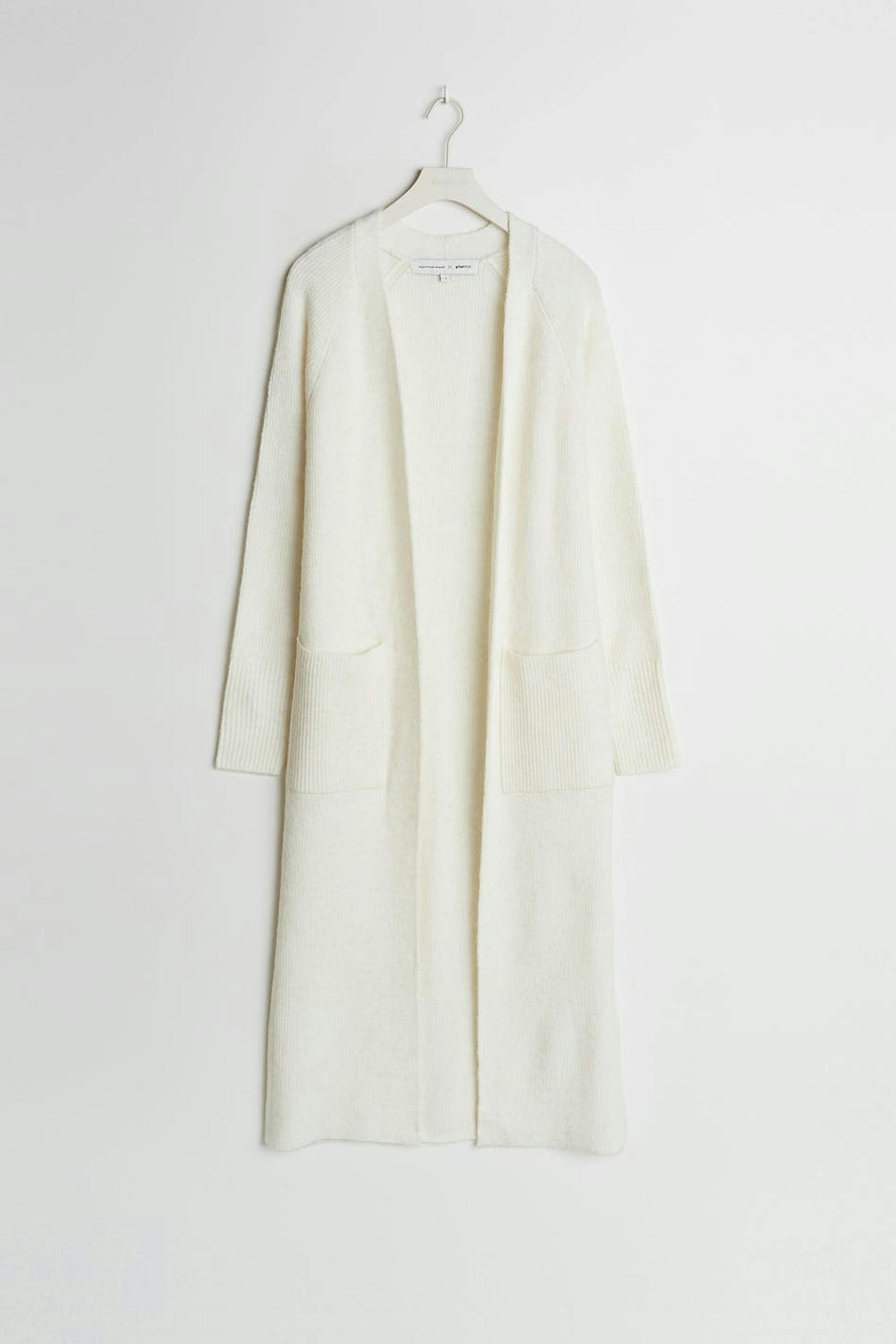 Maja X Gina tricot. Long cardigan with an opening at the front. The cardigan is white and has big pockets. It has raglan sleeves with ribbed cuff and a small slit on the sides.