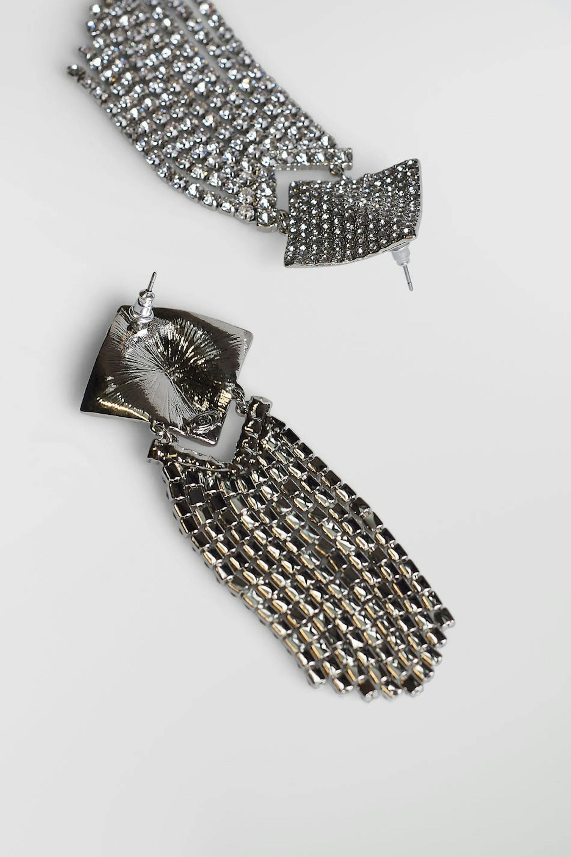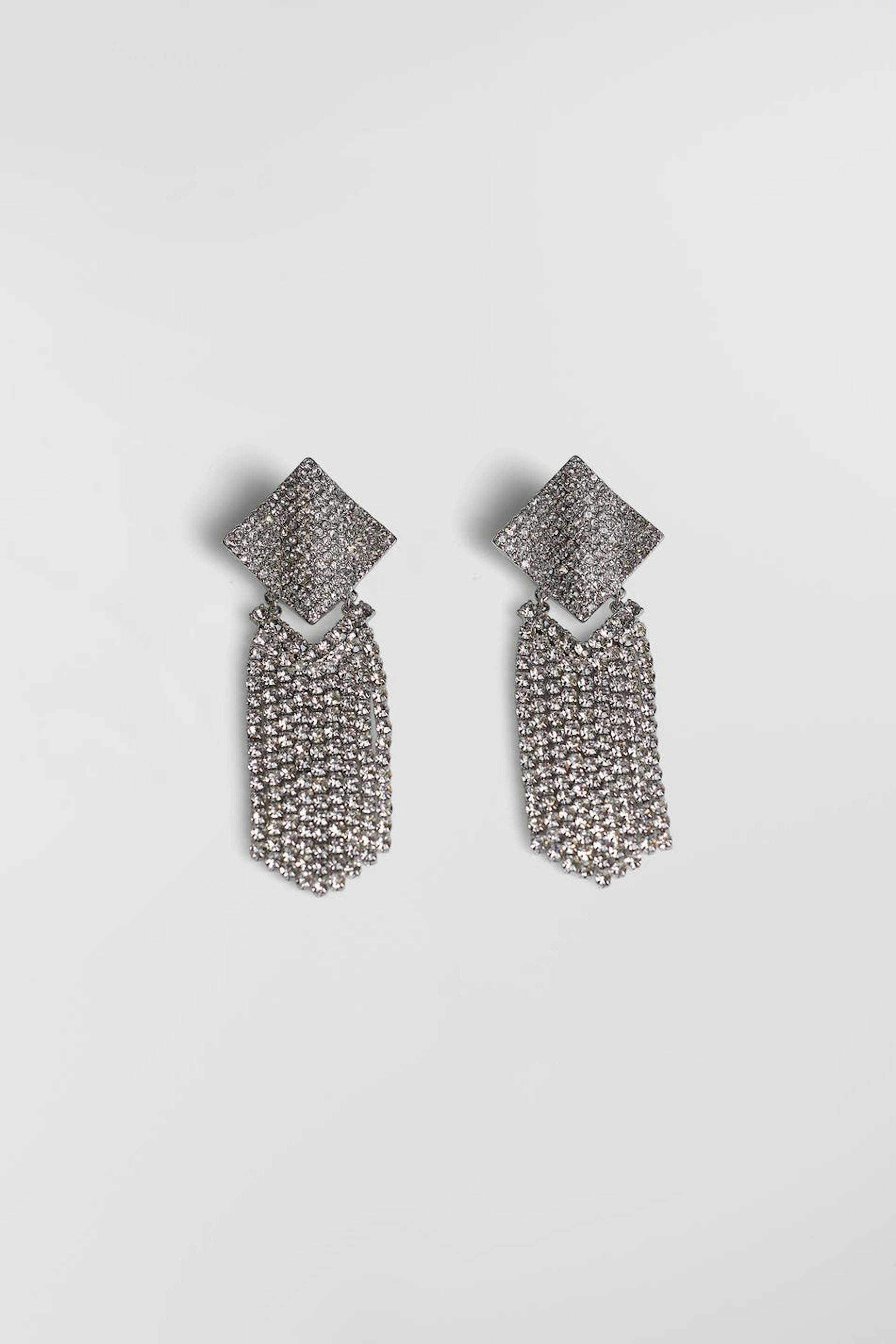 Designed by Emili Sindlev.. Light weight earrings with a squared part with dangles with rhinestone. The earrings are silver coloured.