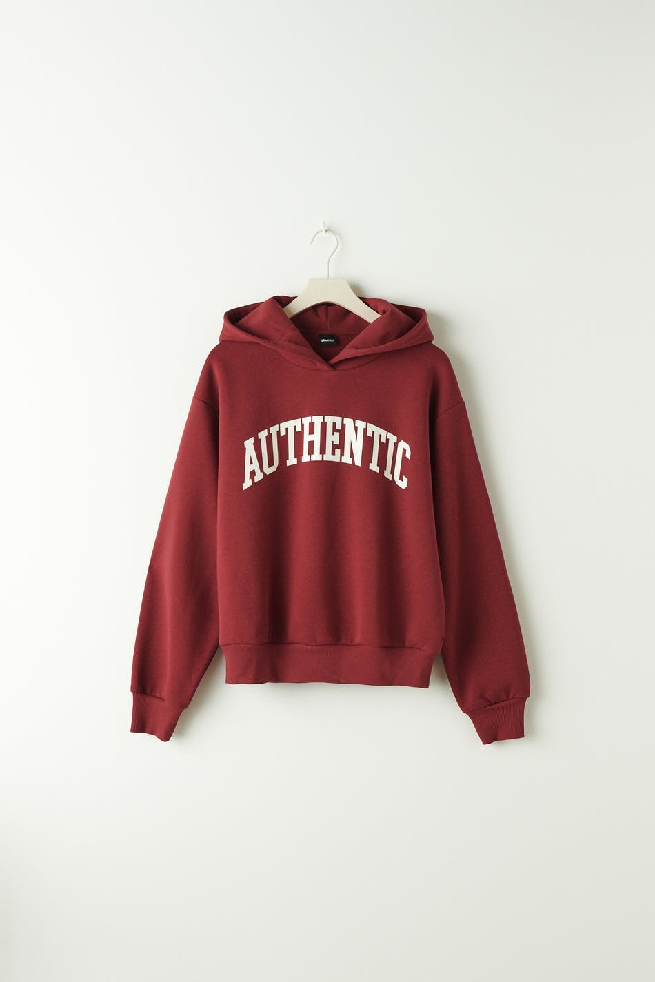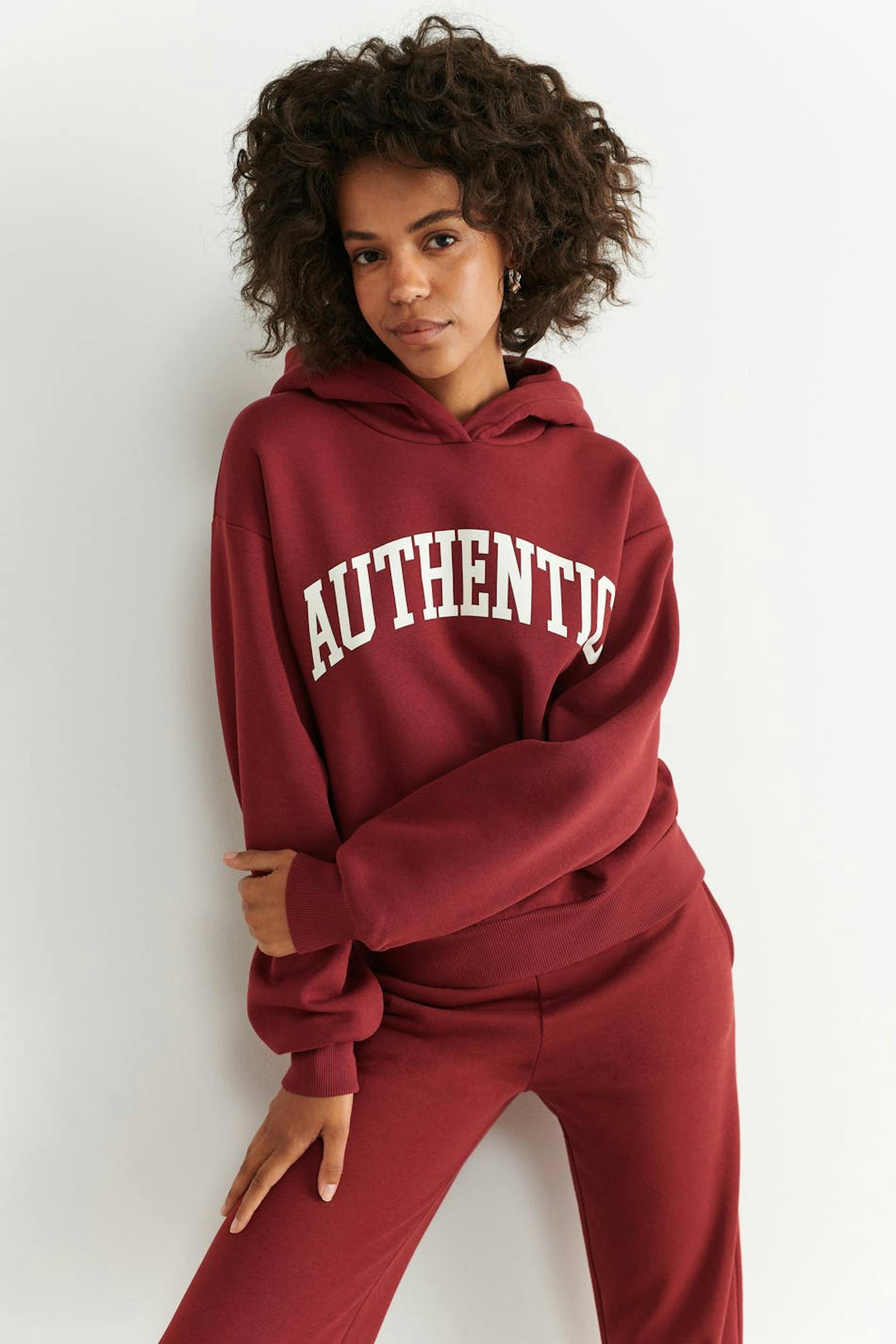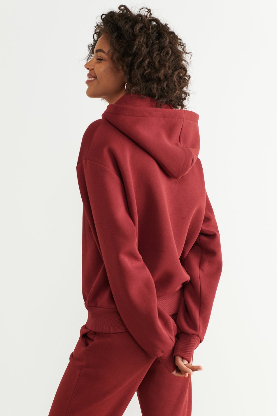 Oversized hoodie with dropped shoulders. The hoodie is red and has a lined hood. It has a ribbed cuff at the bottom and on the sleeve ends.