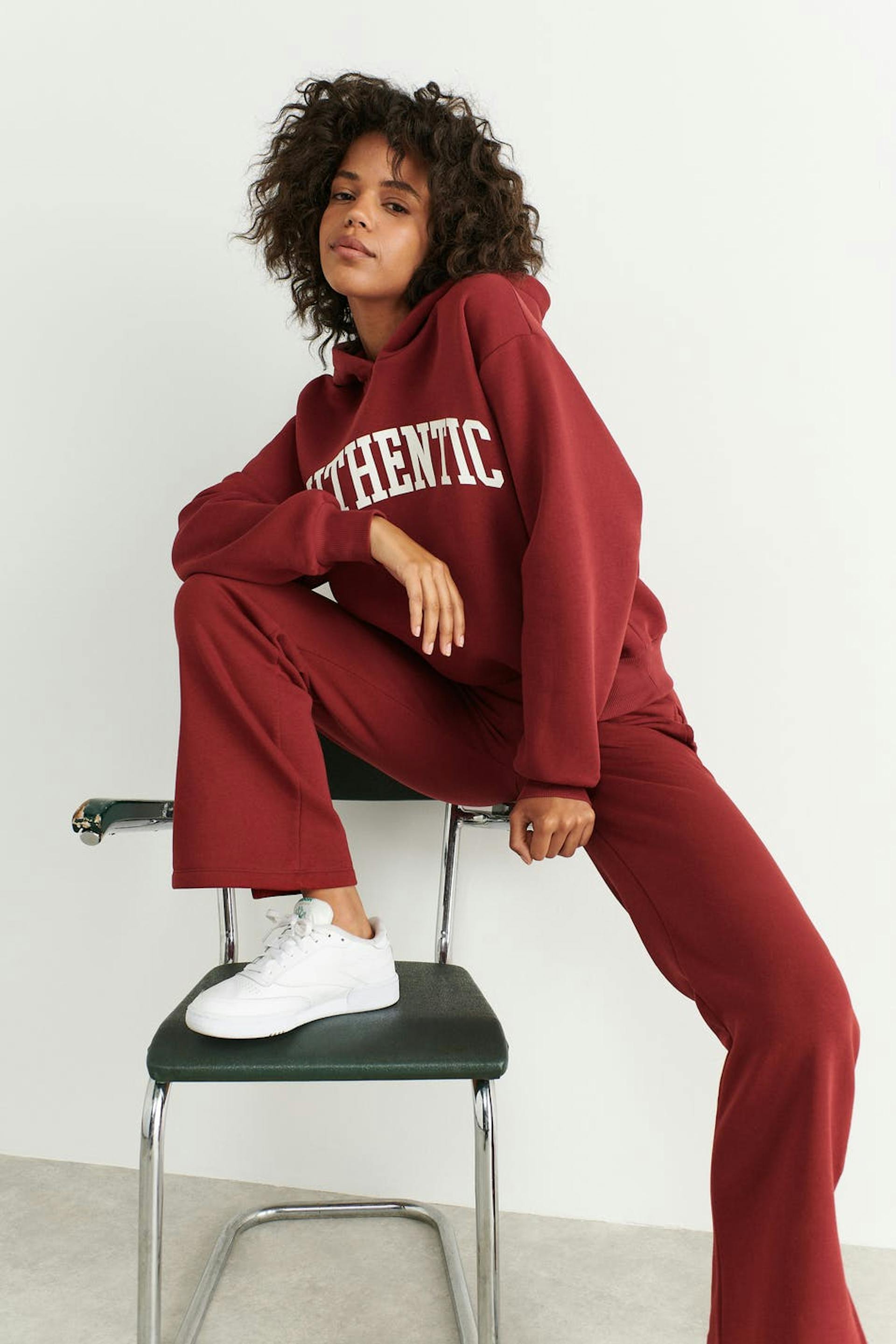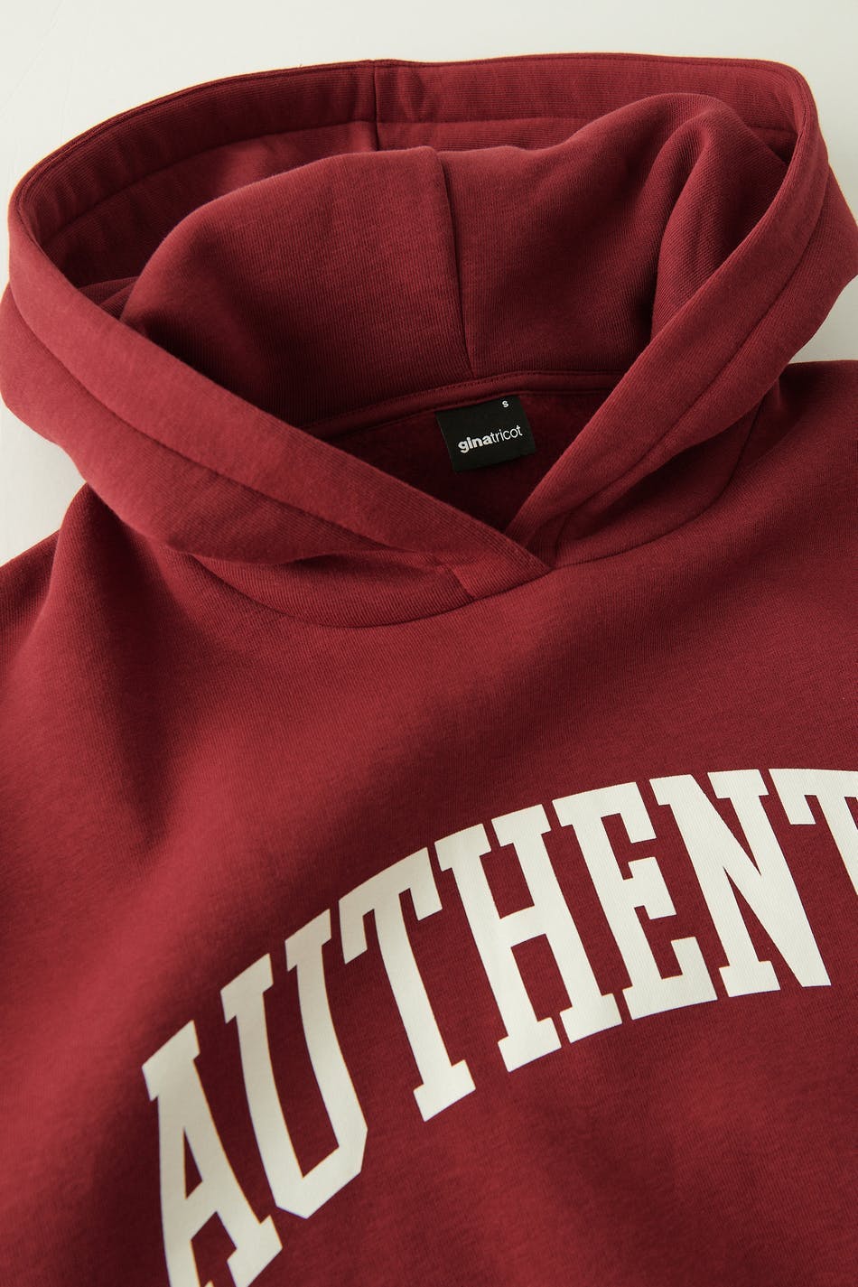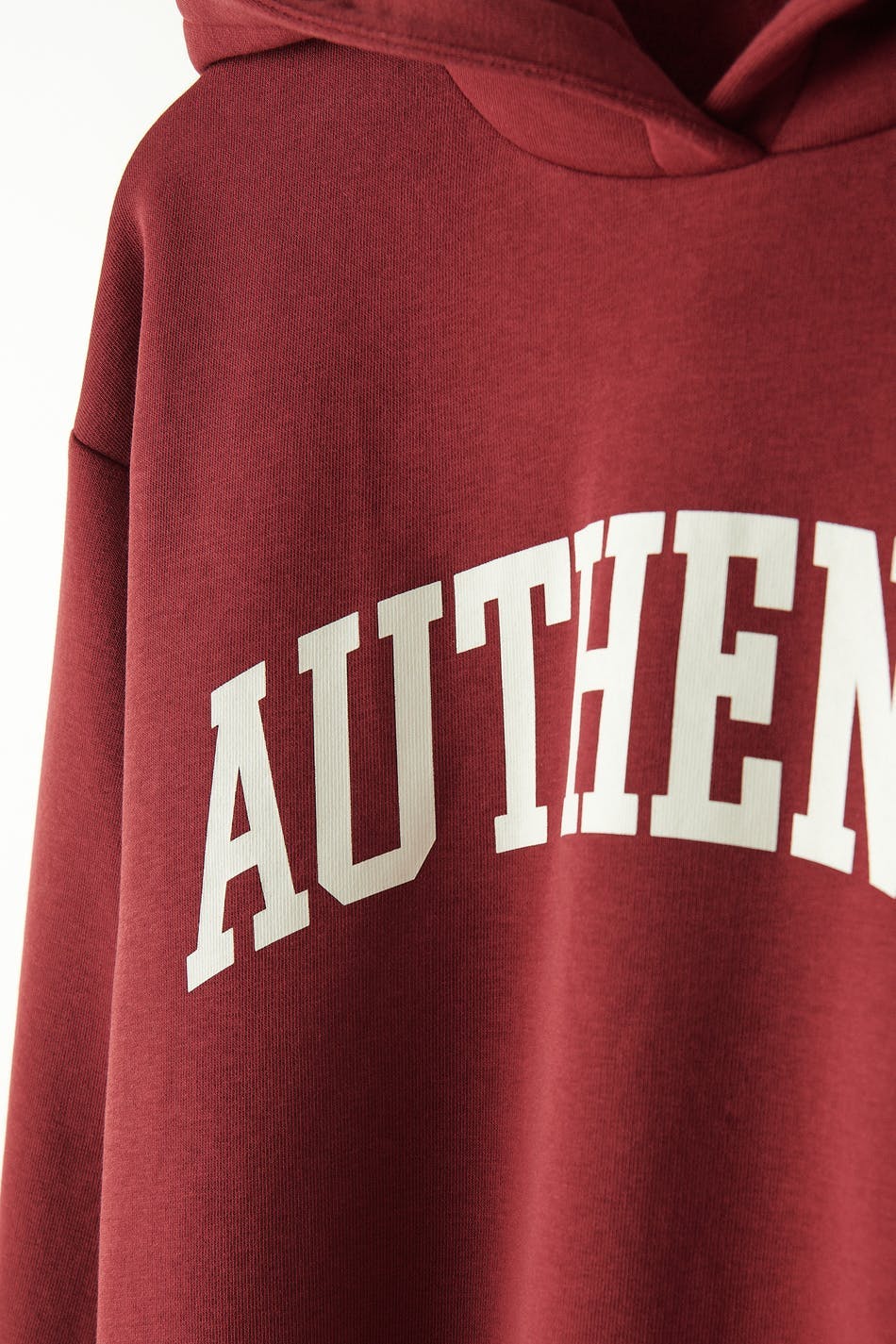 Oversized hoodie with dropped shoulders. The hoodie is red and has a lined hood. It has a ribbed cuff at the bottom and on the sleeve ends.