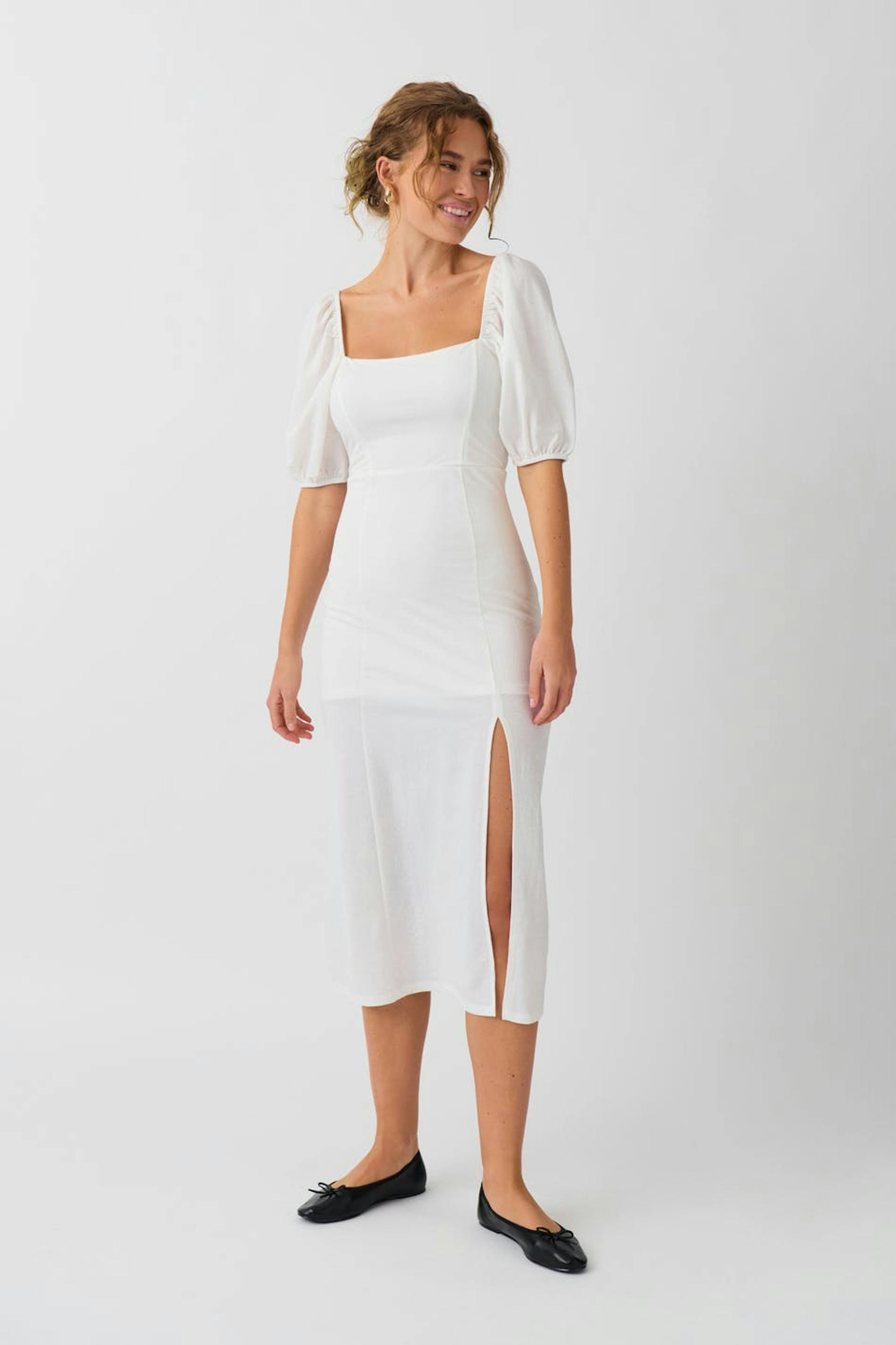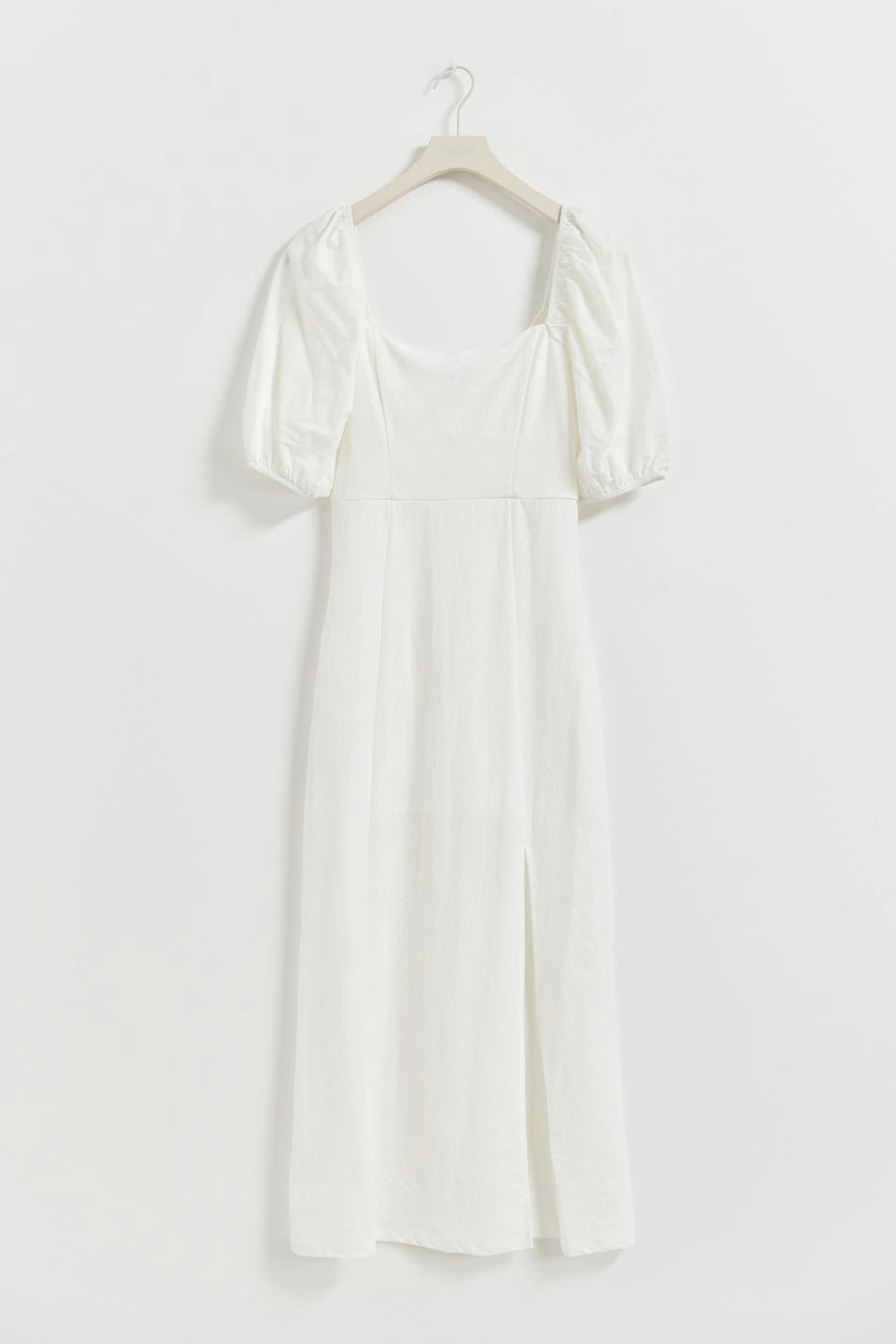 Dress with wide puff sleeve. The dress is white and has square neckline. It has slit and fitted waist.