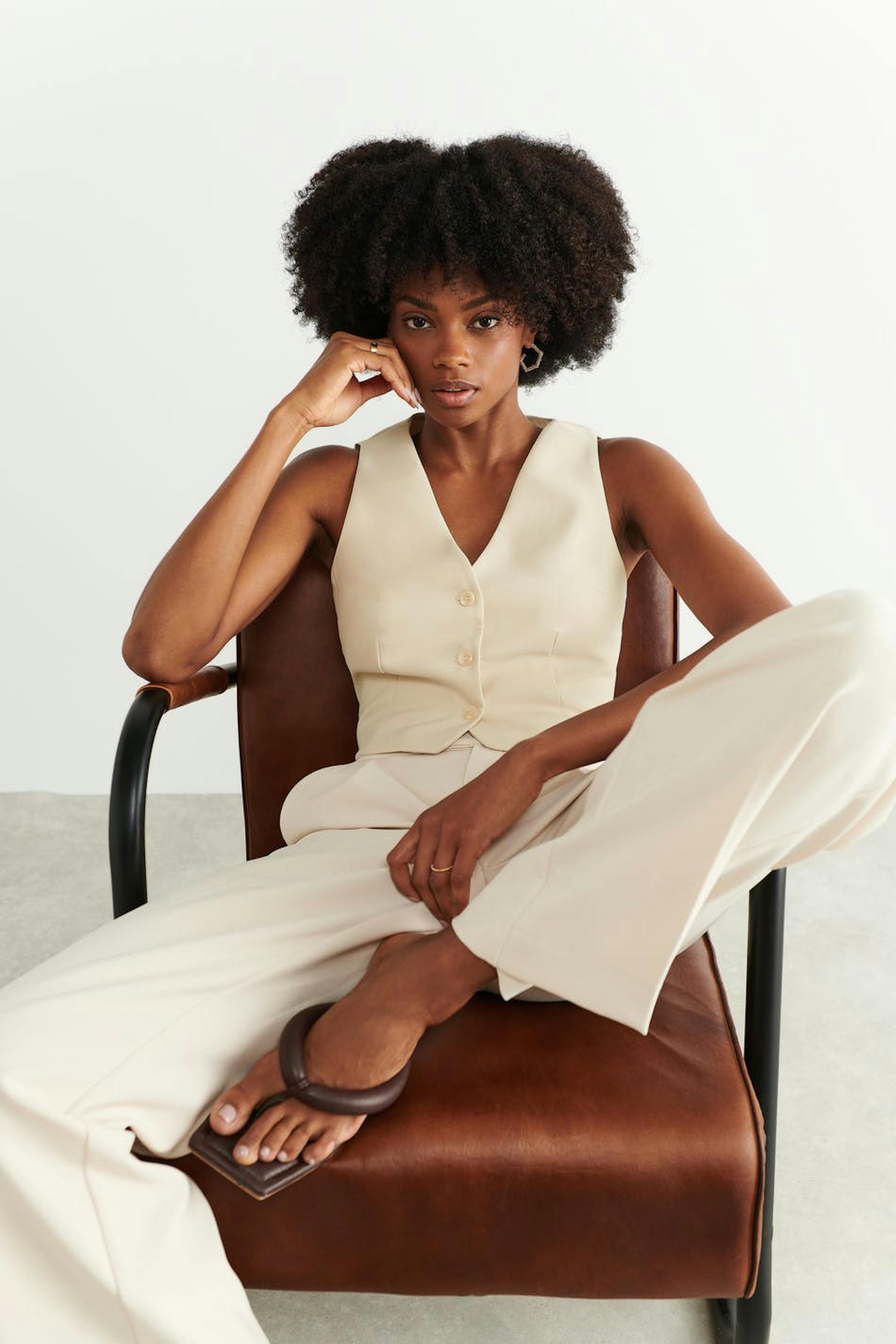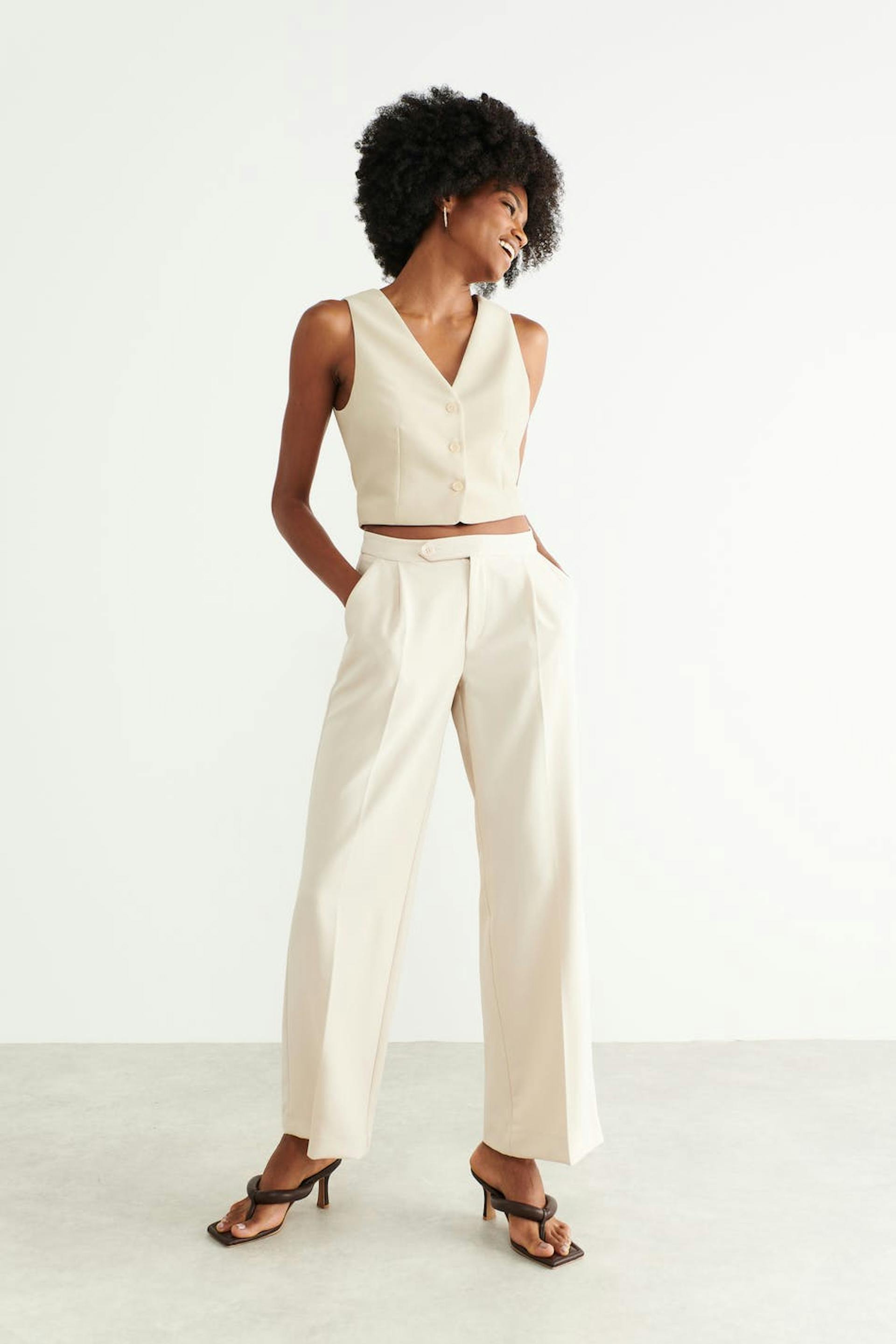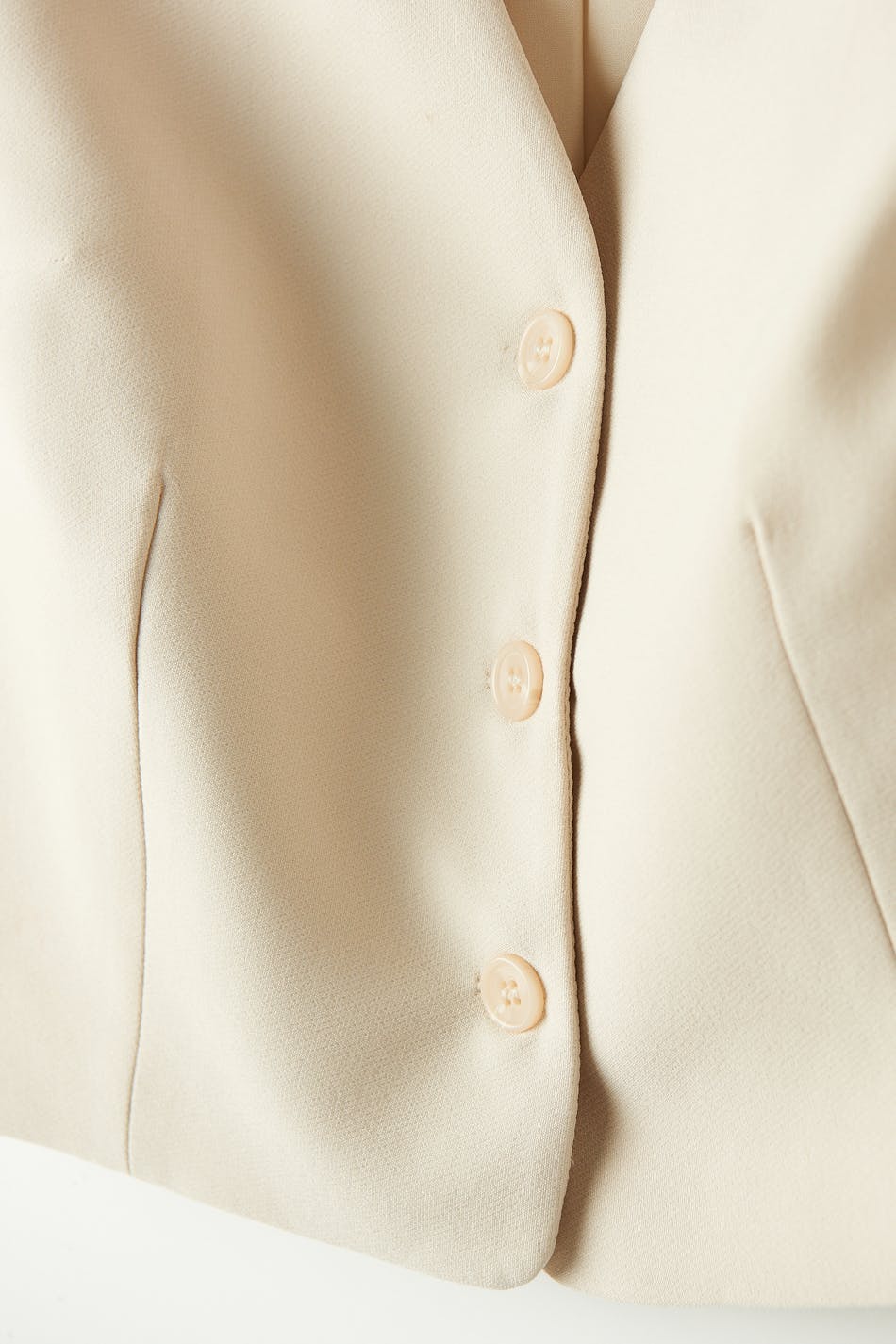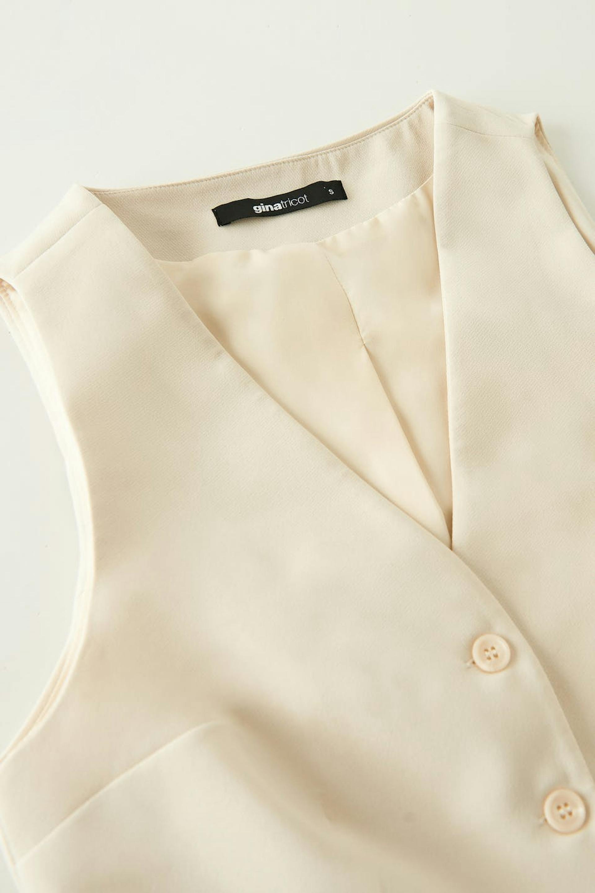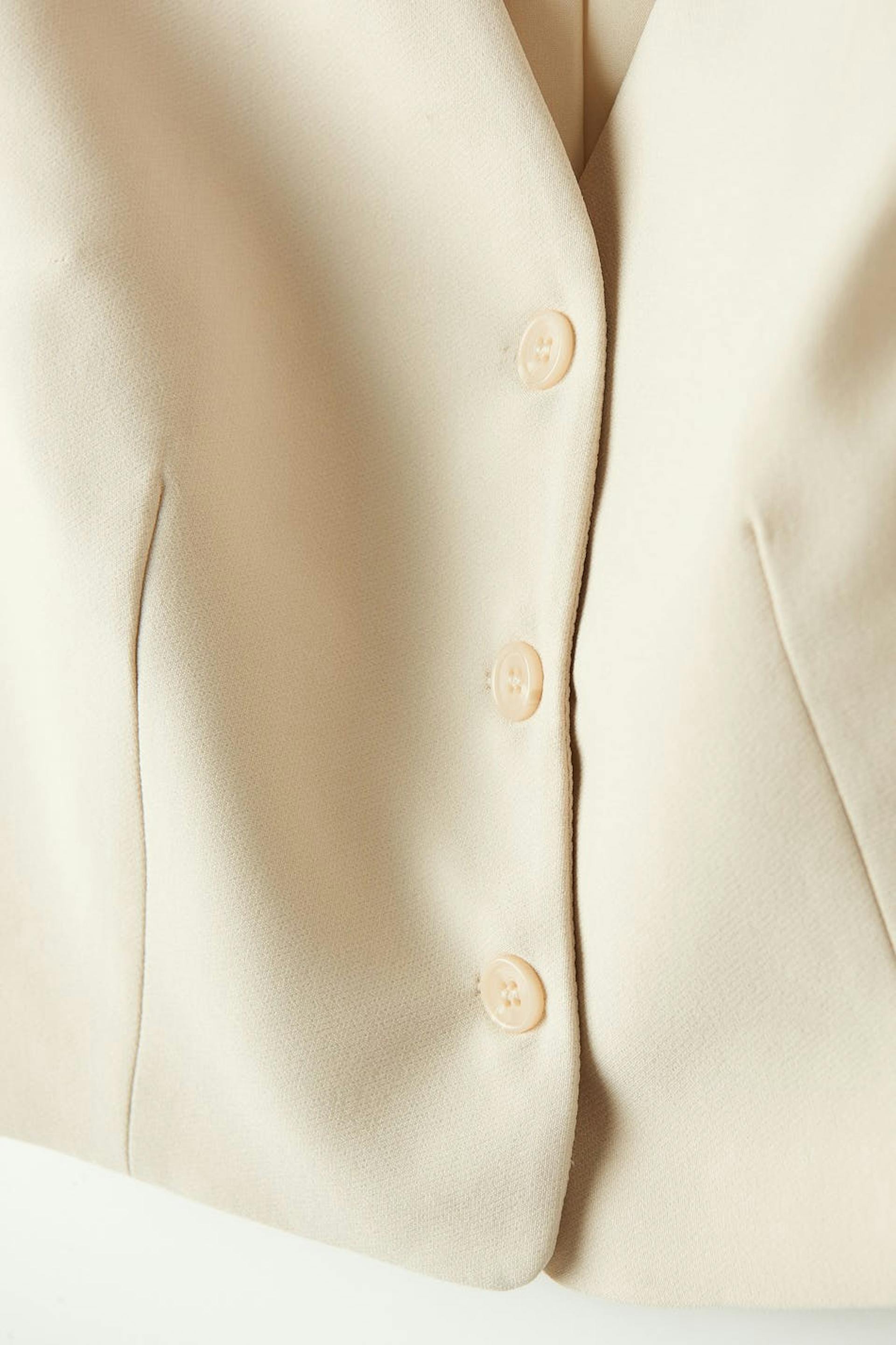 Blazer vest with fitted fit. The waistcoat is beige and has button placket in front. It has v-neck cut and welt pockets.