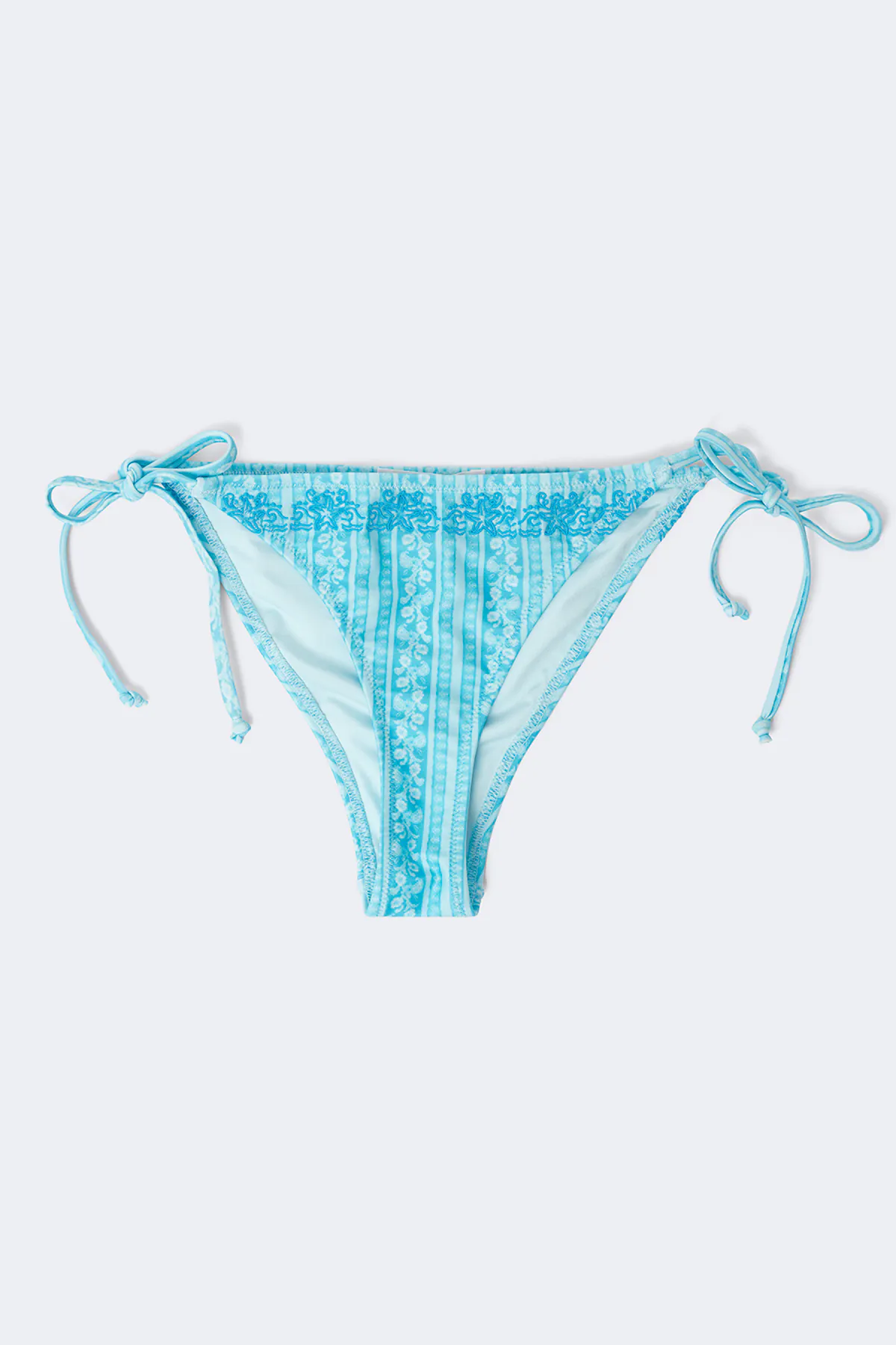 Patterned bikini bottoms with embroidered details. The panties are blue and have self-tie in the sides. They have lined inside.