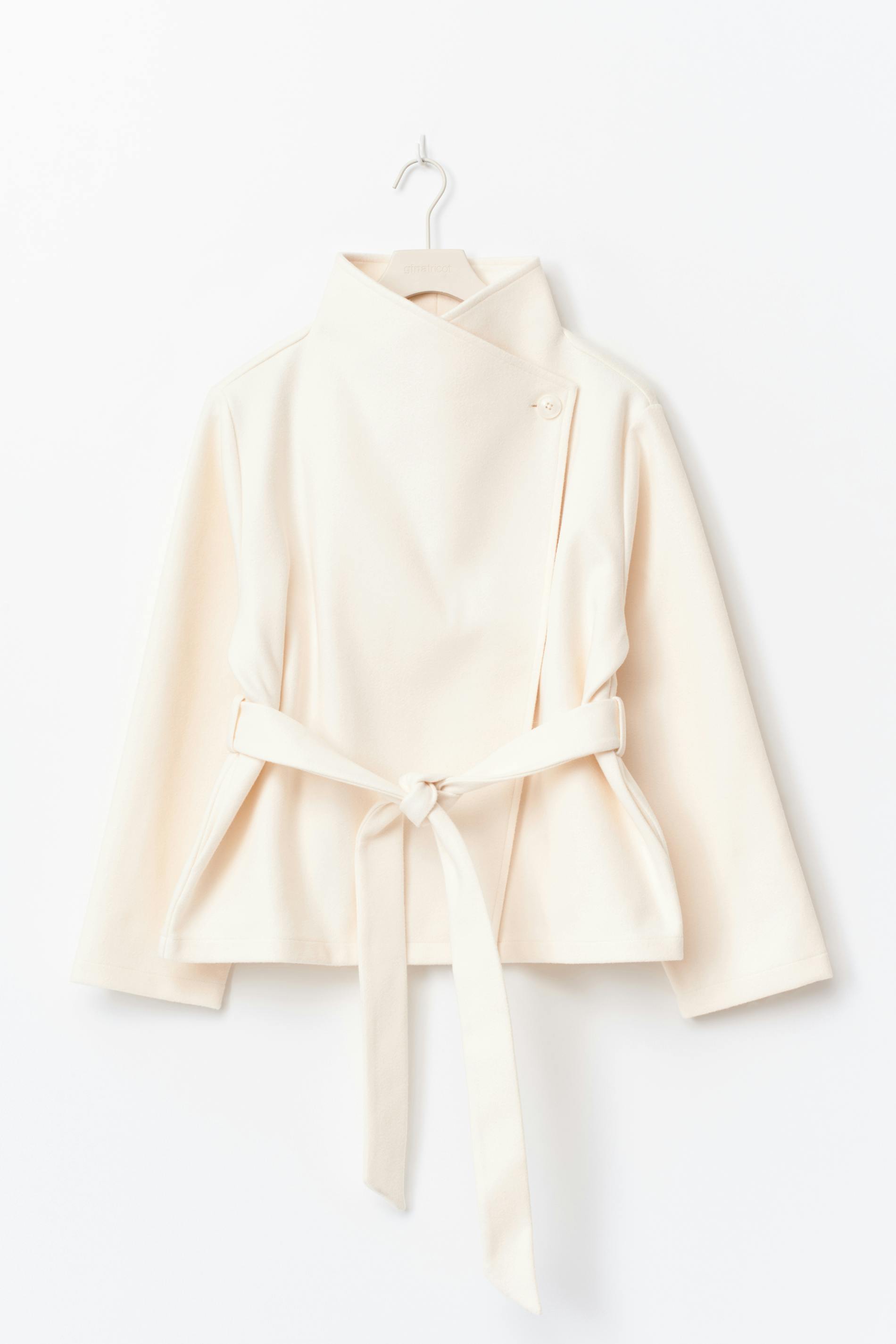 Long-sleeved cape with wide sleeves. The cape is white and has belt at the waist. It has high neck, spacious fit and button at the front and on the sleeves.