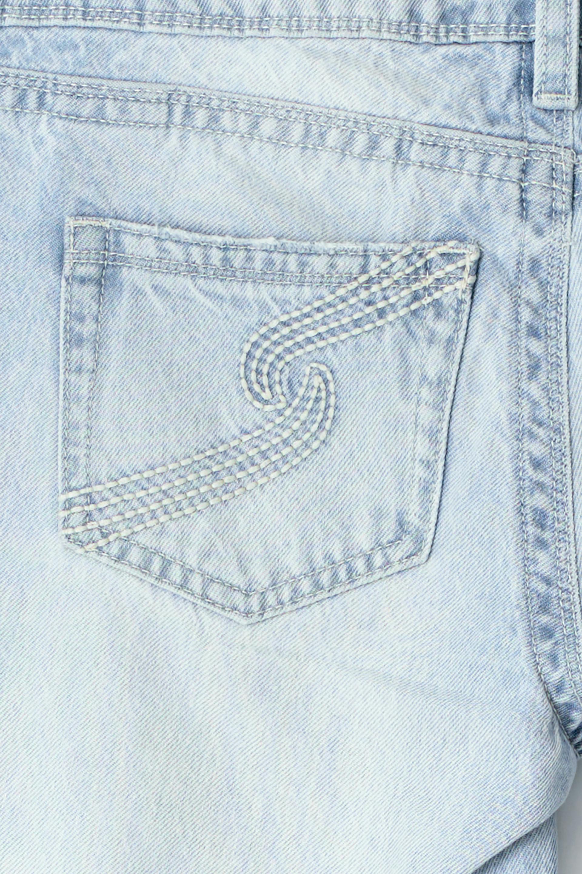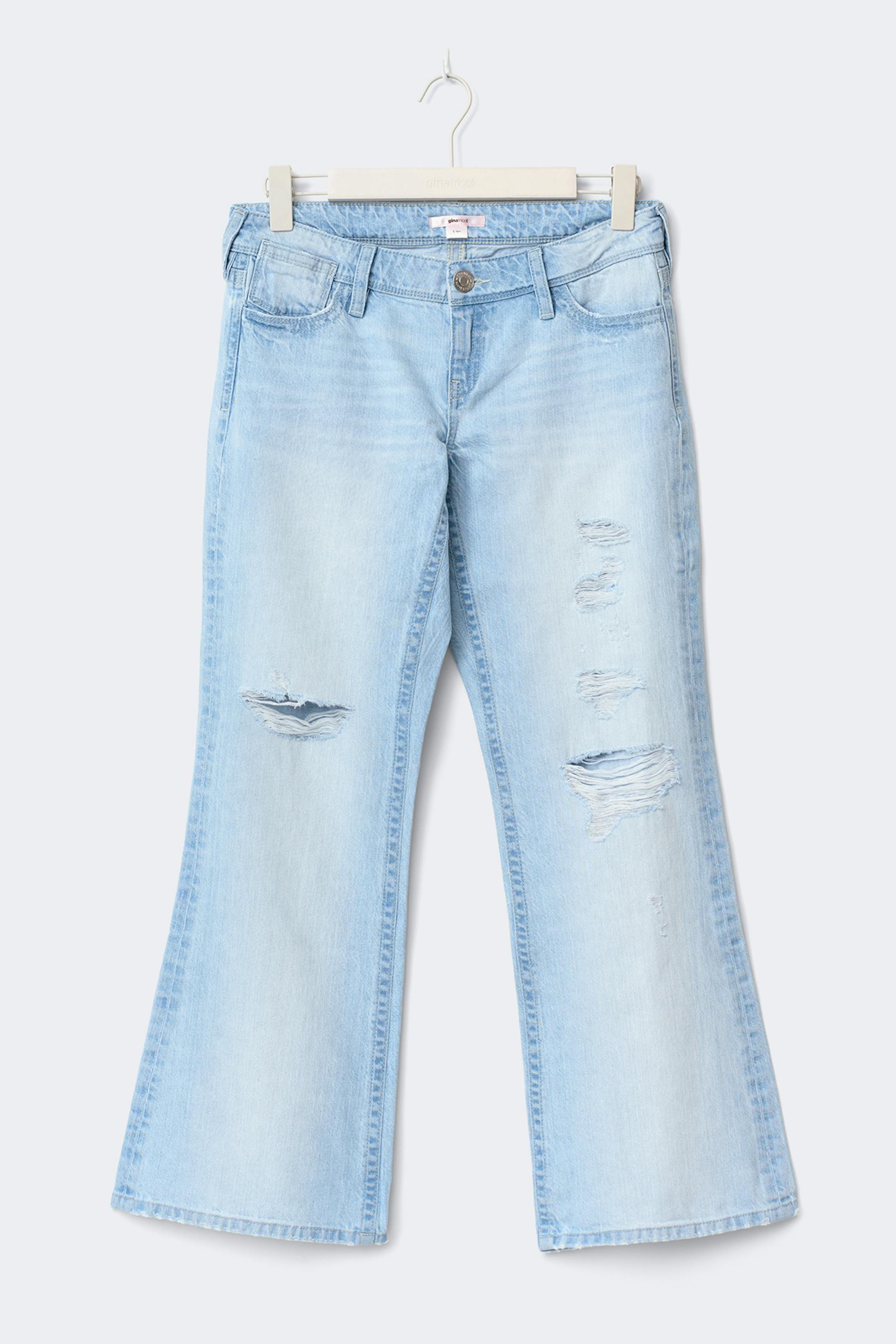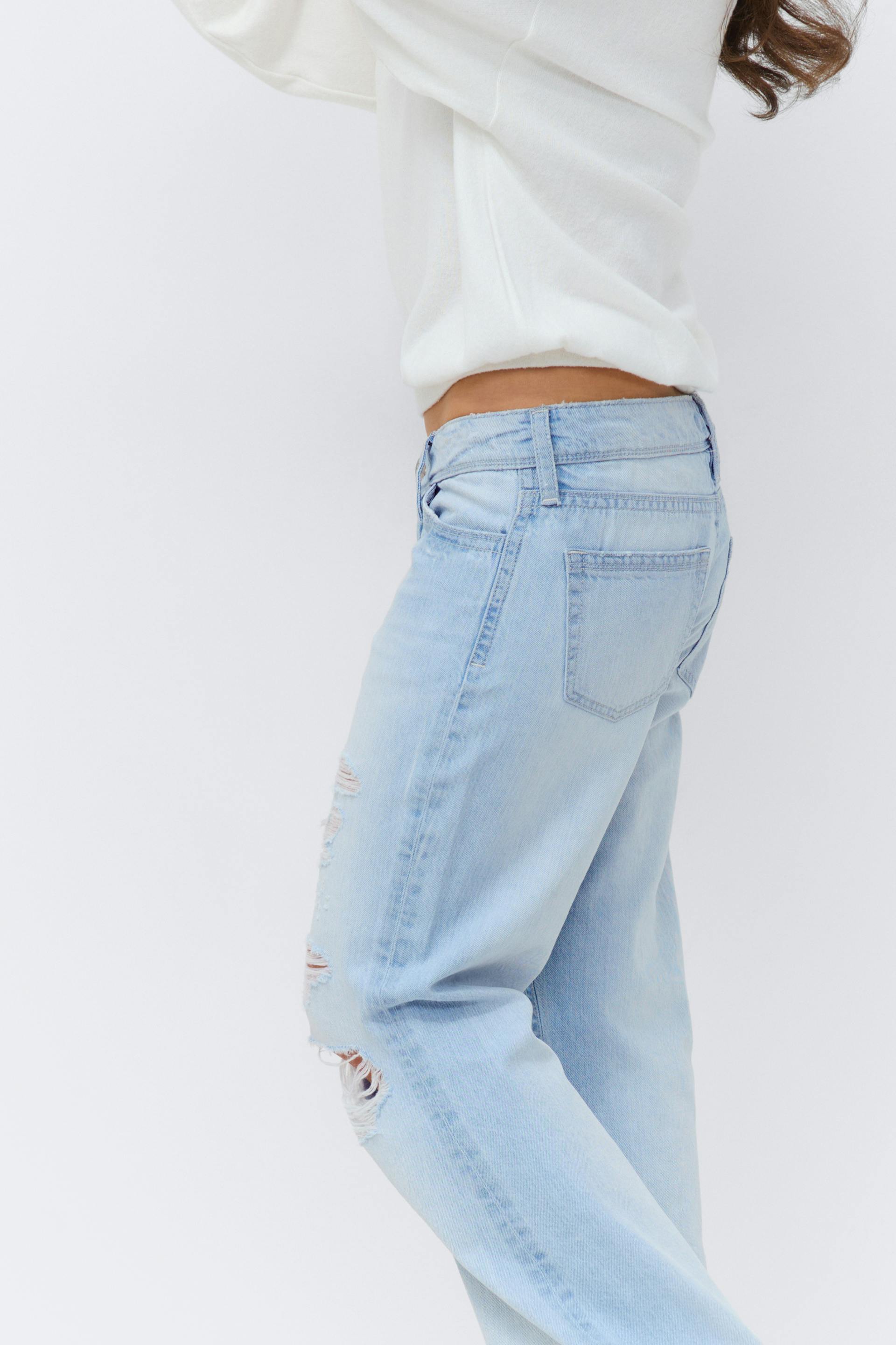 Petite low-waisted jeans with holes. The jeans are light-blue and have loose-fitting style. They have wide legs, belt loops, pockets at the front and back and zip fly. Non-stretch.