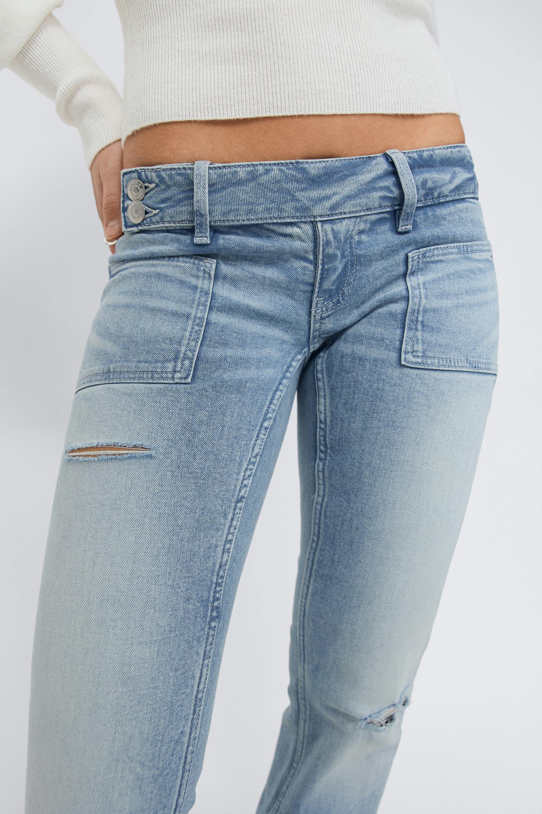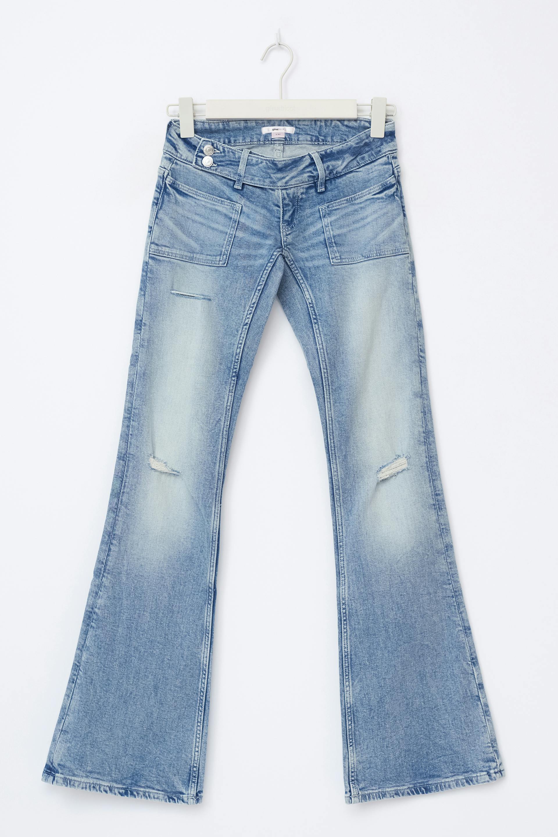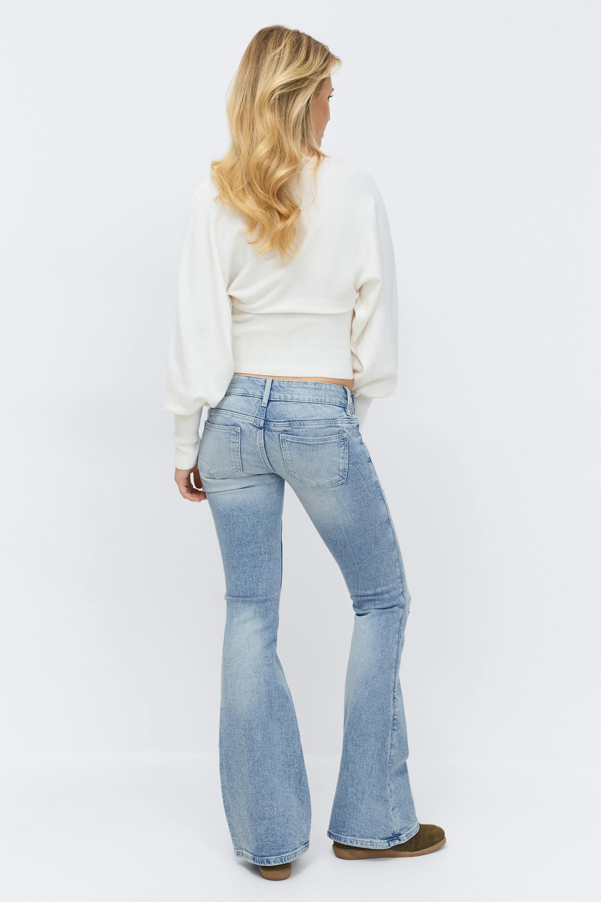 Flare jeans with low waist. The jeans are light-blue and have patch front pockets. They have low stretch, back pockets and flared legs with regular length.