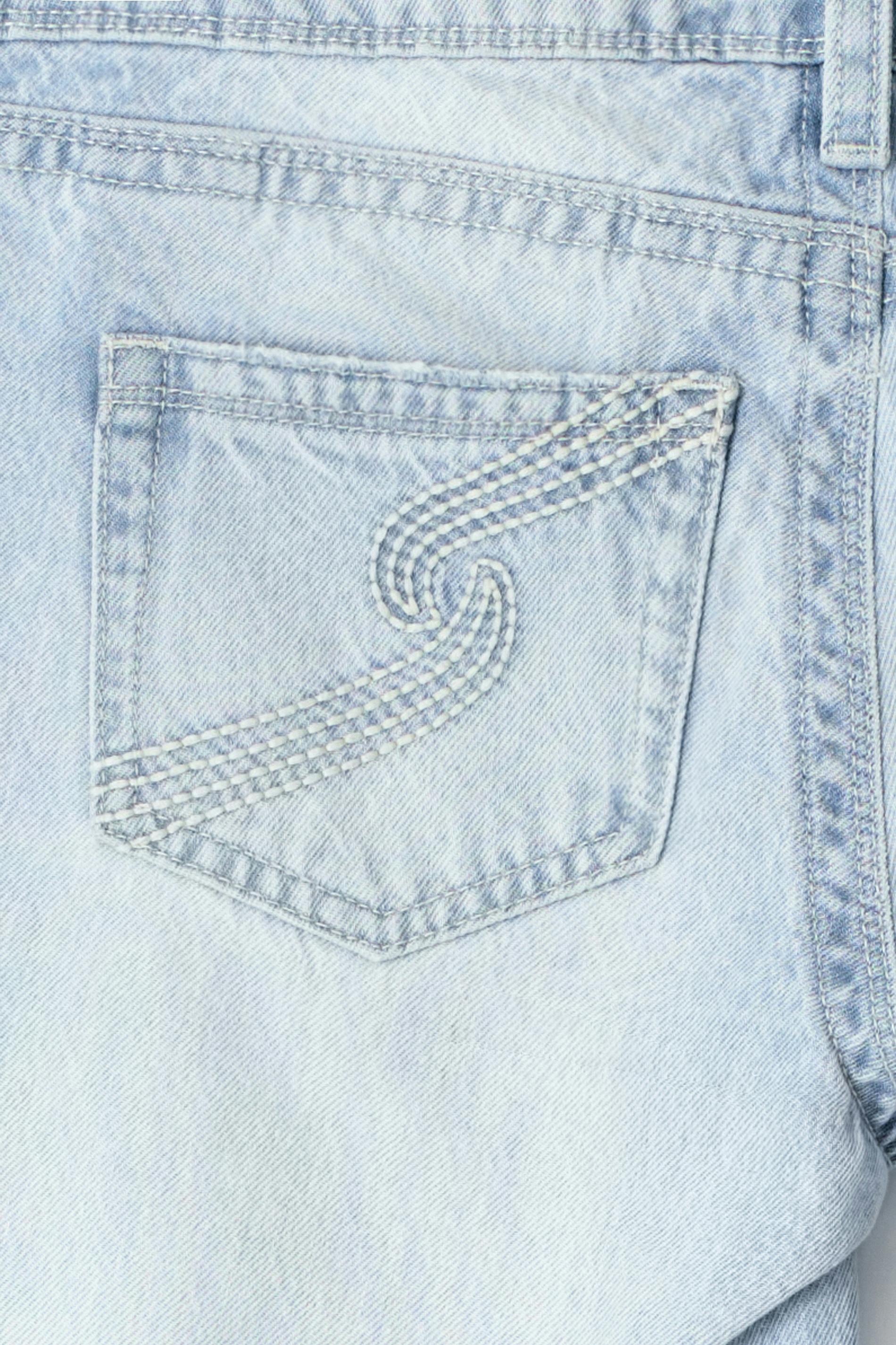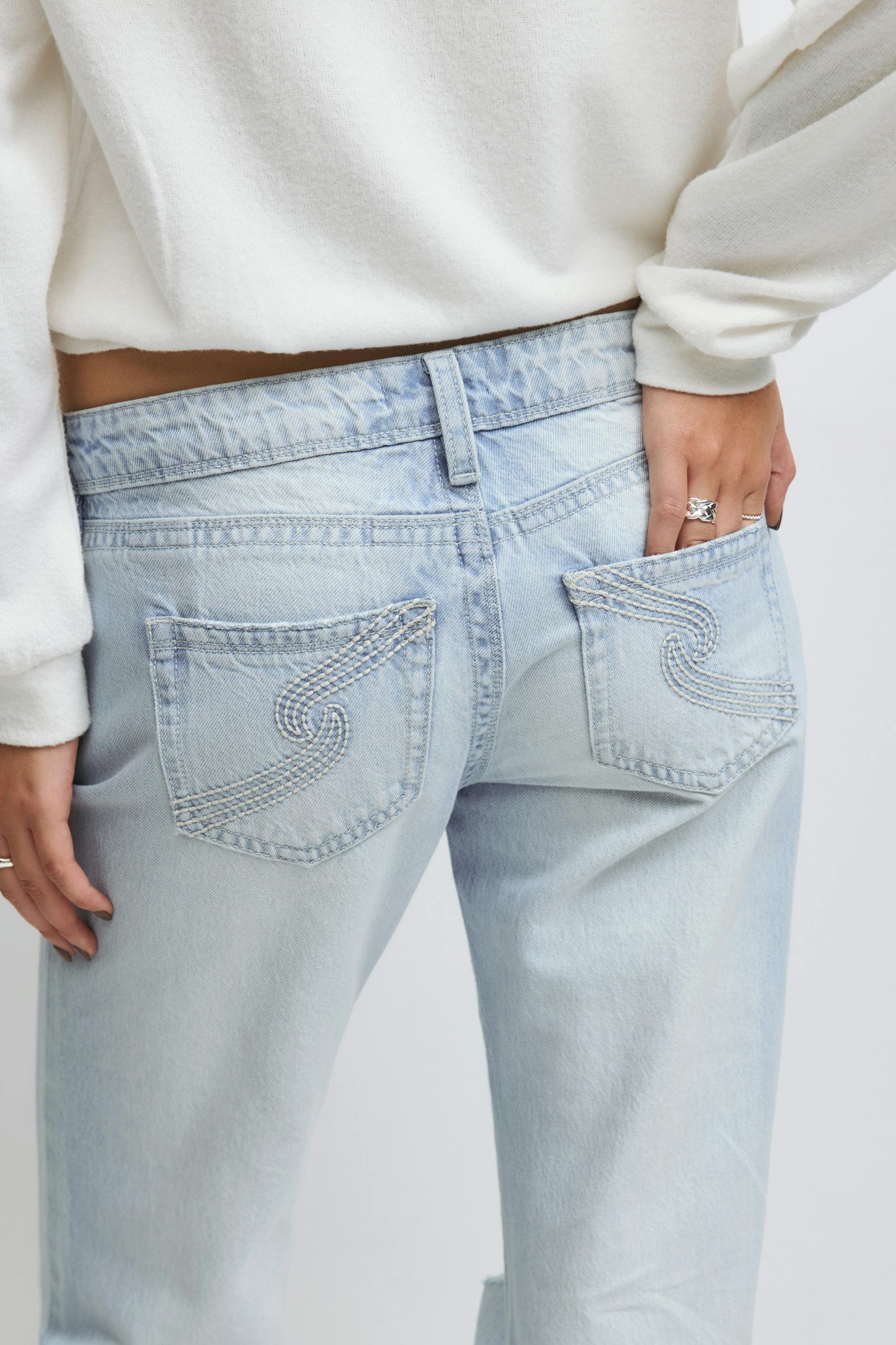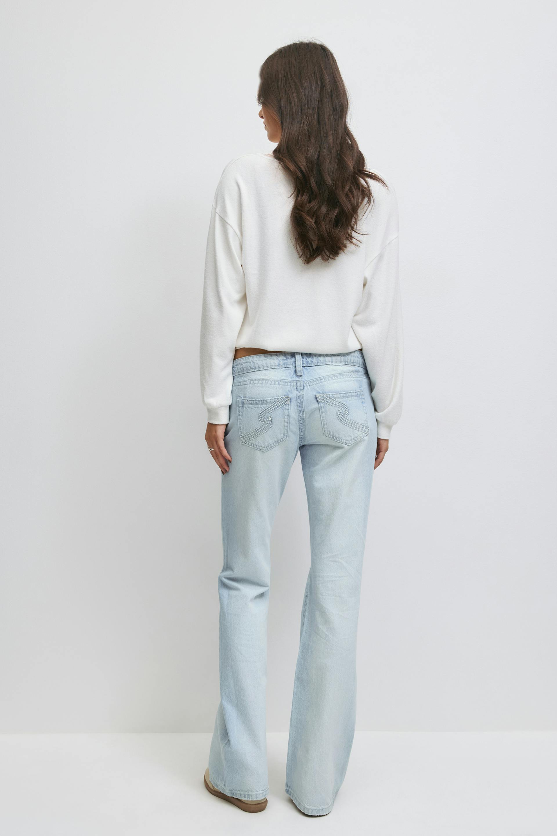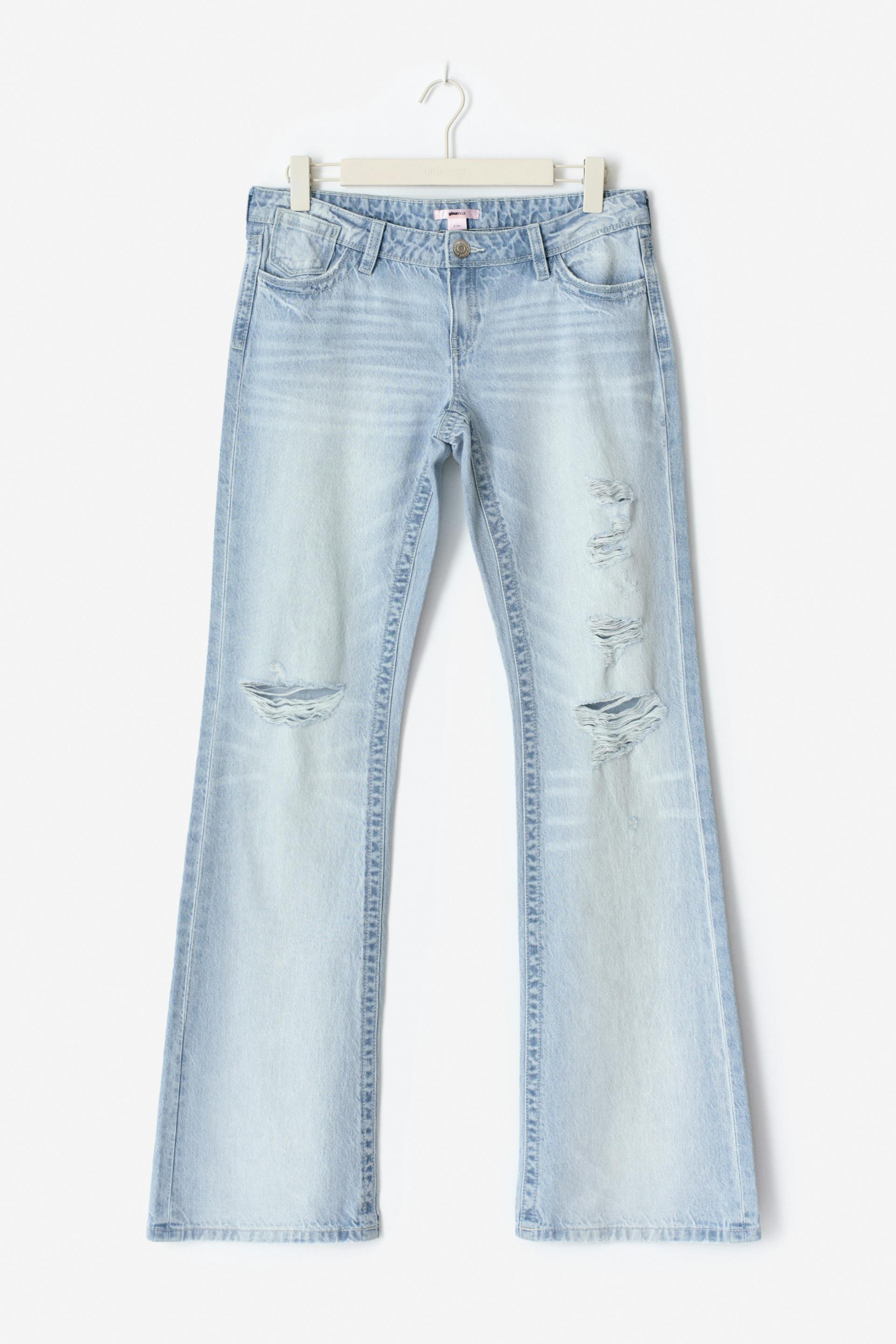 Flare jeans with distressed details at the front. The jeans are light-blue and have low waist. They have wide legs, zip fly, pockets at the front and at the back, normal fit and regular length. Use our size guide to find your size.