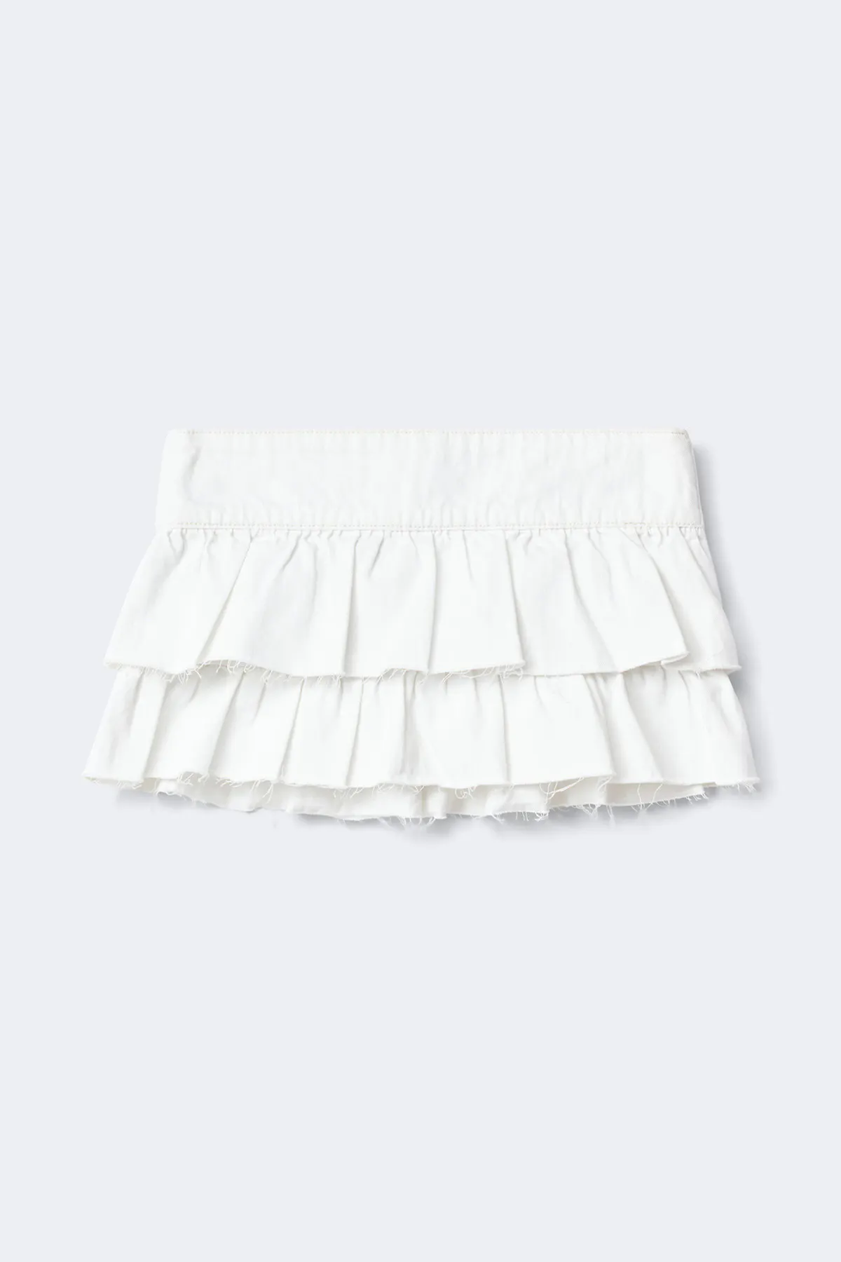Short denim skirt with frills. The skirt is white and has low waist. It has zip closure, figure-hugging fit and raw edges. Non-stretch. Use our size guide to find your size.