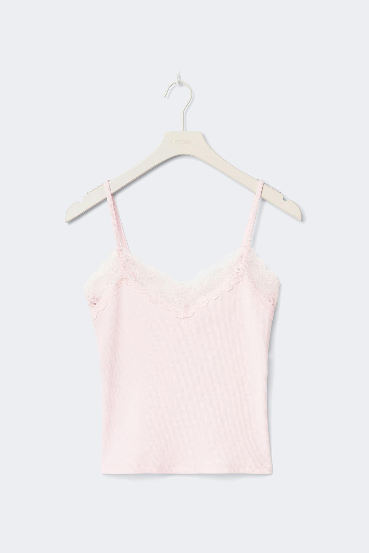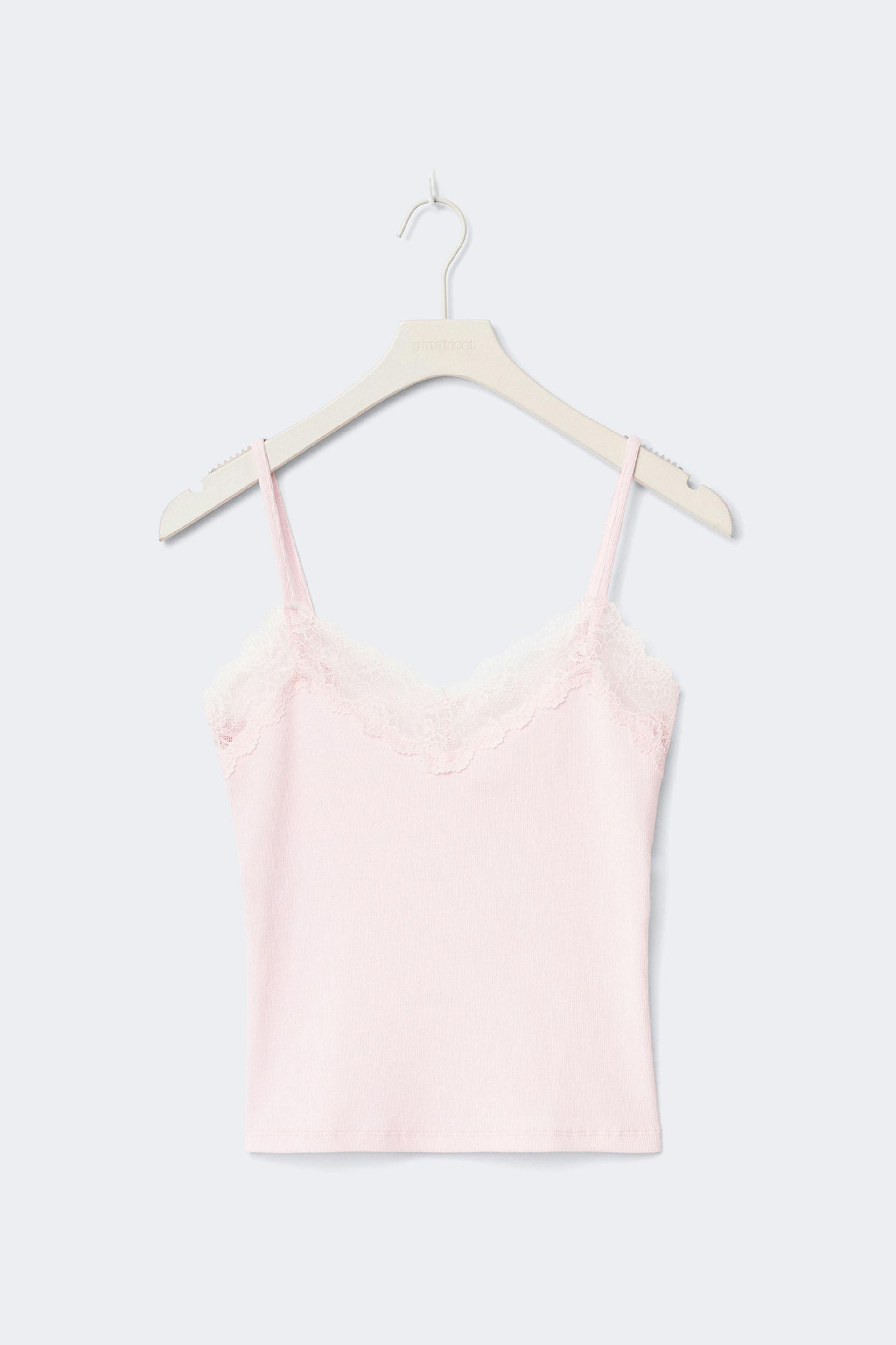 Slip singlet with lace at the neckline. The slip singlet is pink and has slim shoulder straps. It has ribbed quality and normal fit.