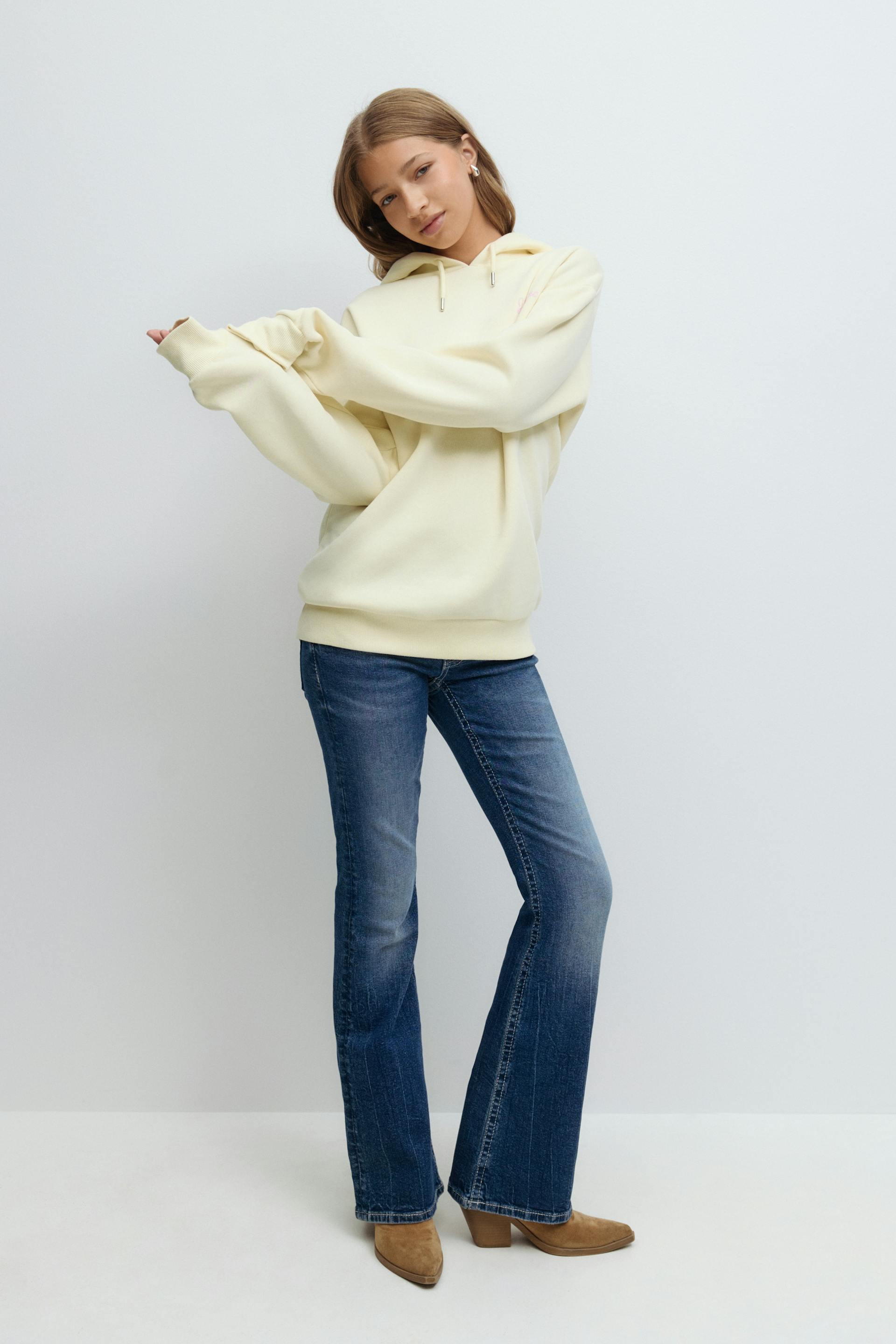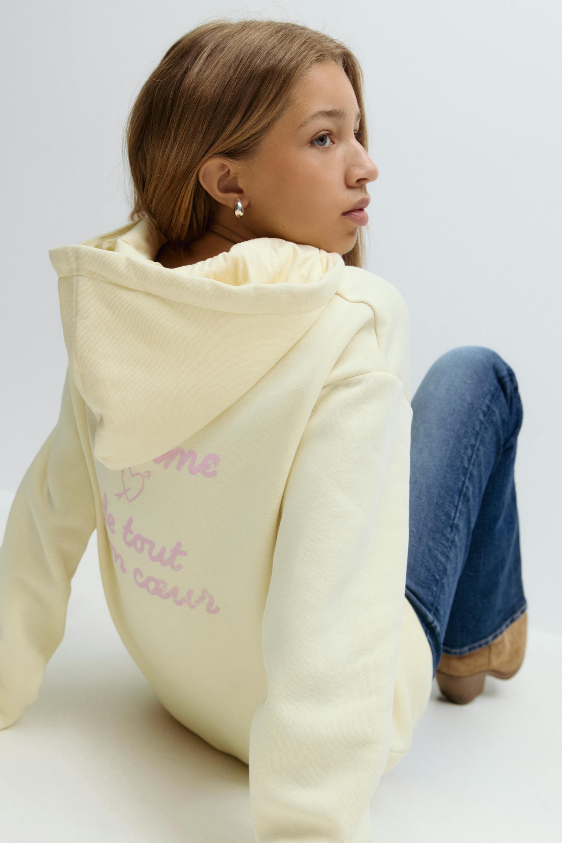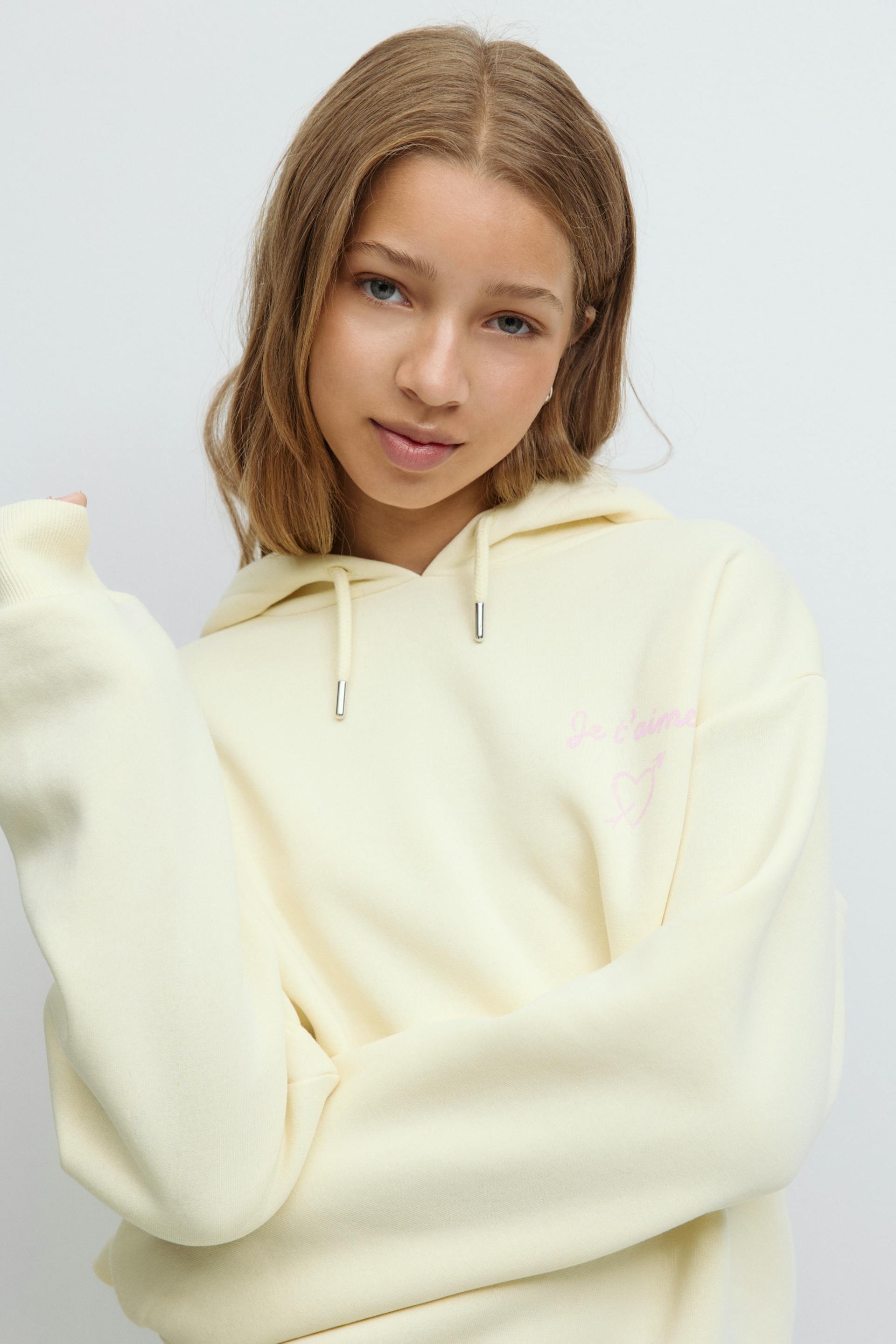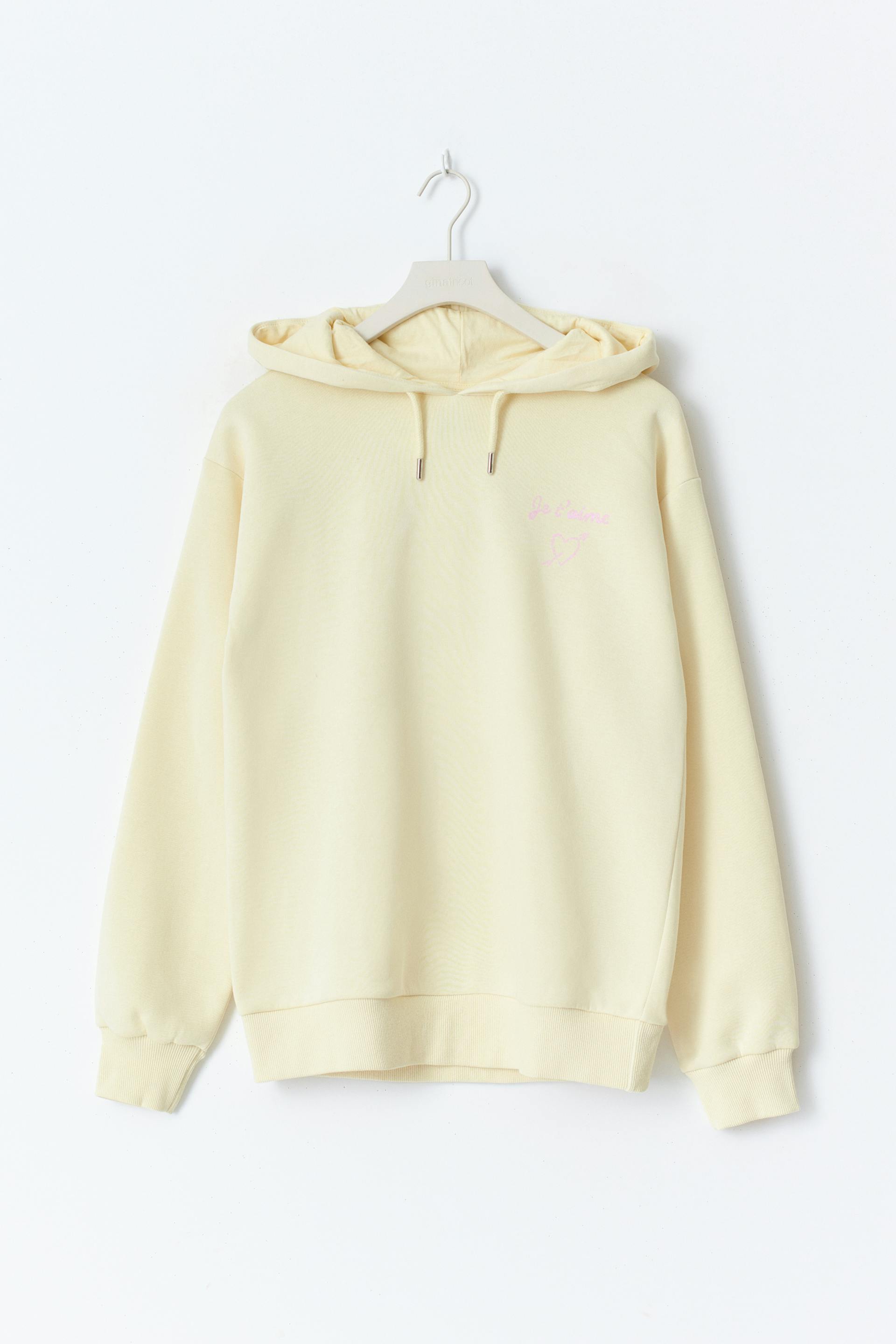 Hoodie with print at the front and on the chest. The hoodie is yellow and has hood with drawstrings. It has long sleeve and a ribbing at sleeve ends and at the bottom.