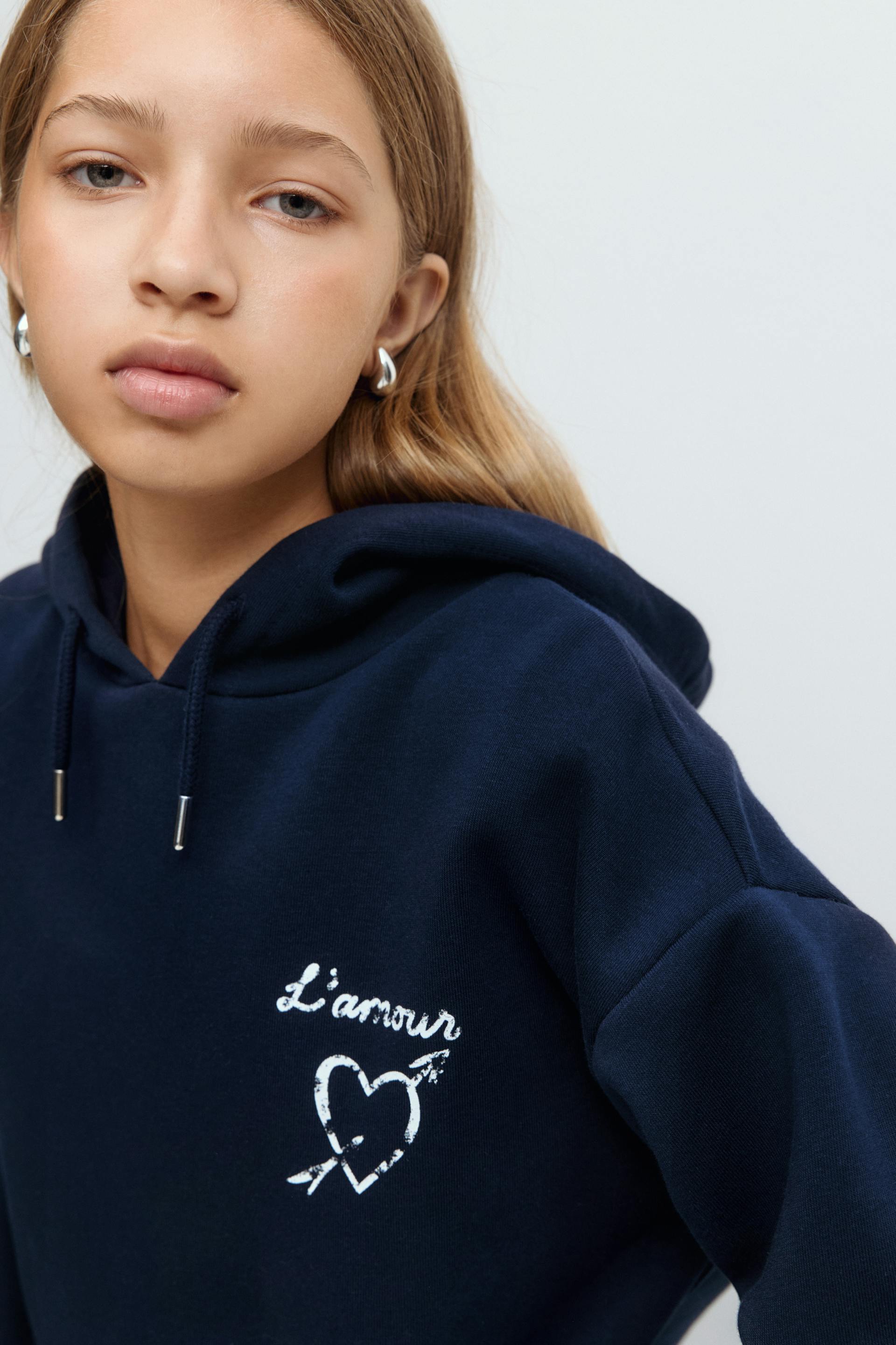 Hoodie with print at the front and on the chest. The hoodie is black and has hood with drawstrings. It has long sleeve and a ribbing at sleeve ends and at the bottom. Print: L'amour.