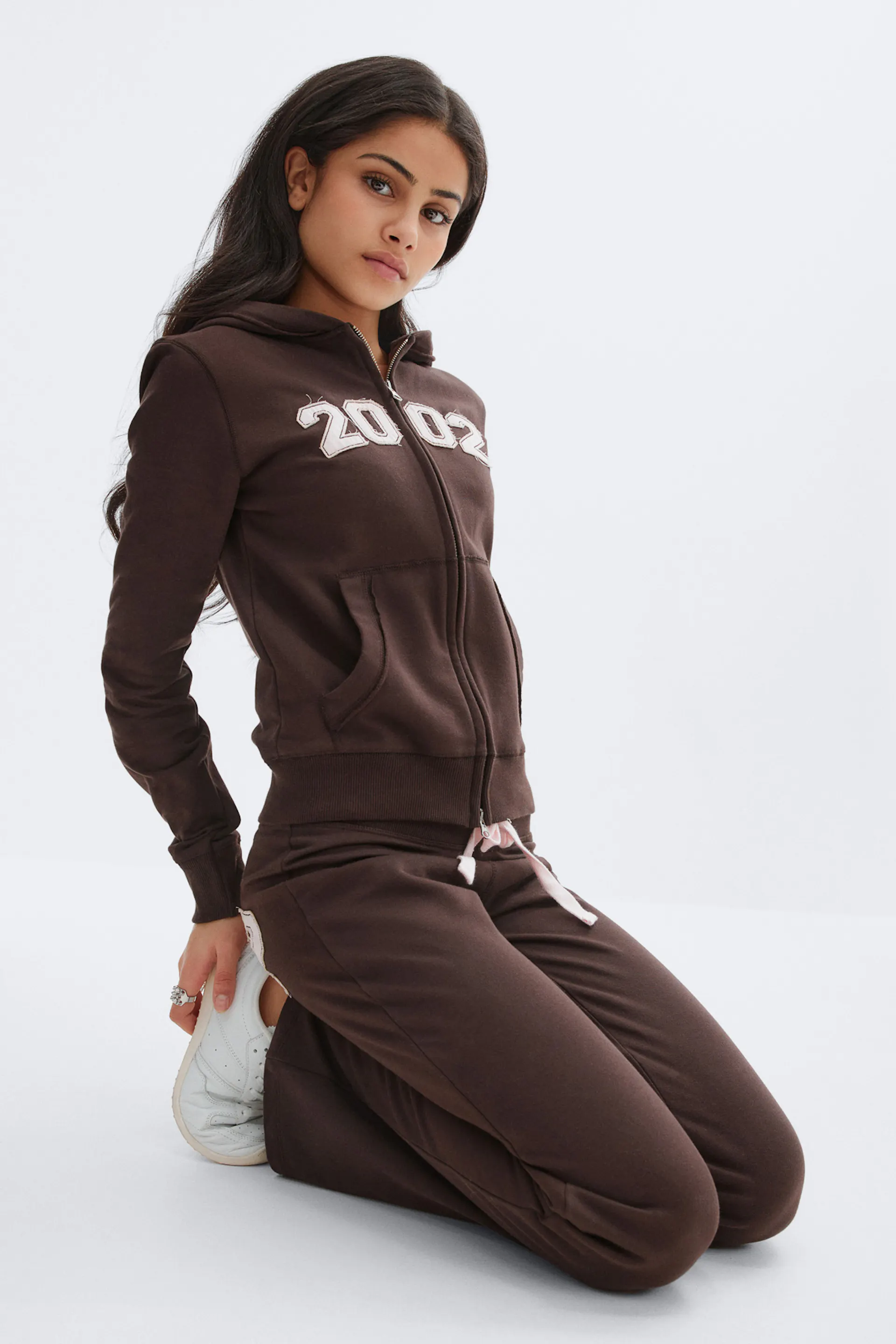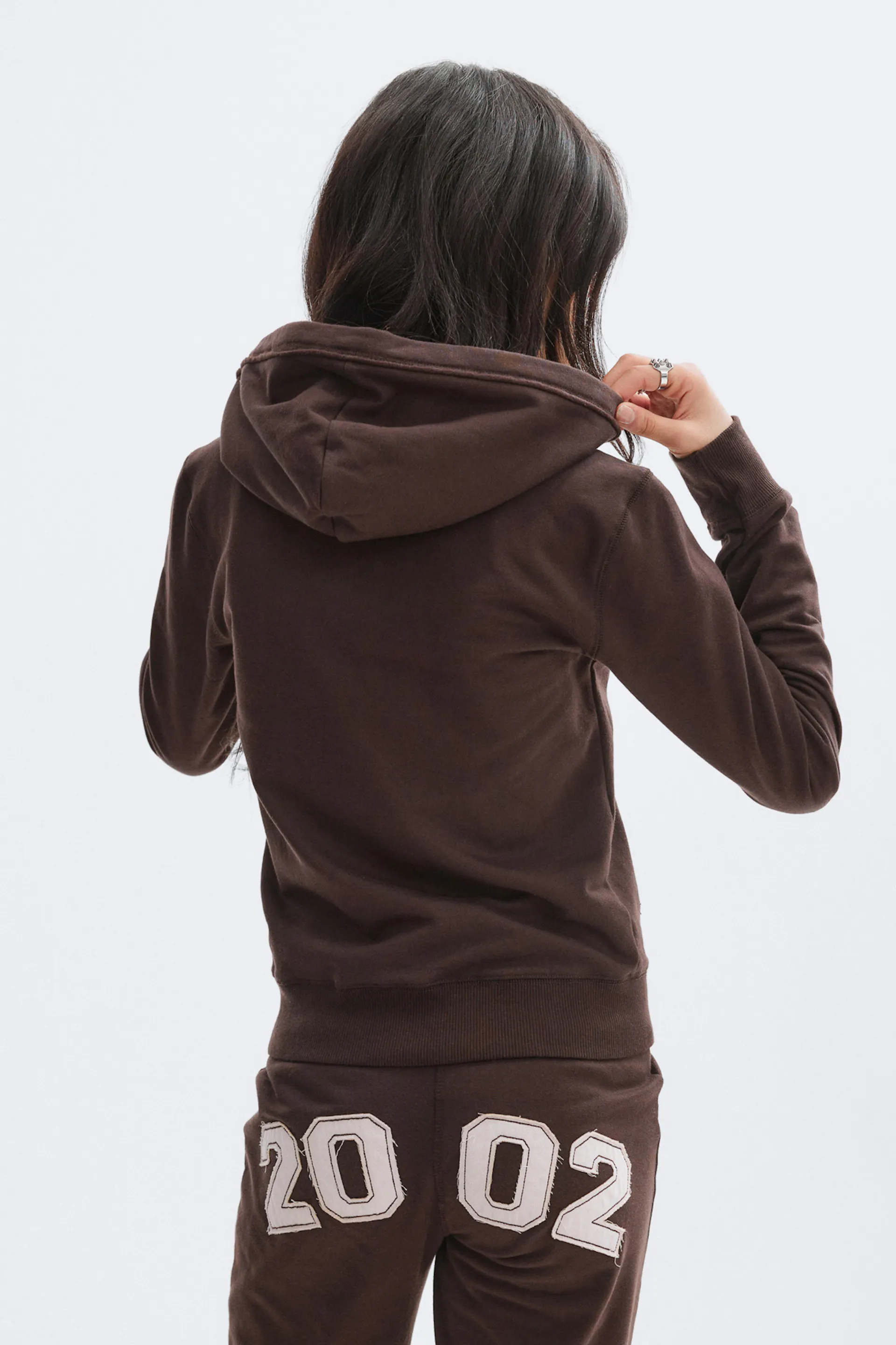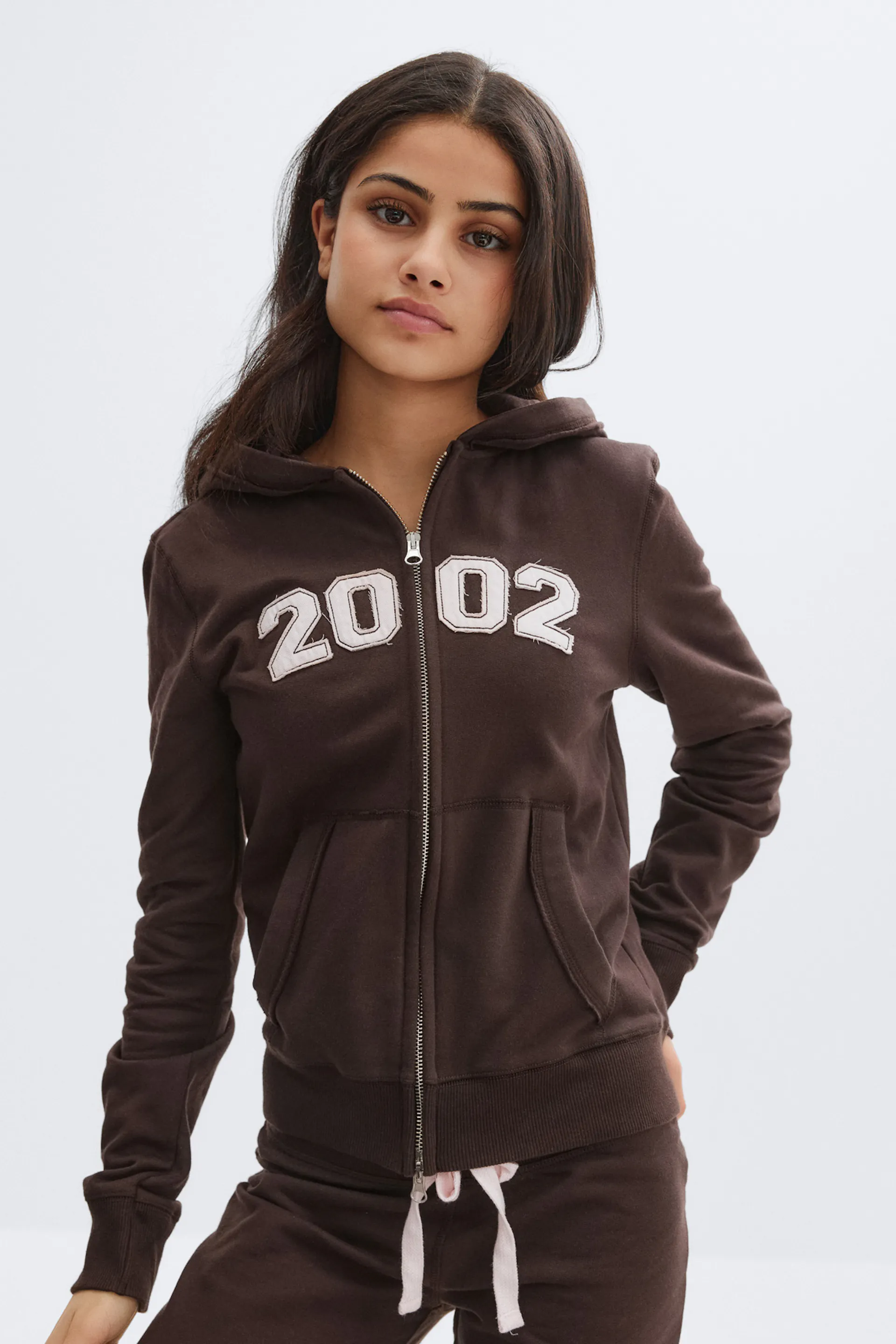 Hoodie with two-way zip. The jumper is brown and has hood. It has print on the chest, pockets at the front and cuff on the sleeve ends and at the bottom.