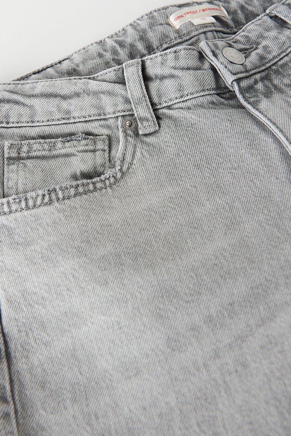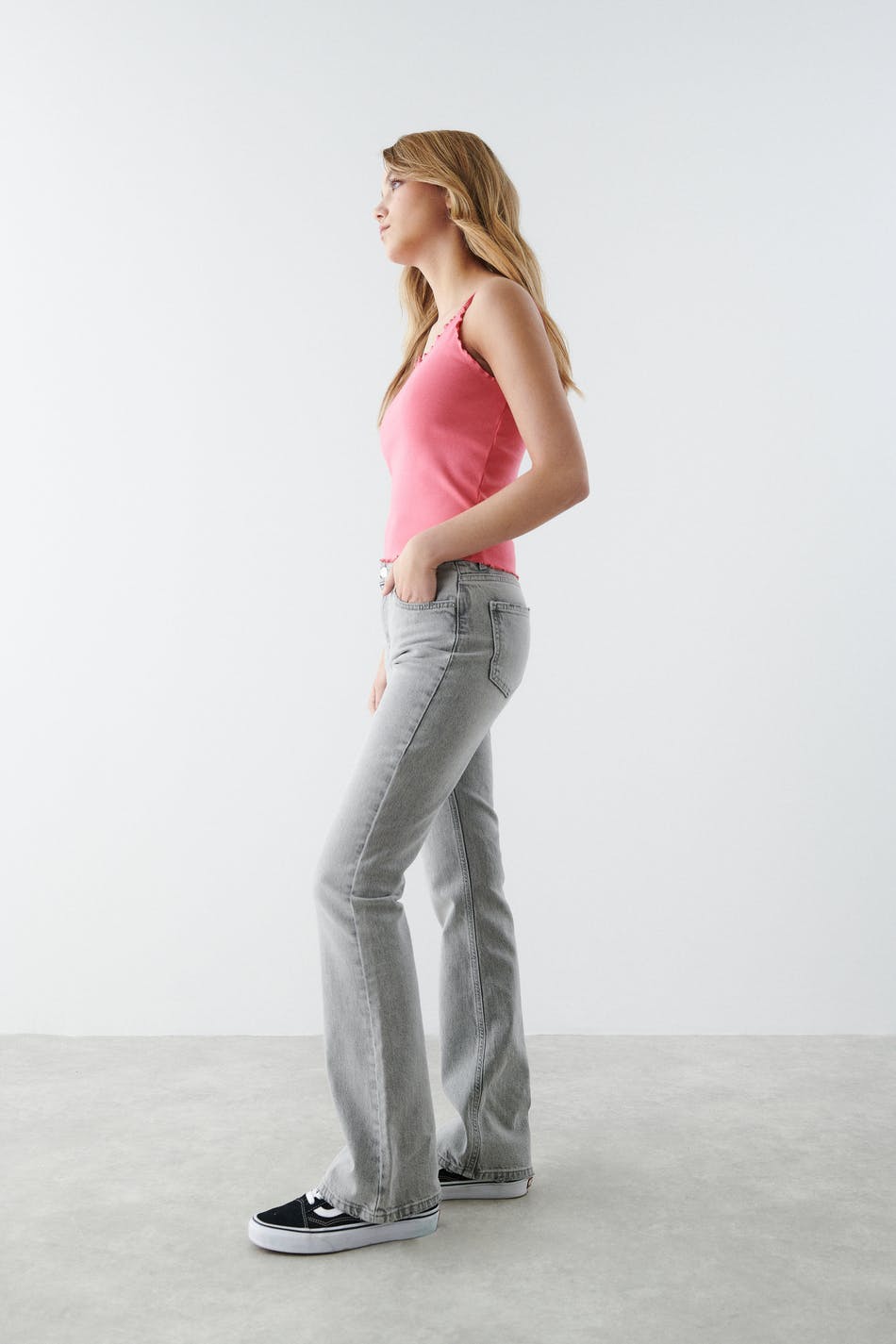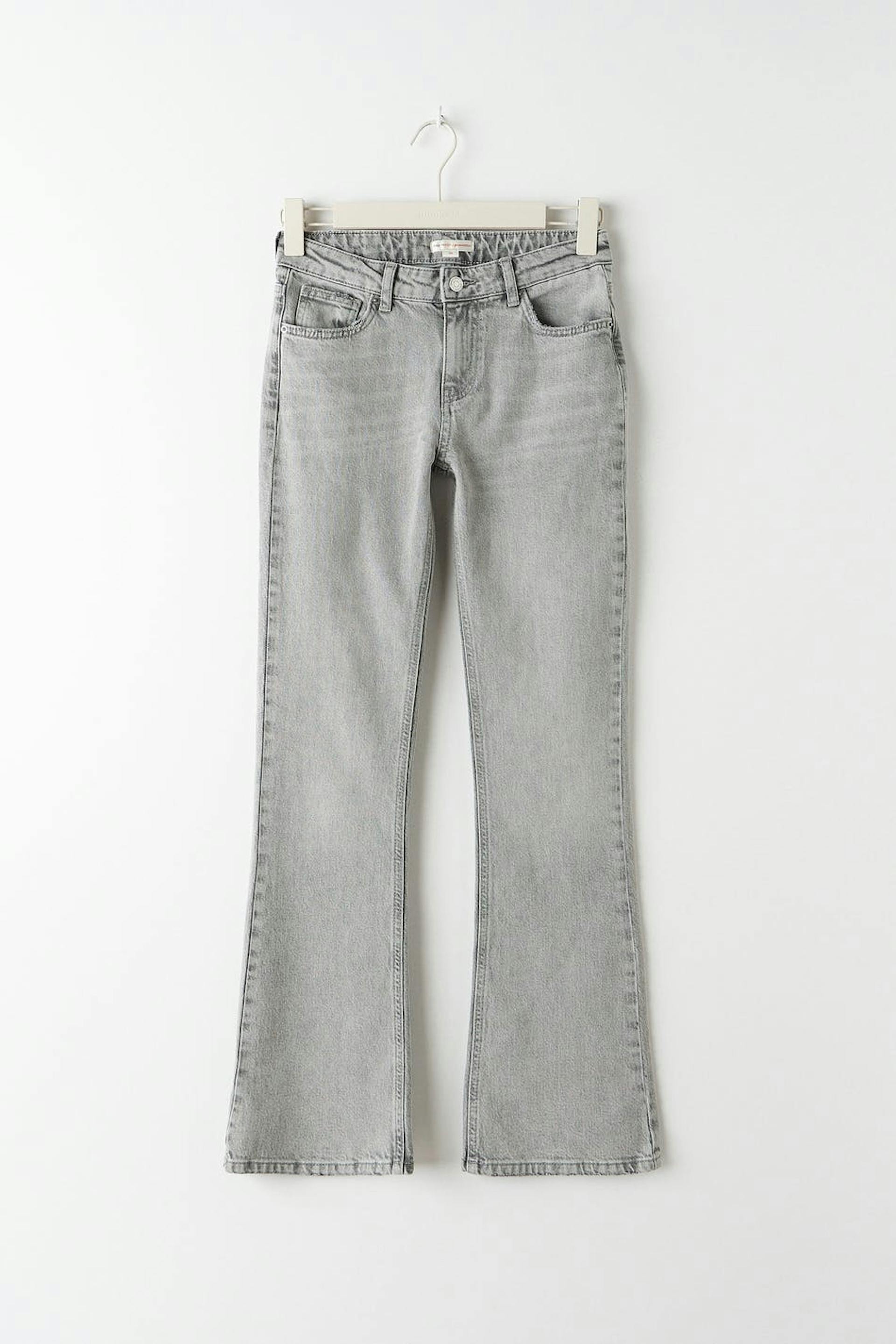 IZA & ELLE x YOUNG GINA TRICOT. Flare jeans with low waist. The jeans are grey and have flared legs with full length. They have comfort stretch, an adjustable elastic at the waist and pockets at the front and back. The jeans can easily be cut to the preferred length.