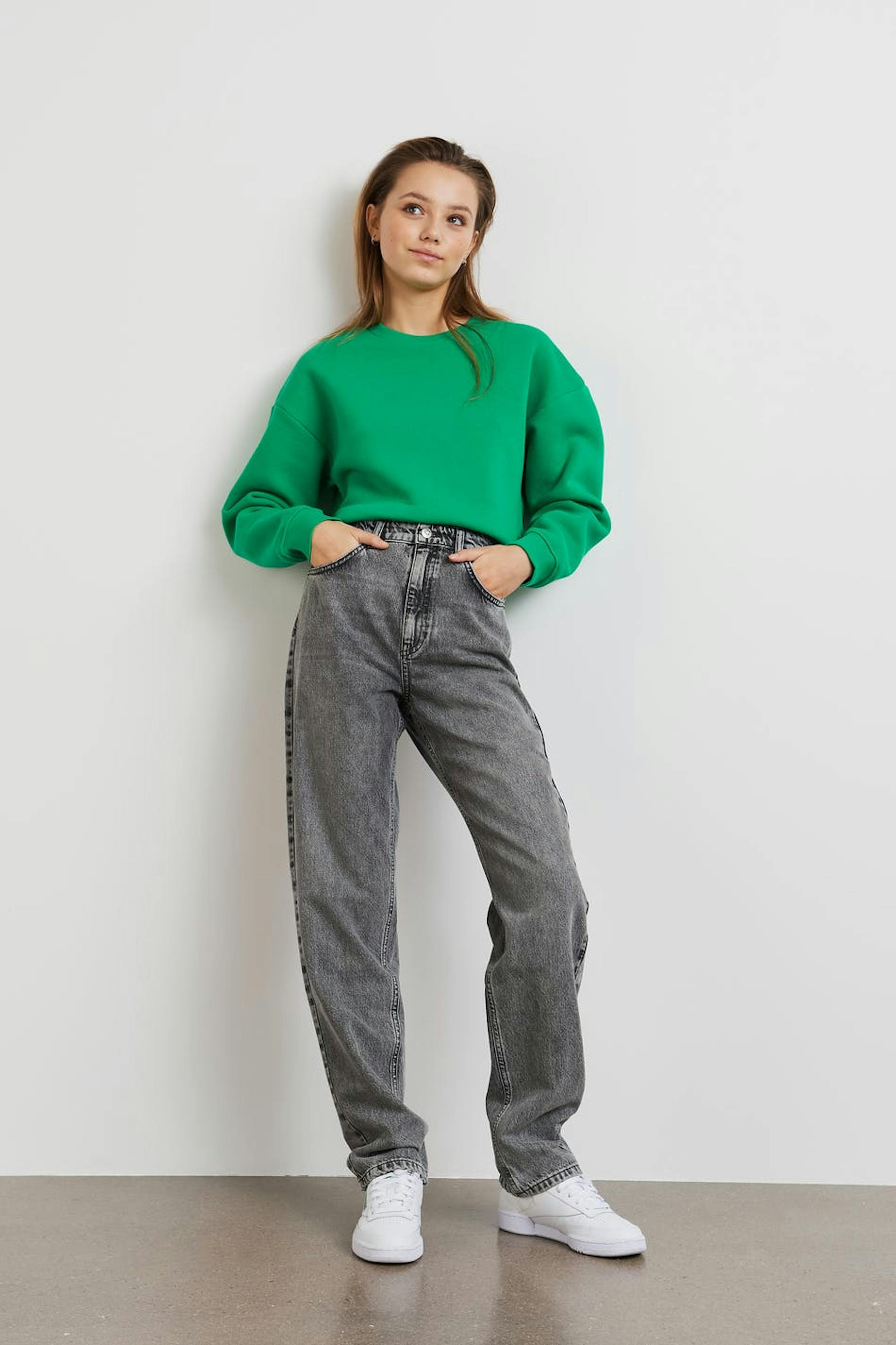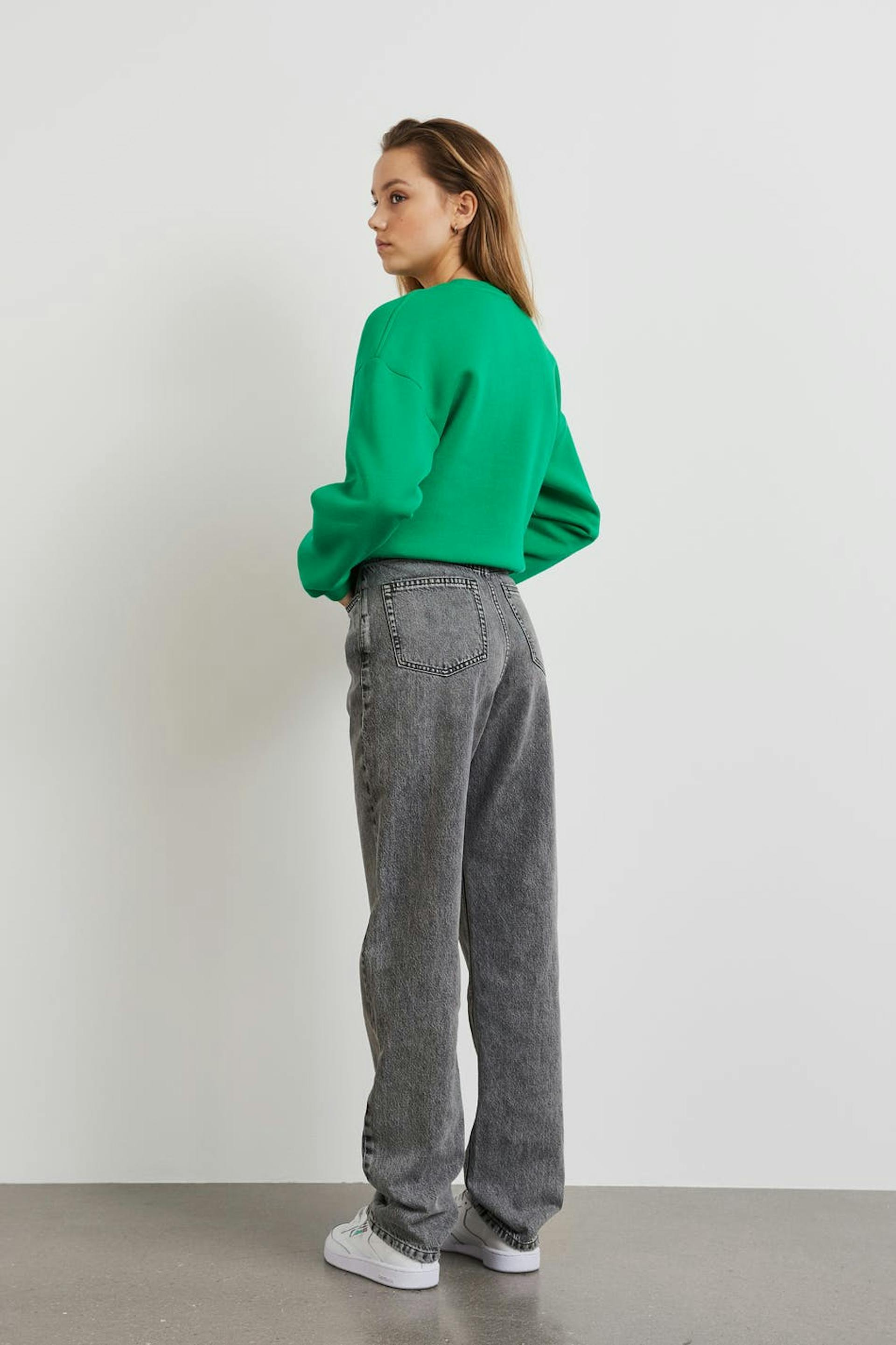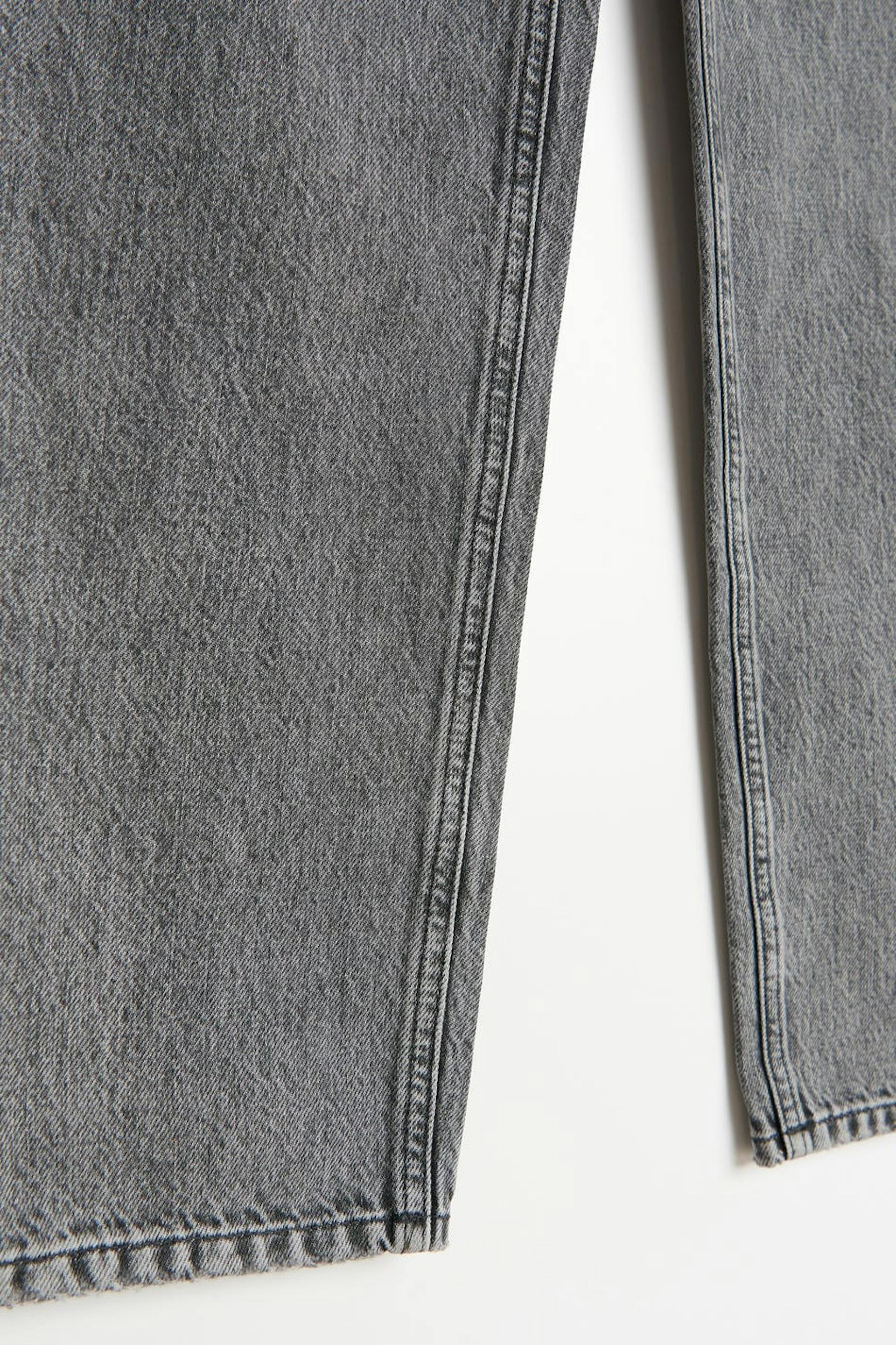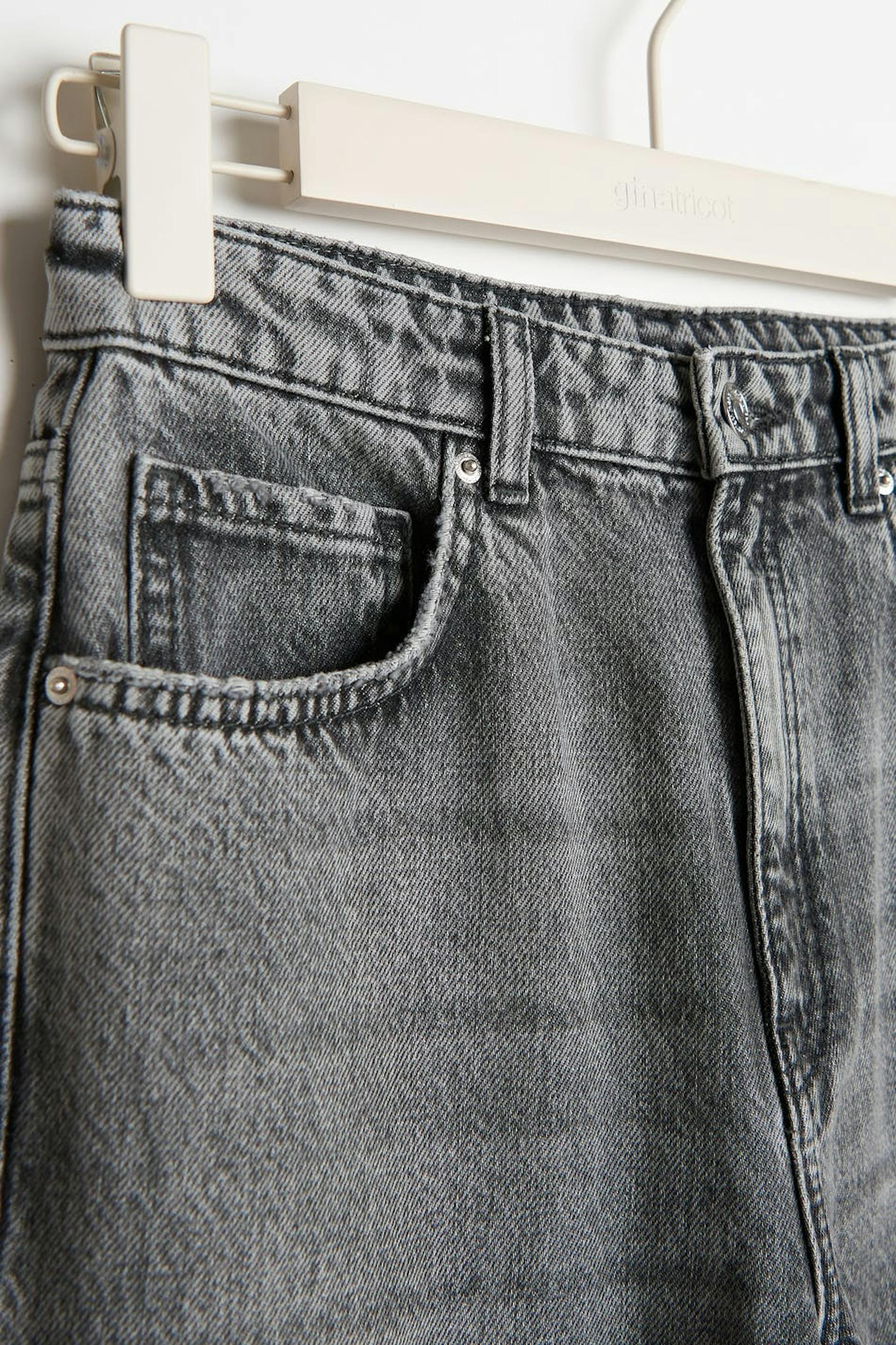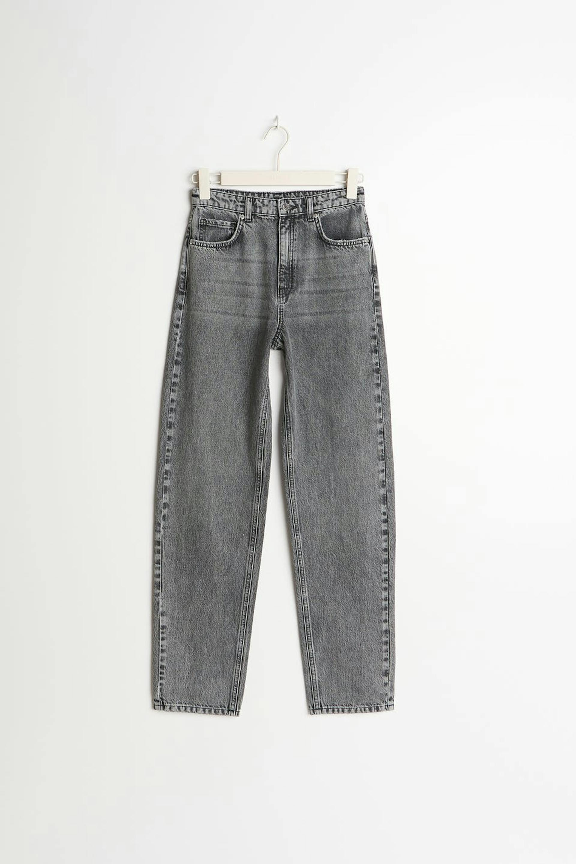 Highwaist jeans by our Young assortment with high waist. The jeans is grey and has a 90s inspired, non-stretch fit. It has zip fly, straight trouser legs with full length, adjustable elastic at the waist and pockets at the front and back.