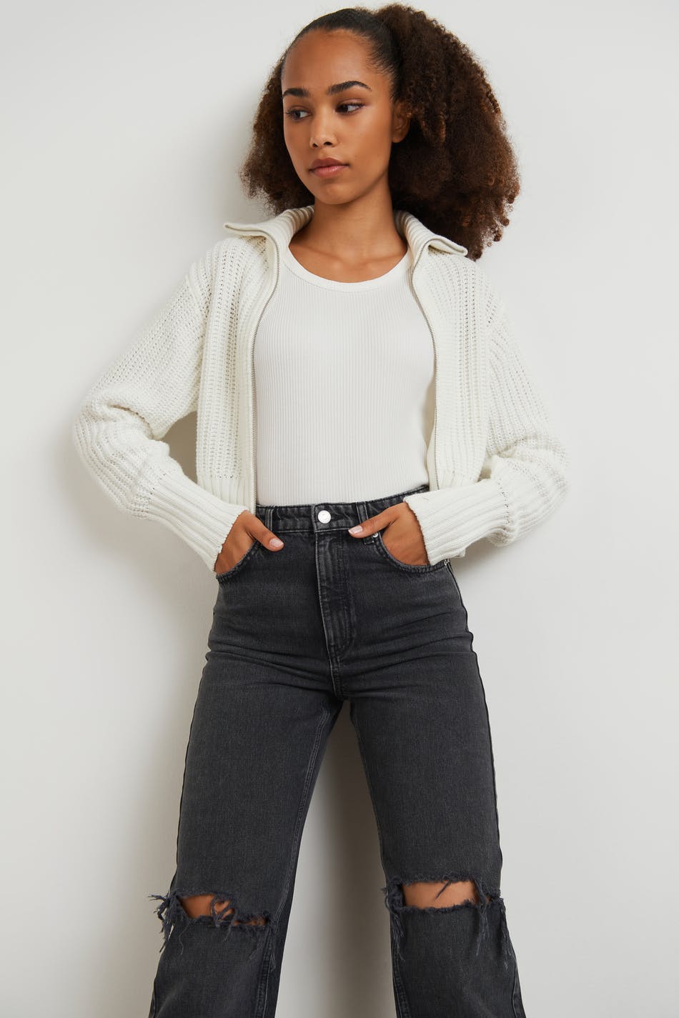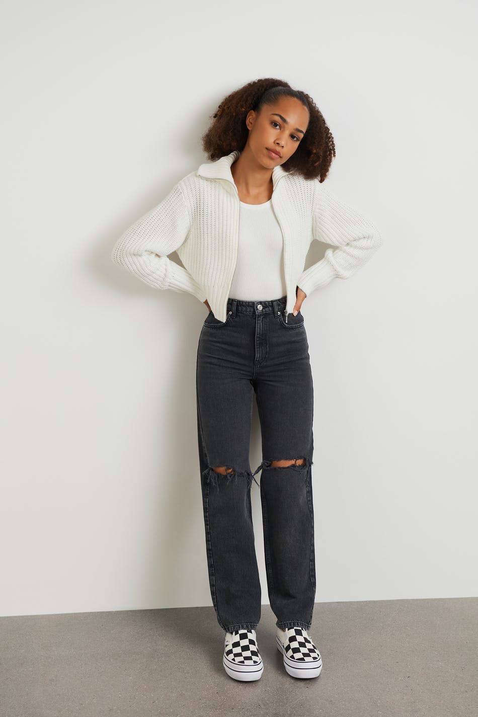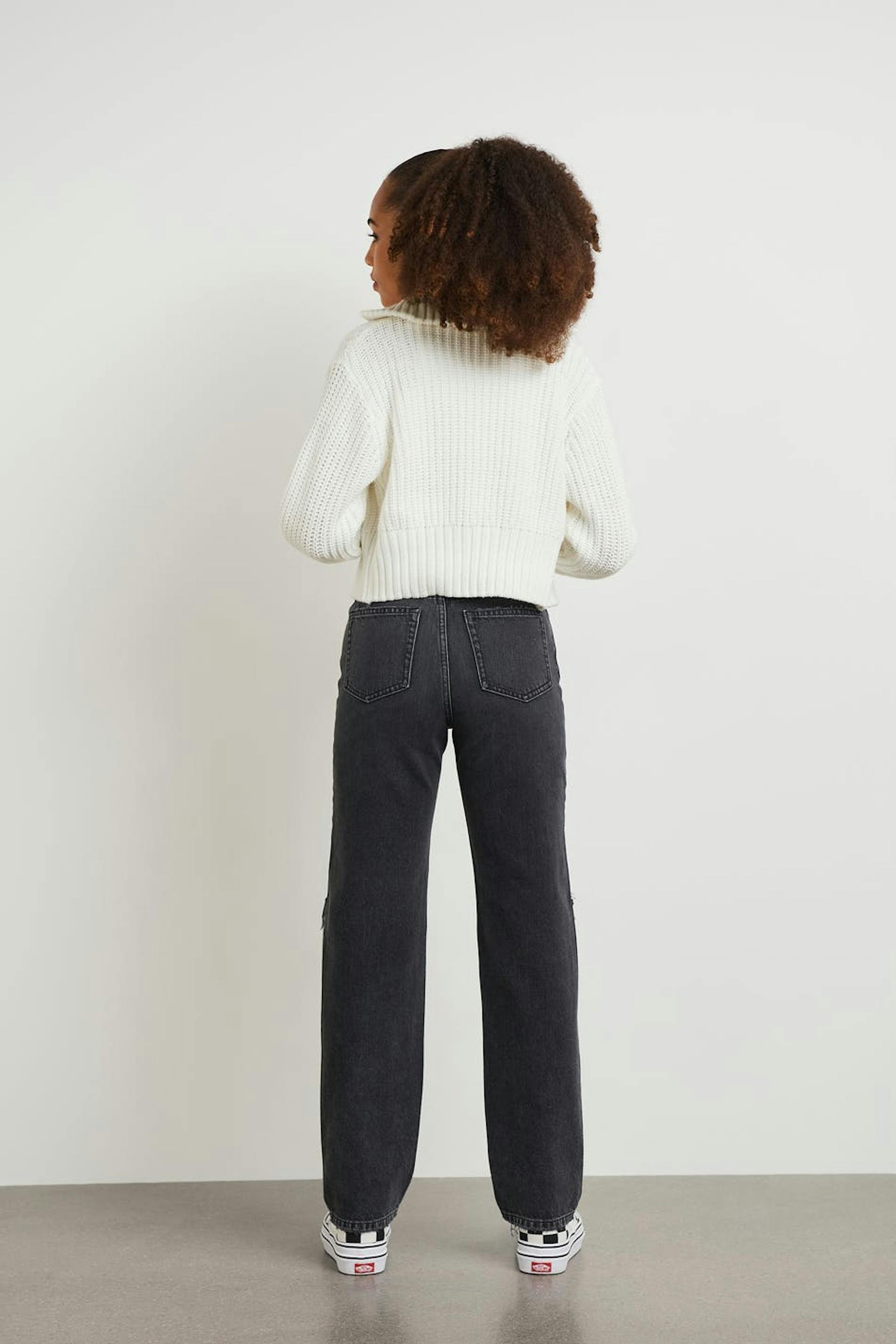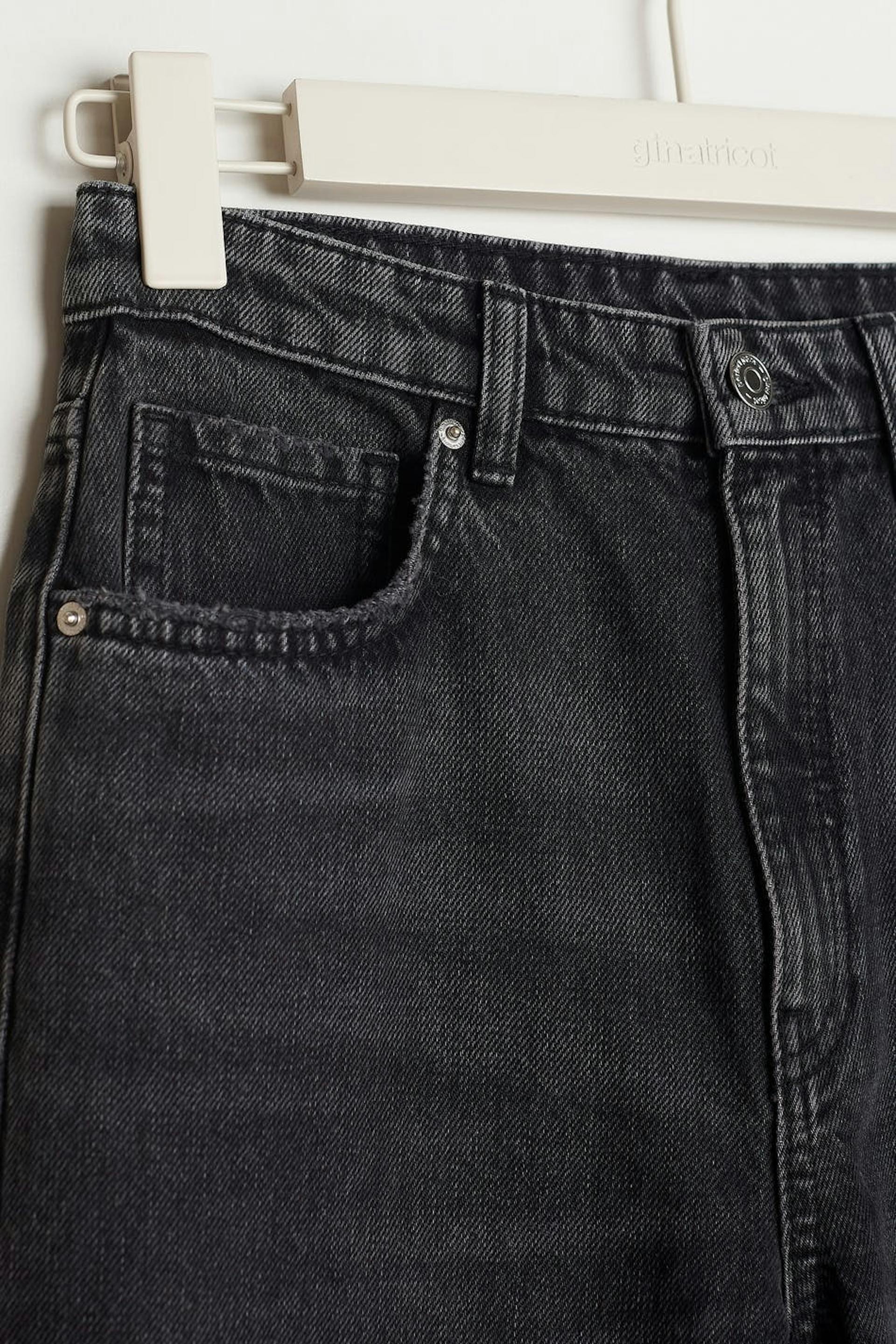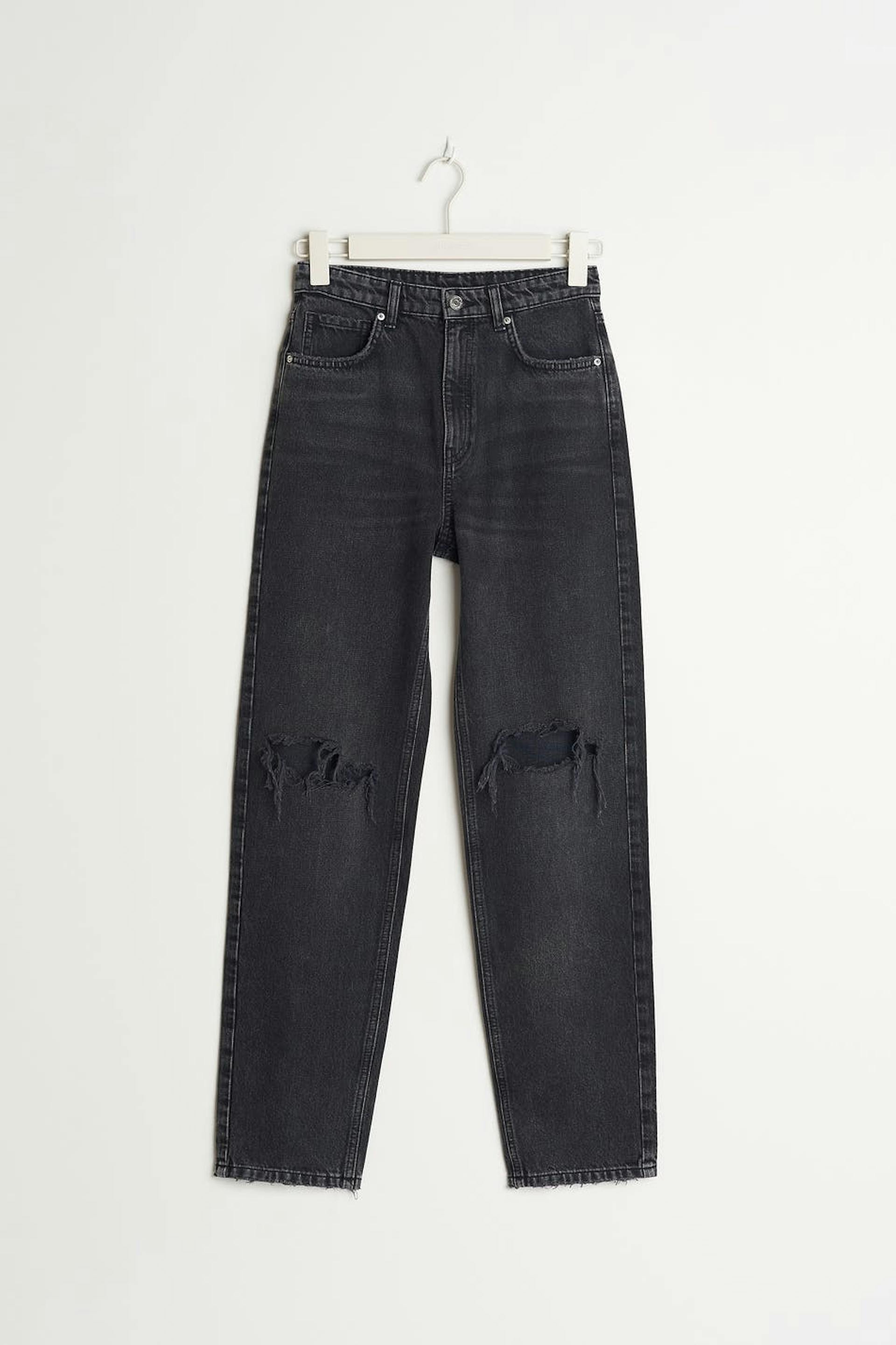Highwaist jeans by our Young assortment with ripped knees. The jeans is black and has high waist. It has a 90s inspired, non-stretch fit, zip fly, straight trouser legs with full length, adjustable elastic at the waist and pockets at the front and back.