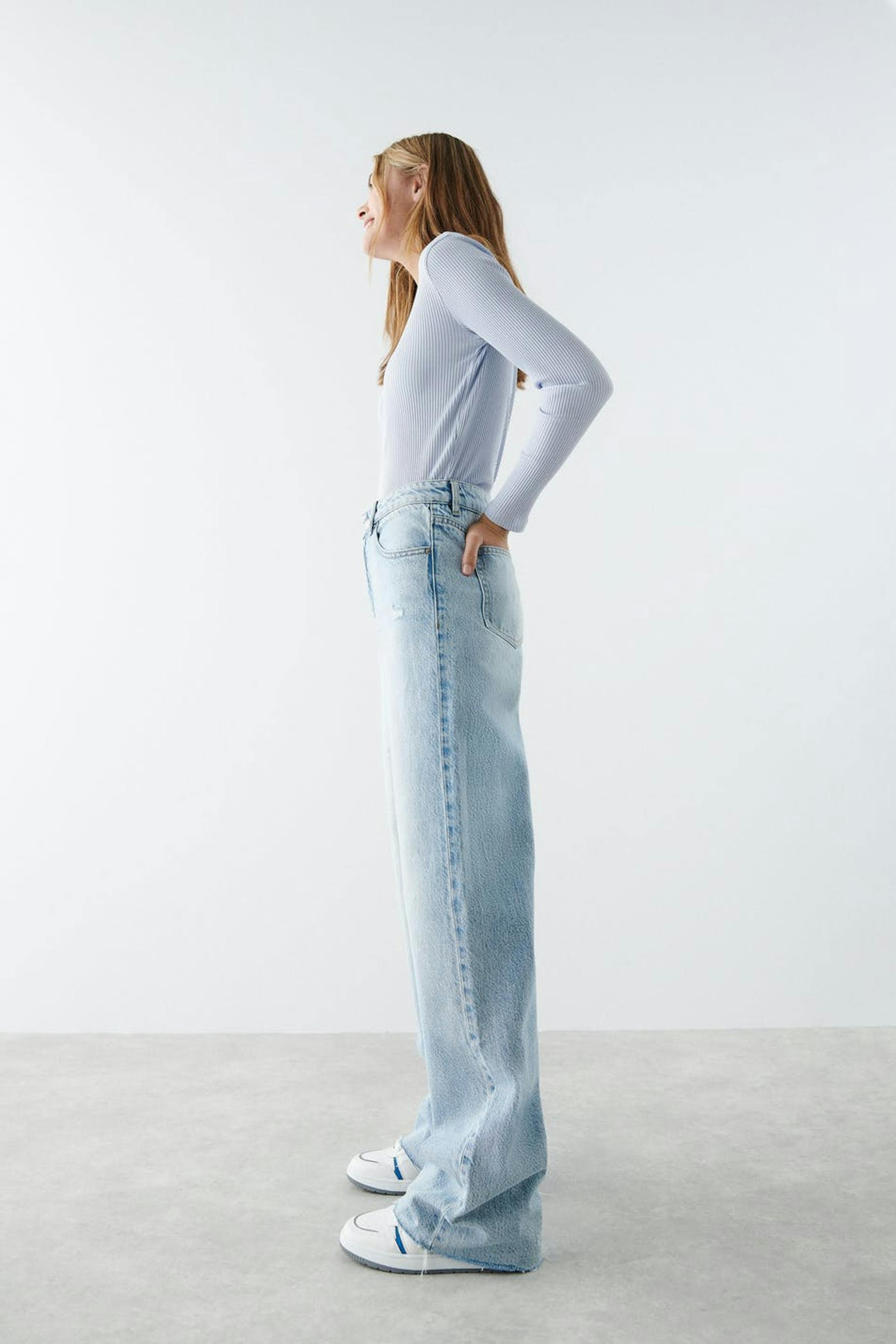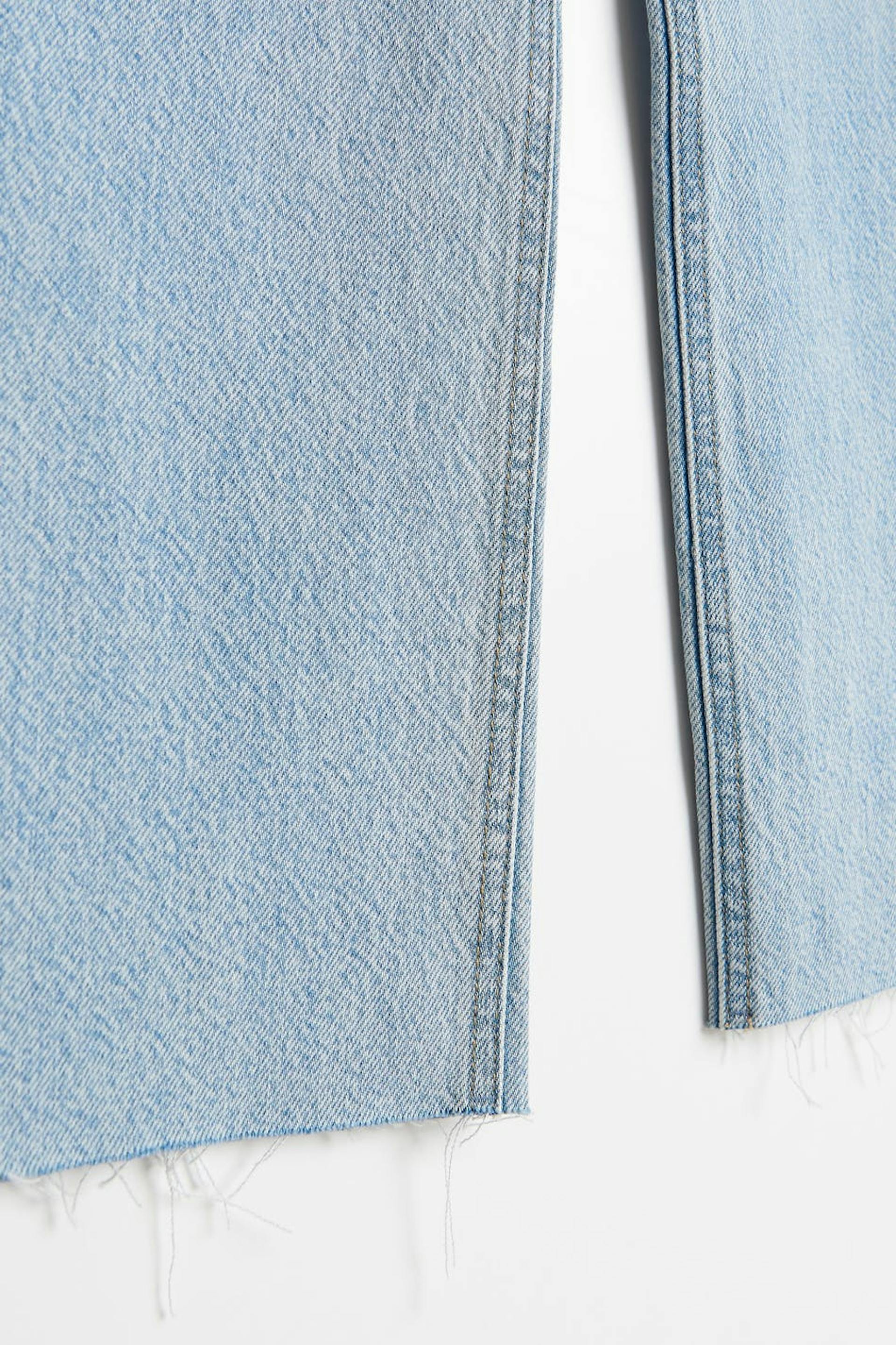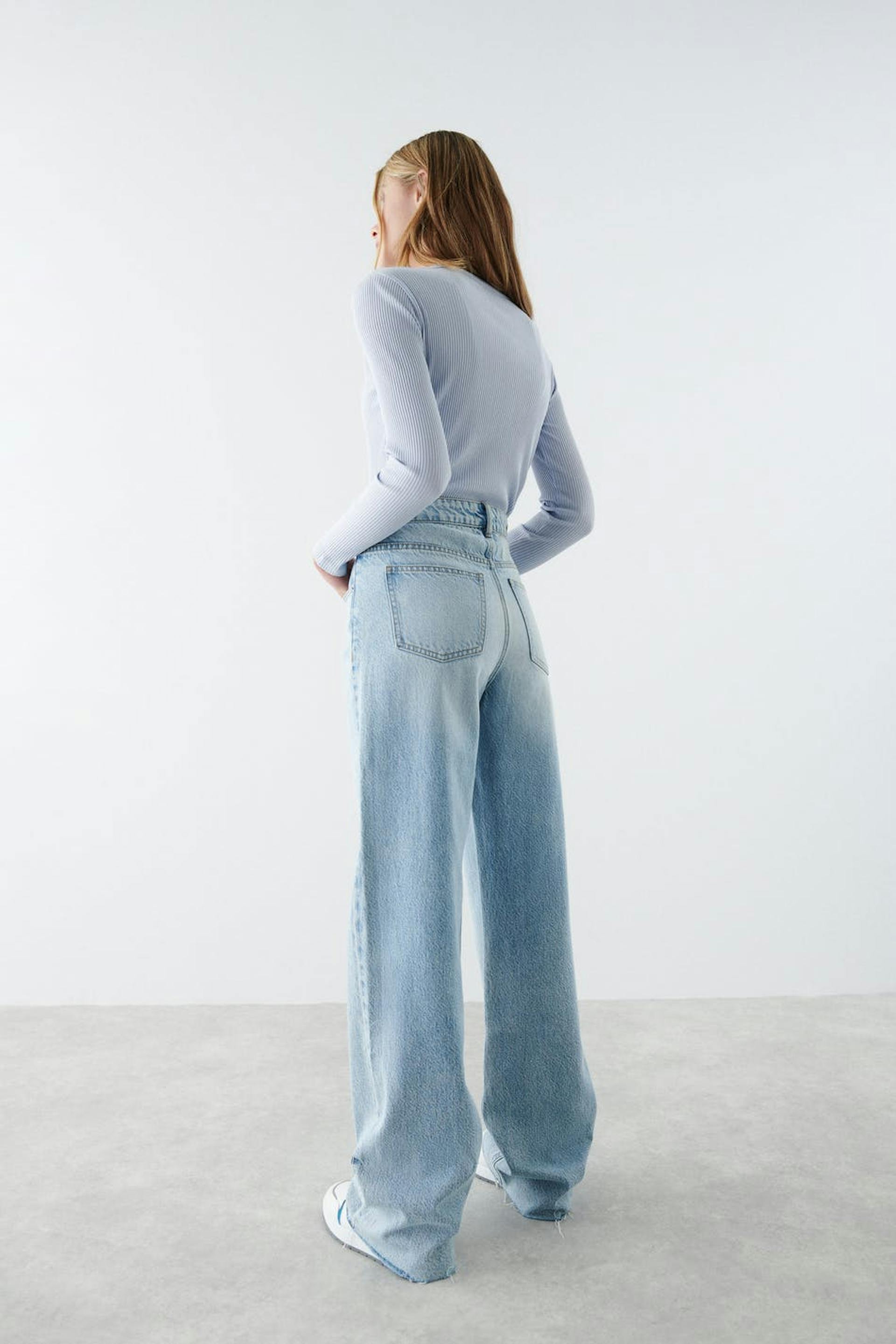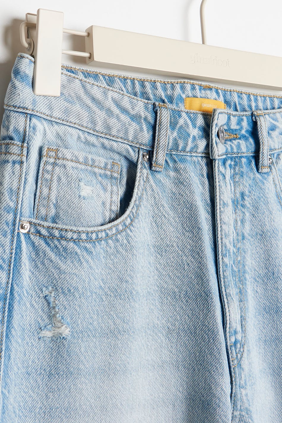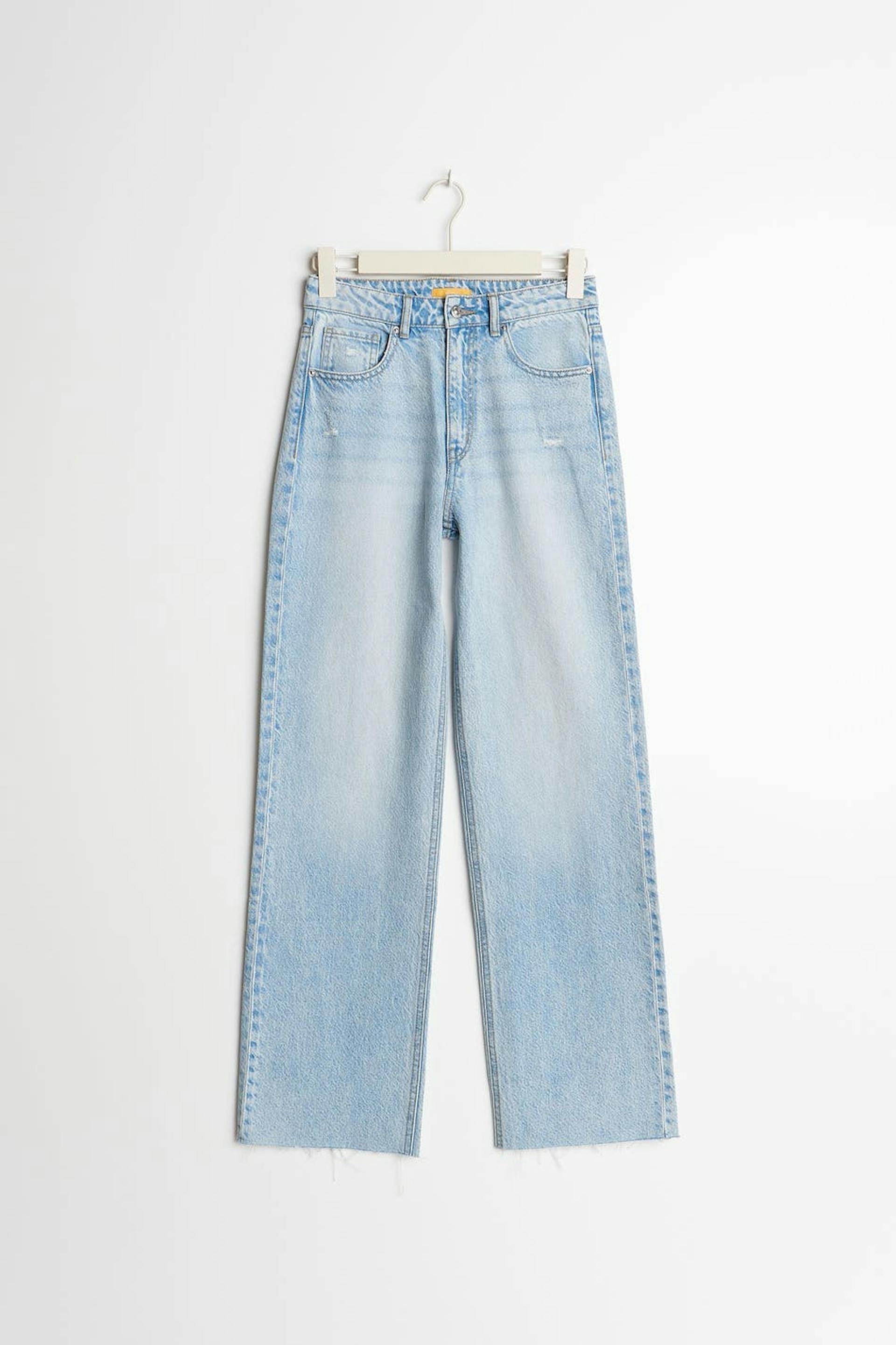 Wide jeans by our Young assortment with high waist. The jeans is blue and has a zip fly. It is made of non-stretch denim and has adjustable elastic at the waist, pockets at the front and back and extra long leg length with raw edge at the end of the legs. The jeans can easily be cut to the preferred length.