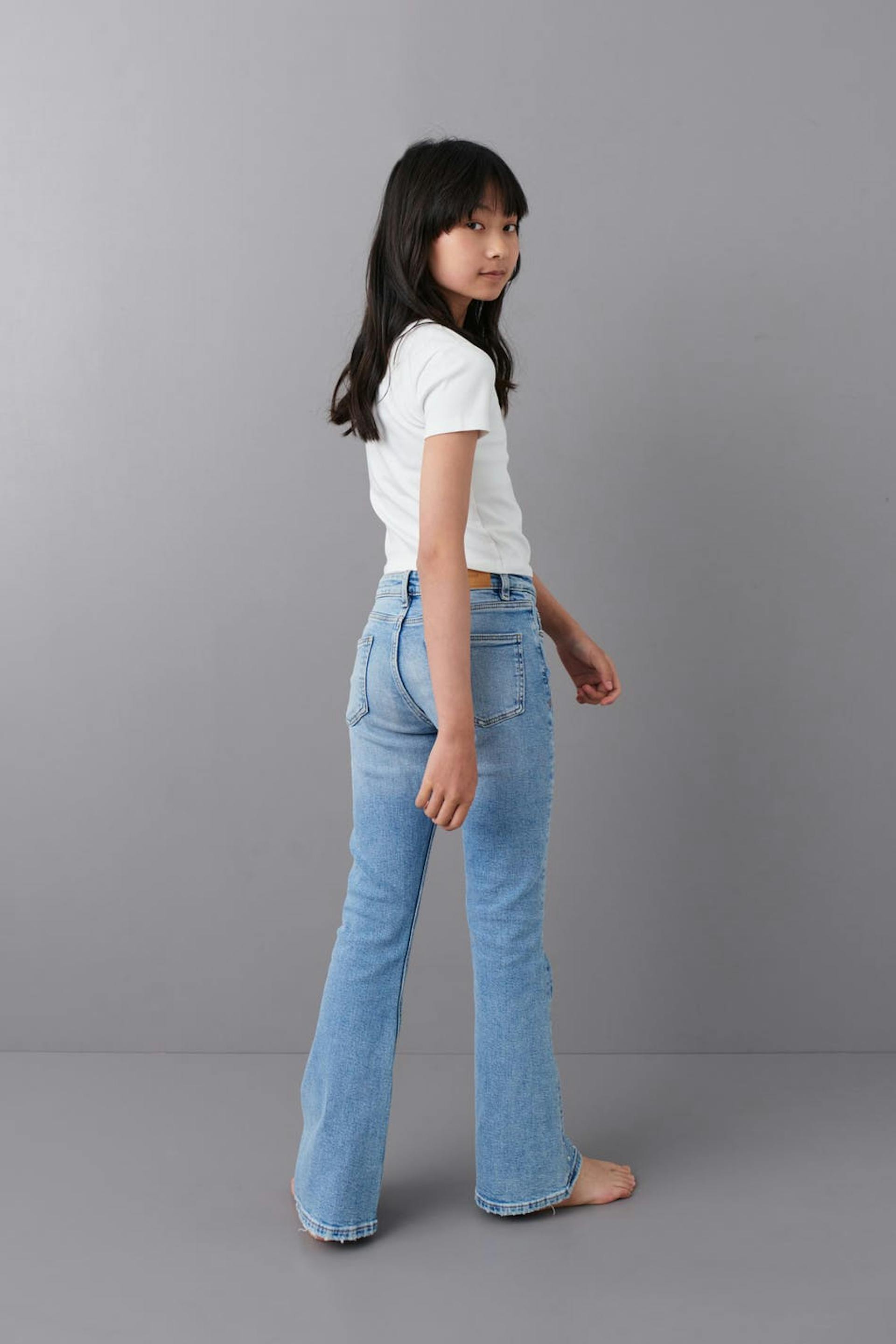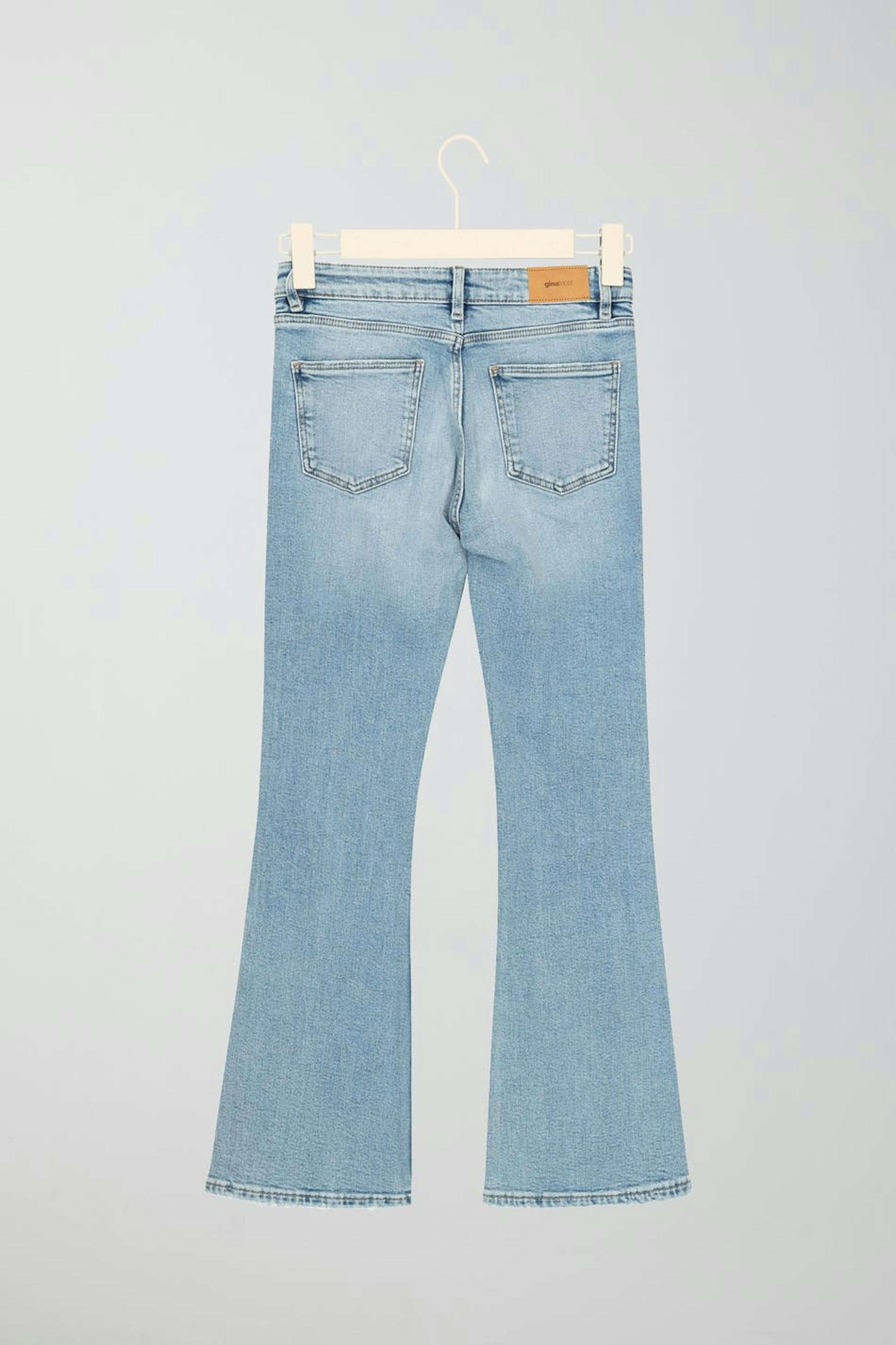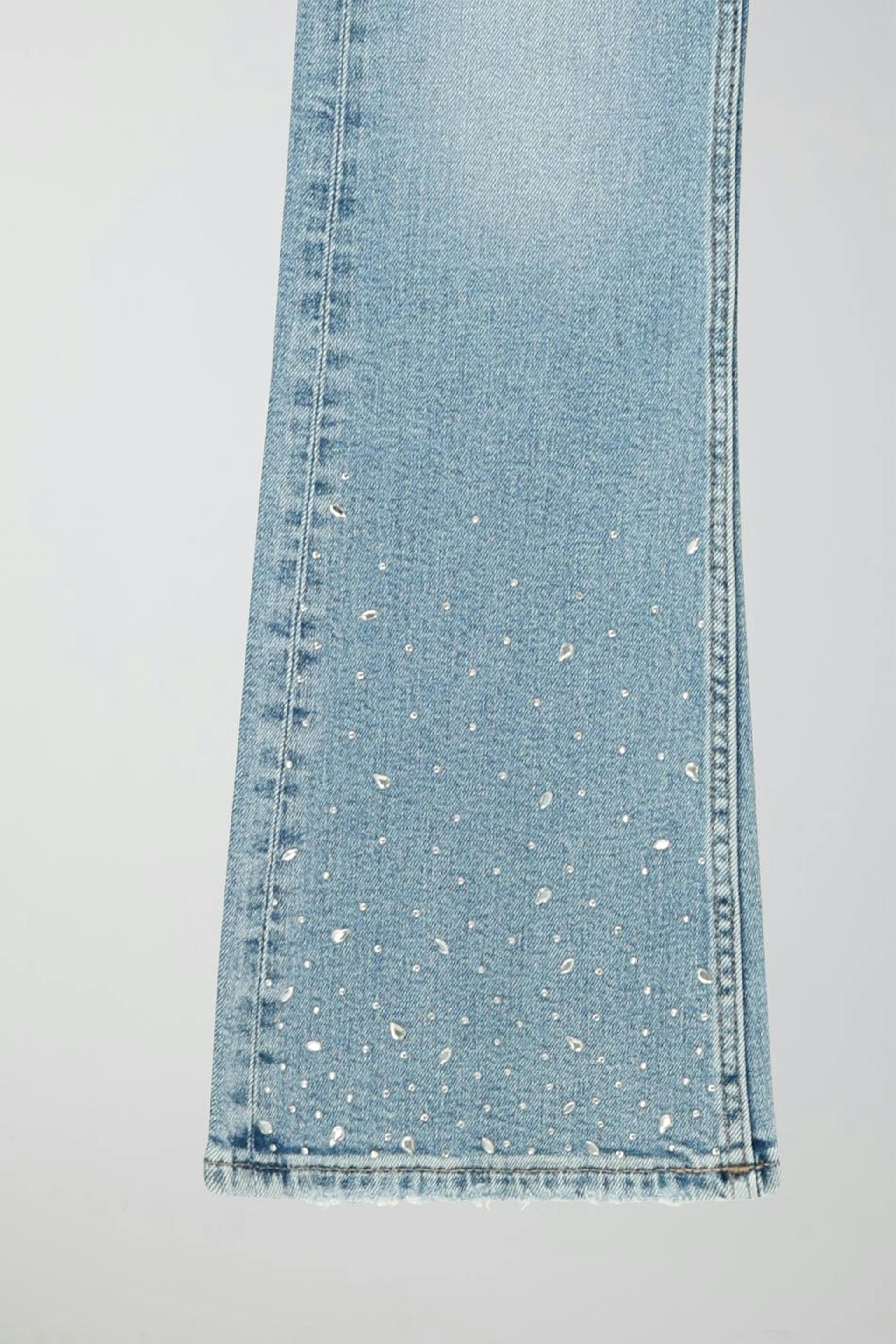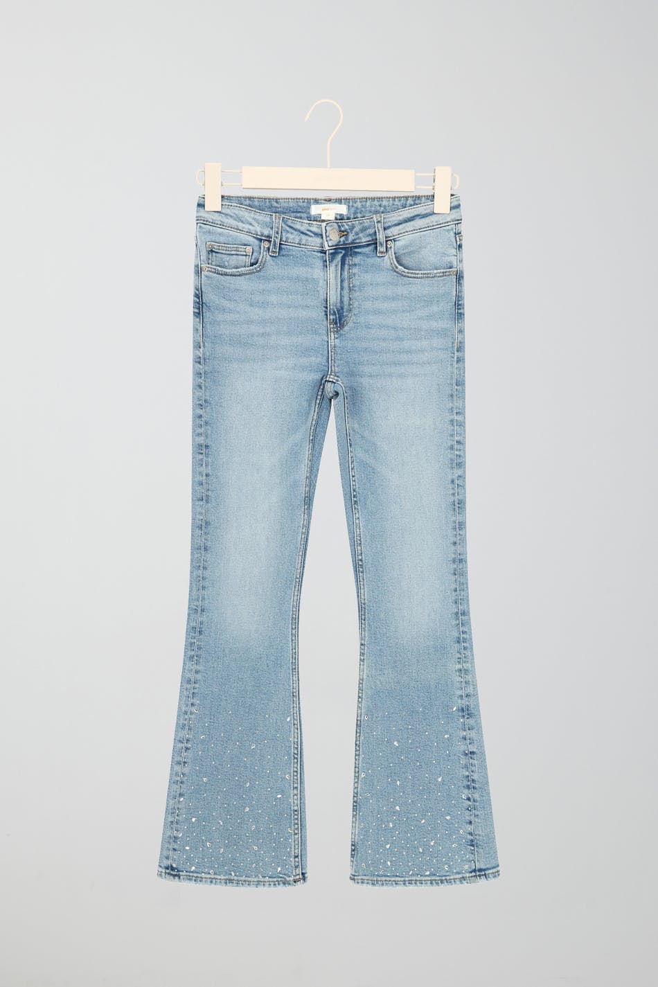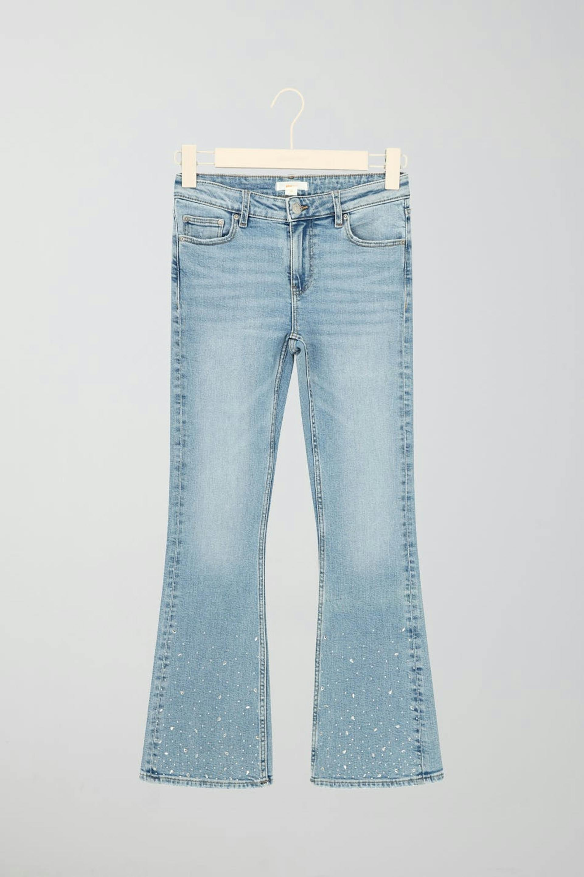 Boot cut jeans by Gina Tricot Young with rhinestone embellishment. The jeans are blue and have low waist. They have low stretch, flared legs with full length, adjustable elastic at the waist and pockets at the front and back.
