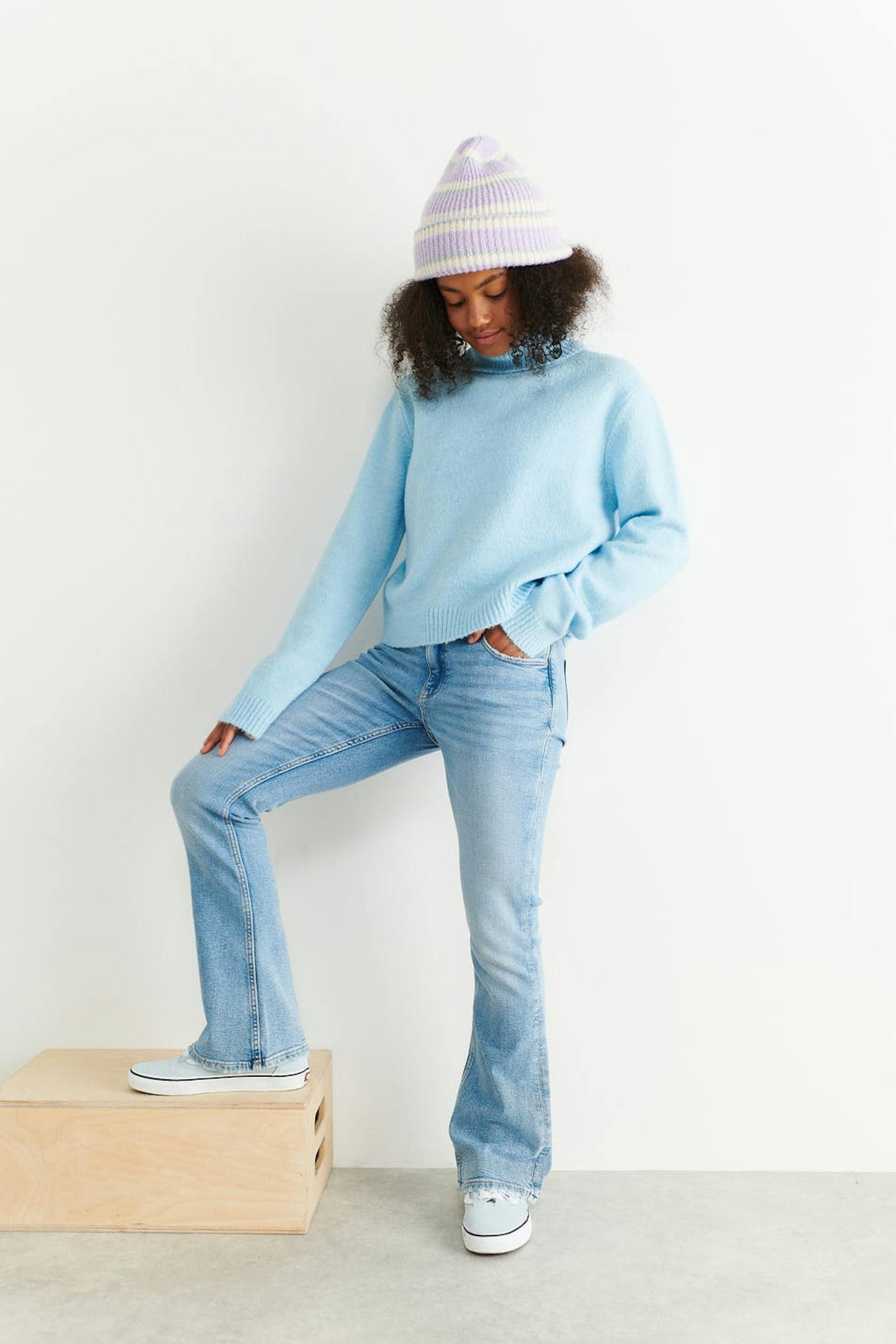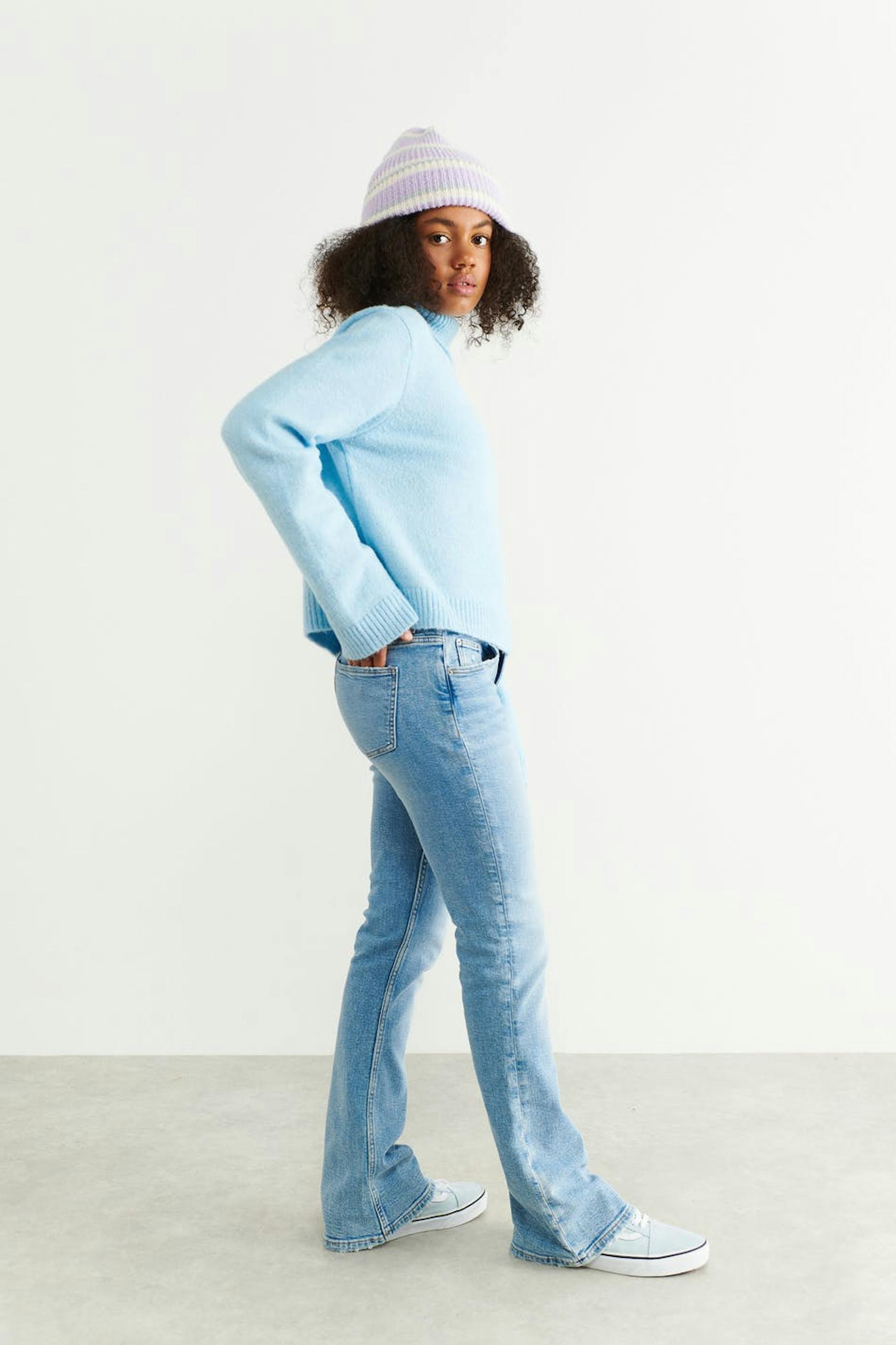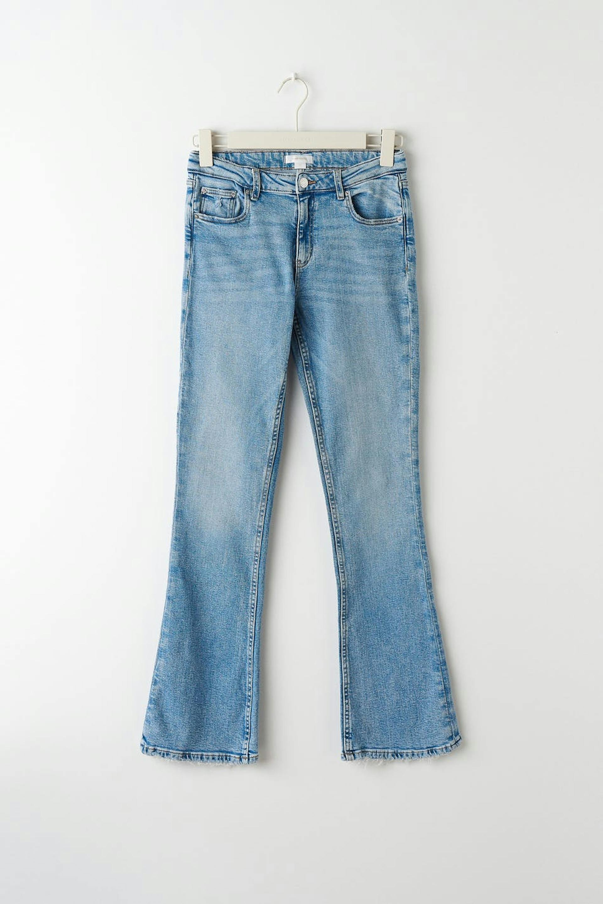 Y2K boot cut jeans with low waist in low stretch denim. The jeans are blue and have flared legs with full length. They have zip fly and adjustable elastic at the waist.