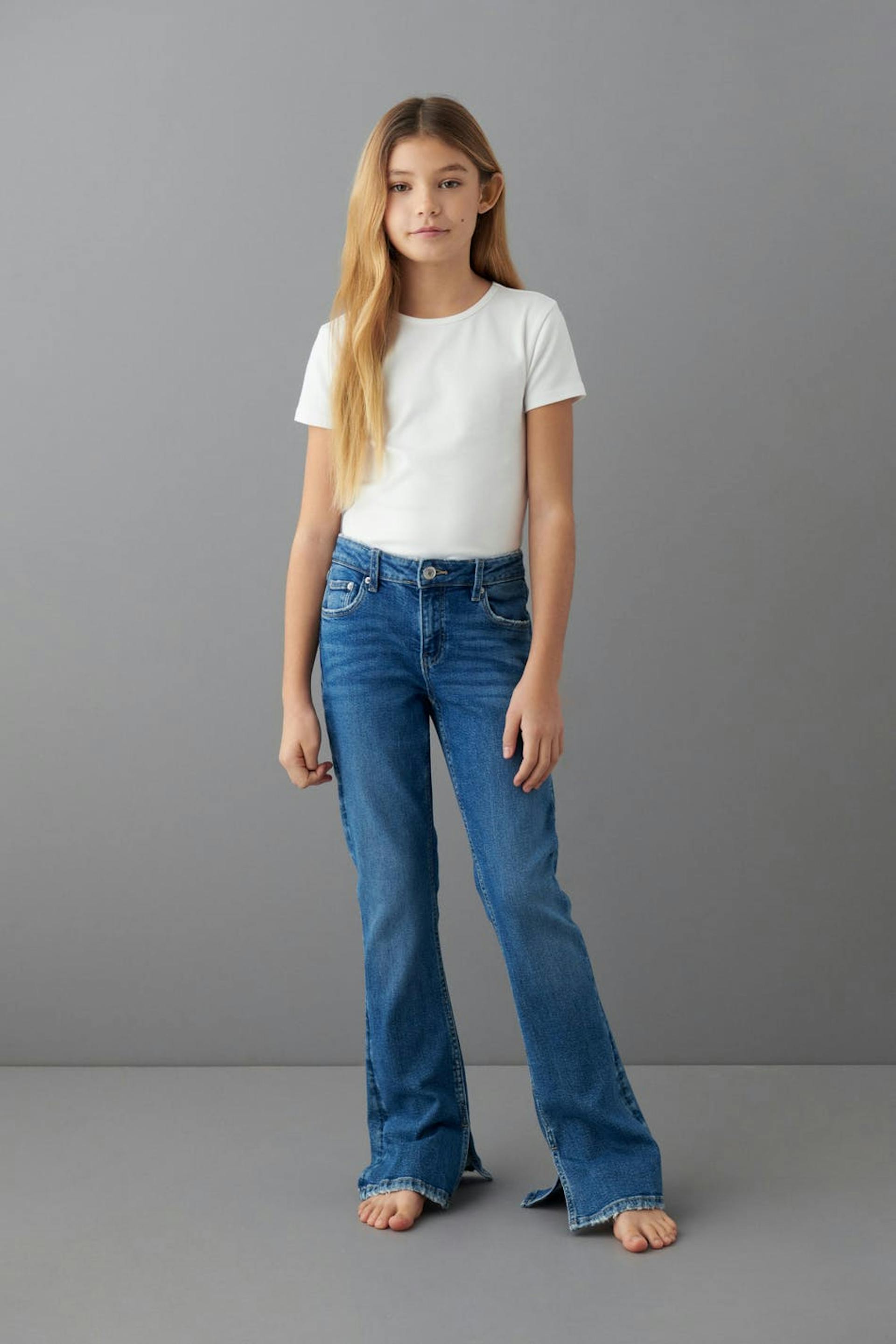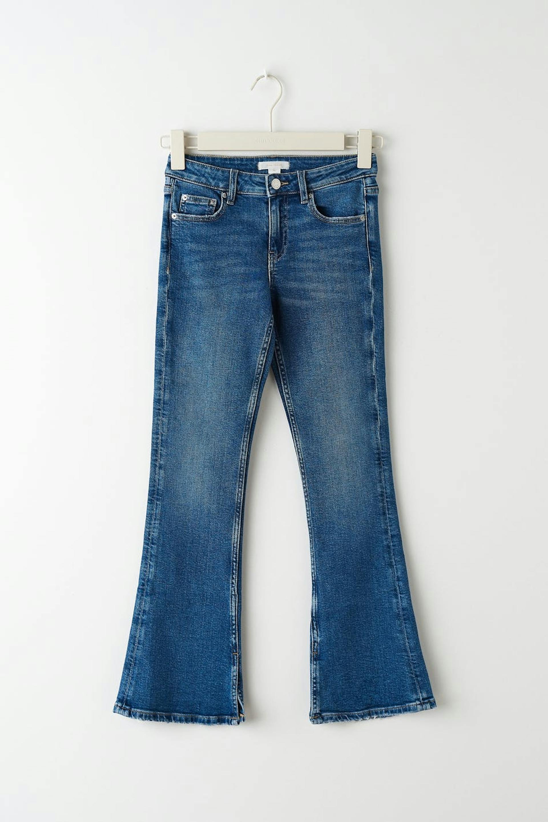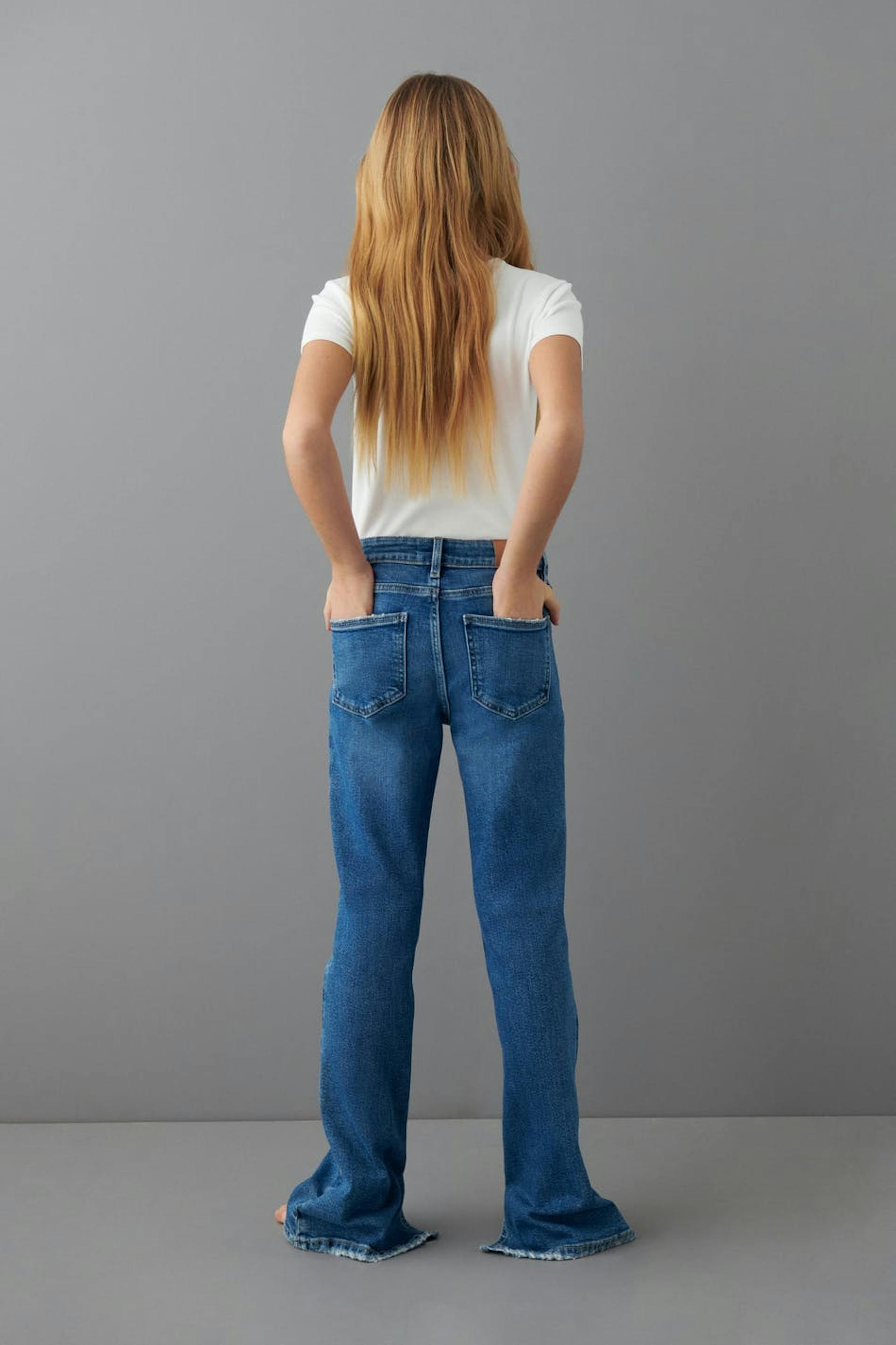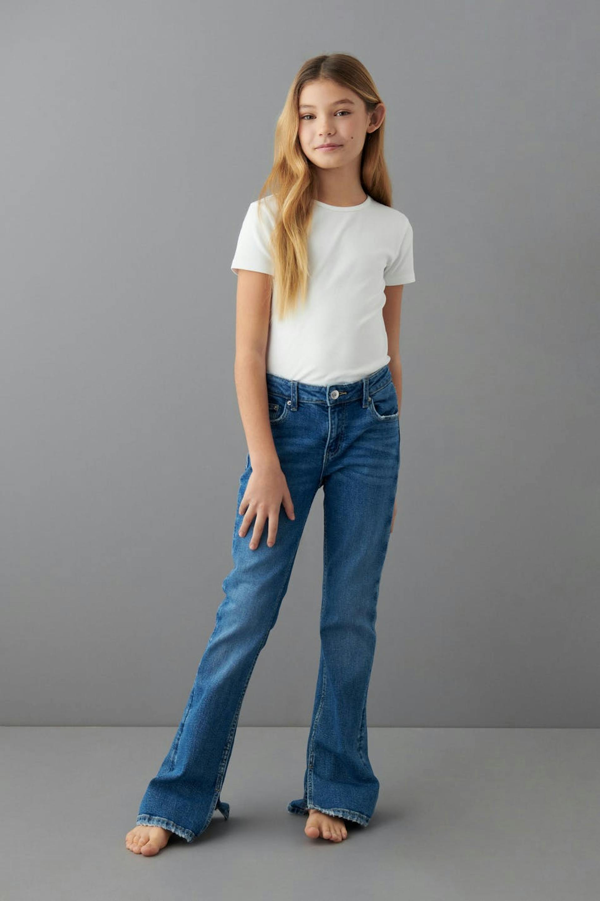 Boot cut jeans by our Young assortment with low waist in low stretch denim. The jeans are blue and have flared legs with full length. They have adjustable elastic at the waist and pockets at the front and back.