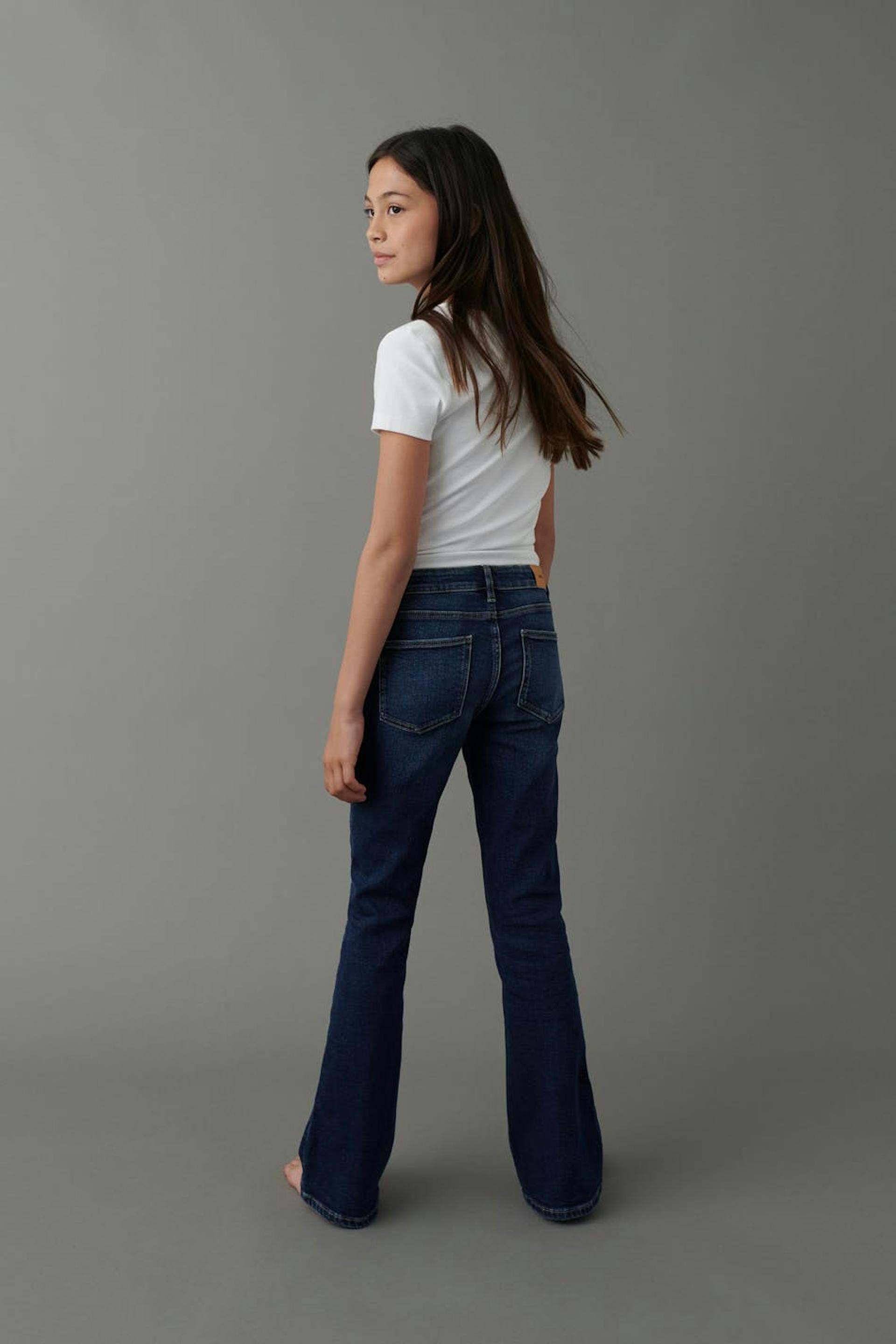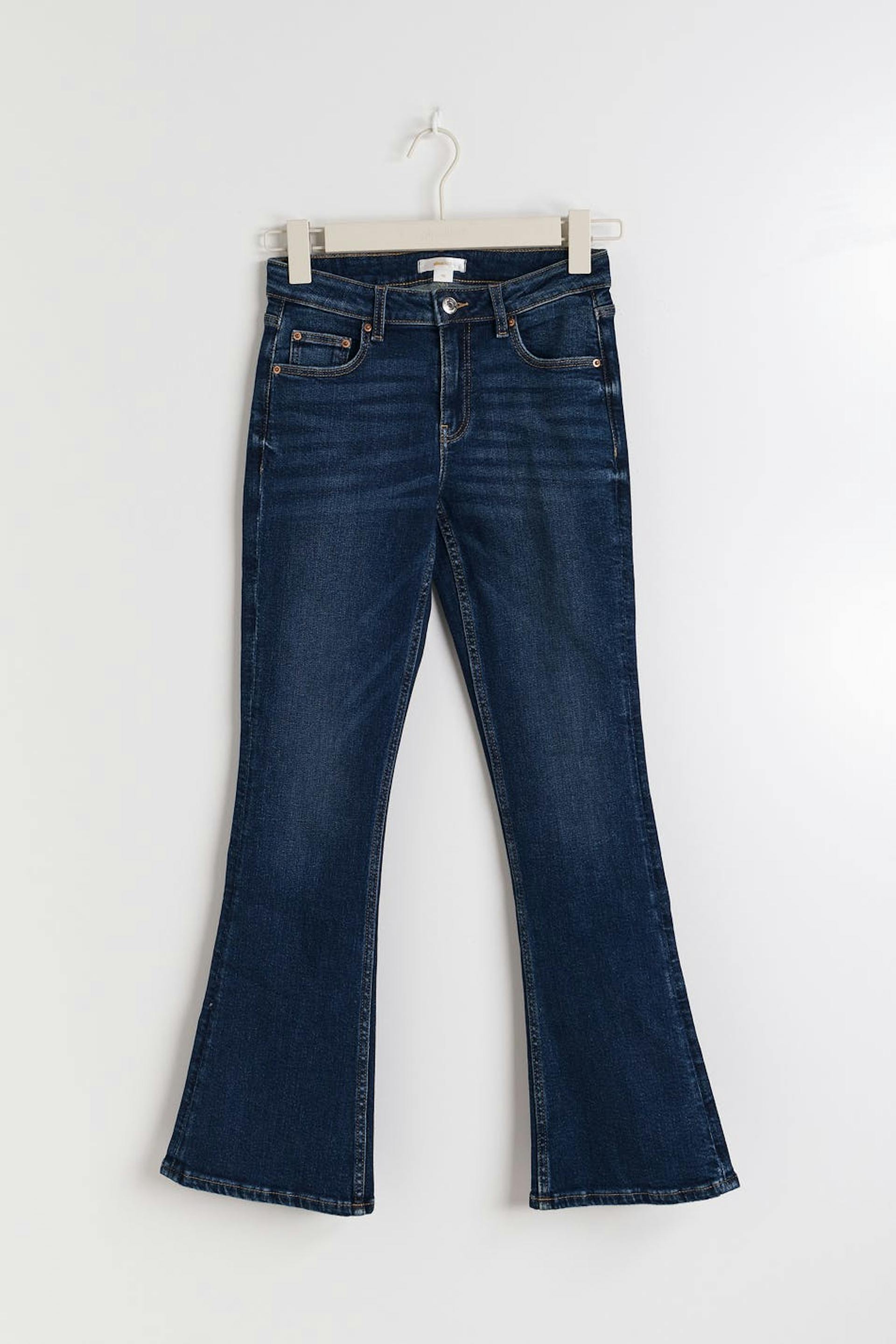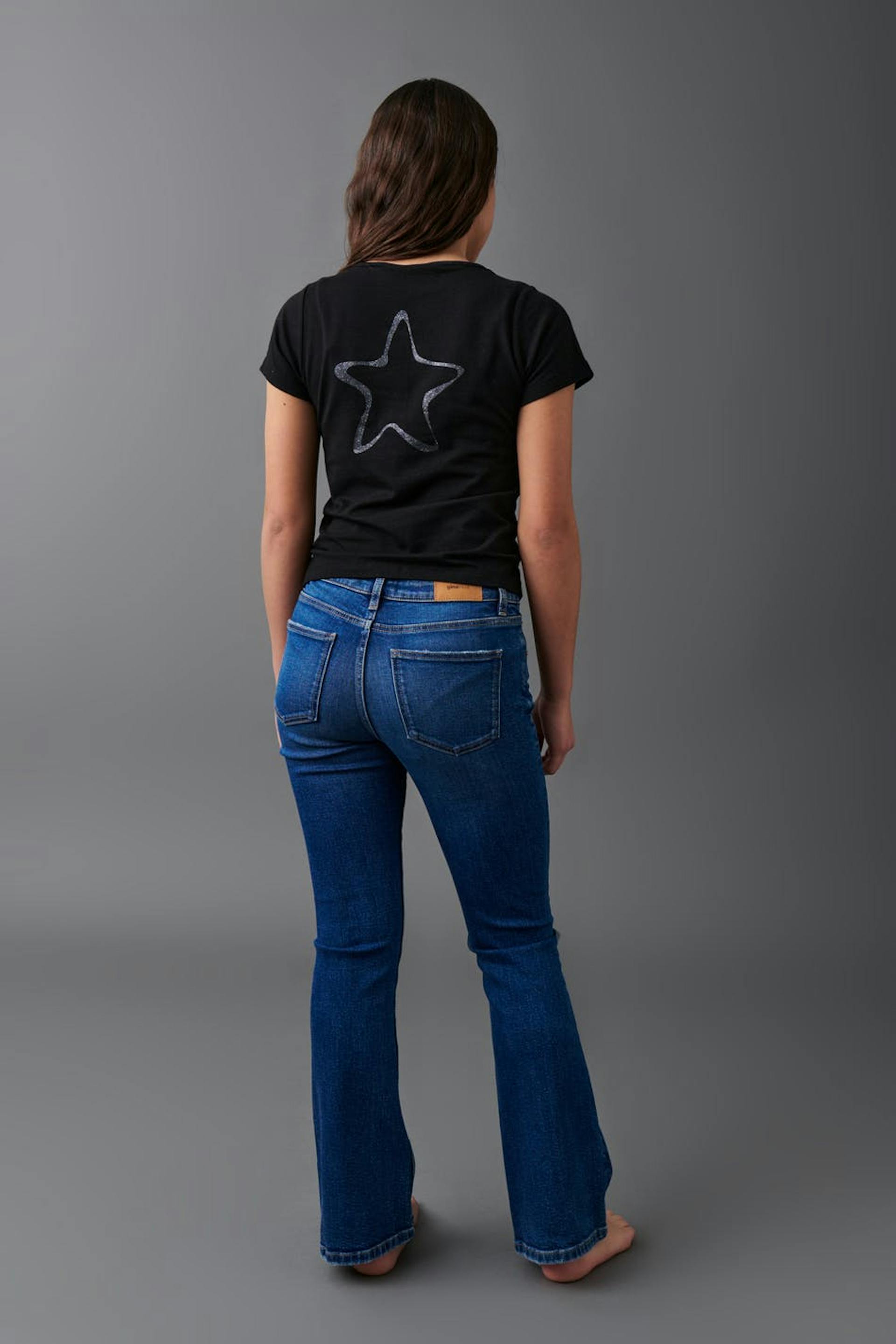 Boot cut jeans by Gina Tricot Young with low waist. The jeans are blue and have flared legs in stretch denim. They have zip fly, adjustable elastic at the waist and pockets at the front and back.