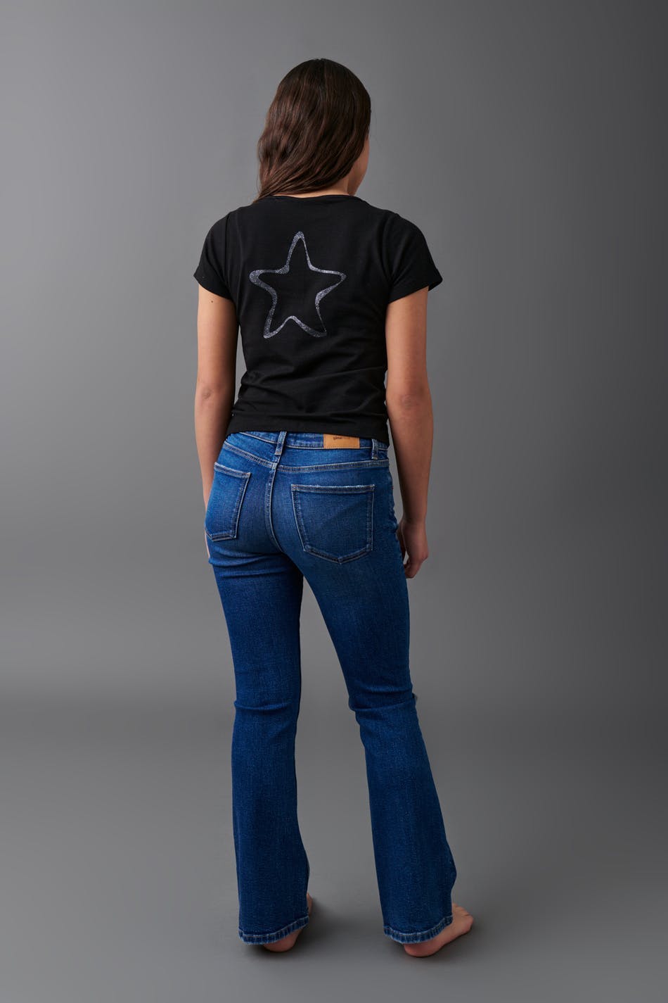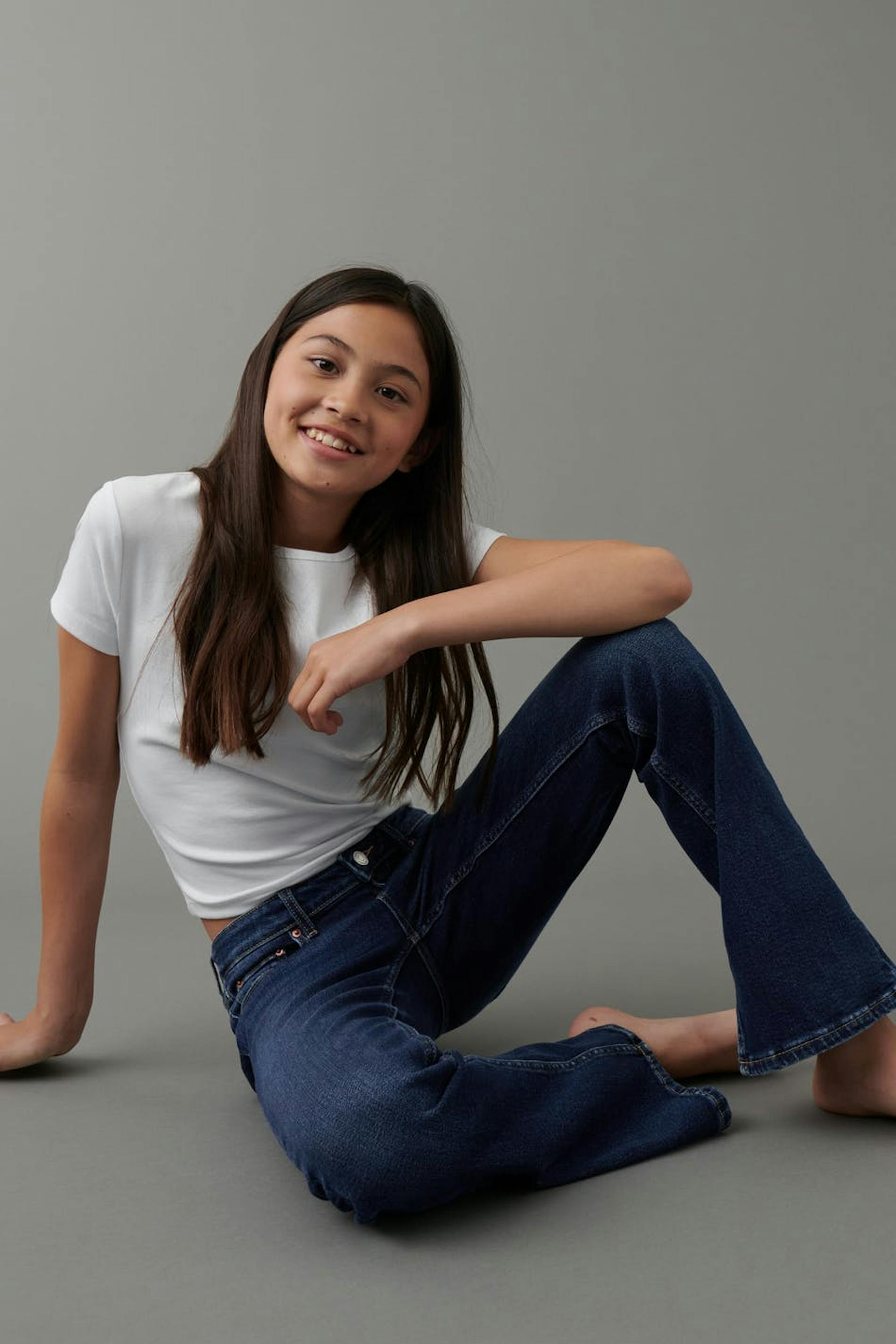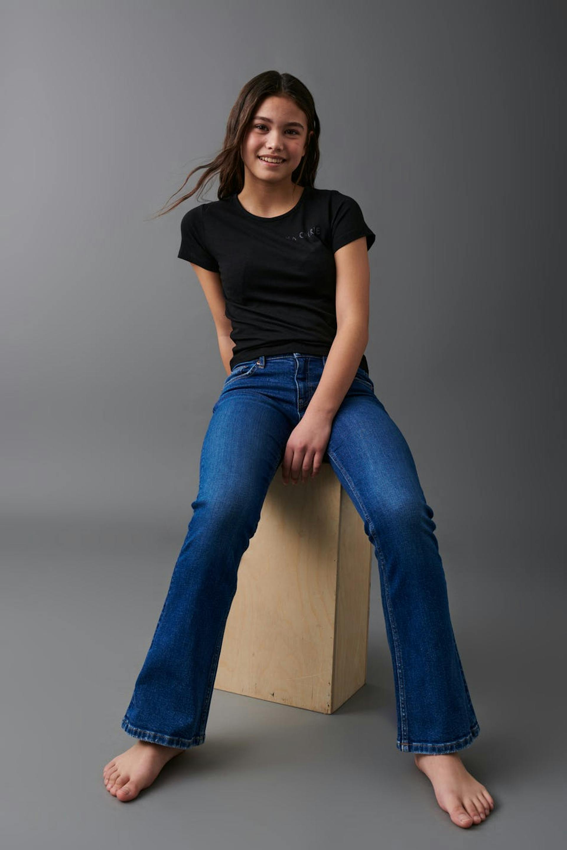 Boot cut jeans by Gina Tricot Young with low waist. The jeans are blue and have flared legs in stretch denim. They have zip fly, adjustable elastic at the waist and pockets at the front and back.