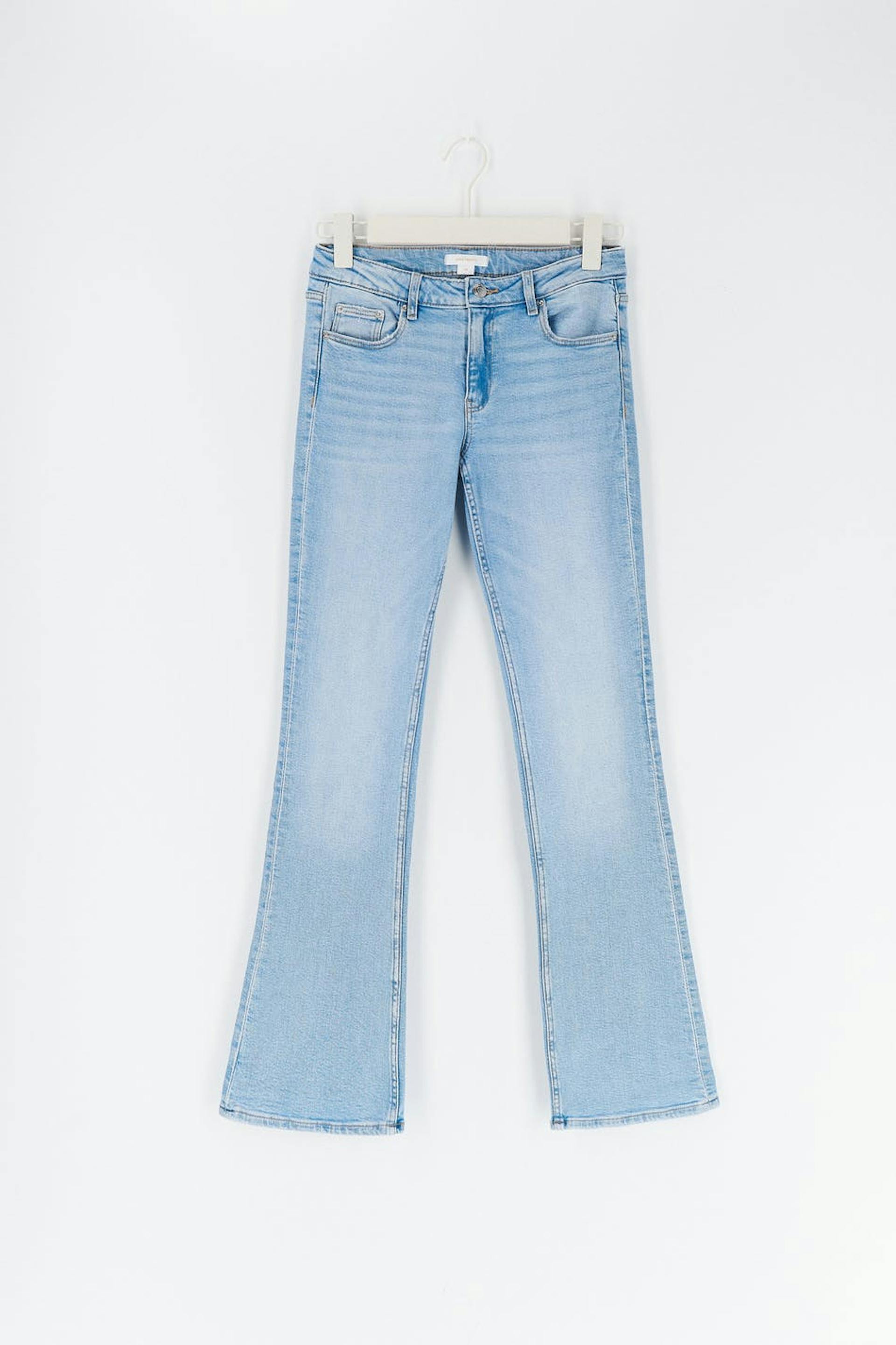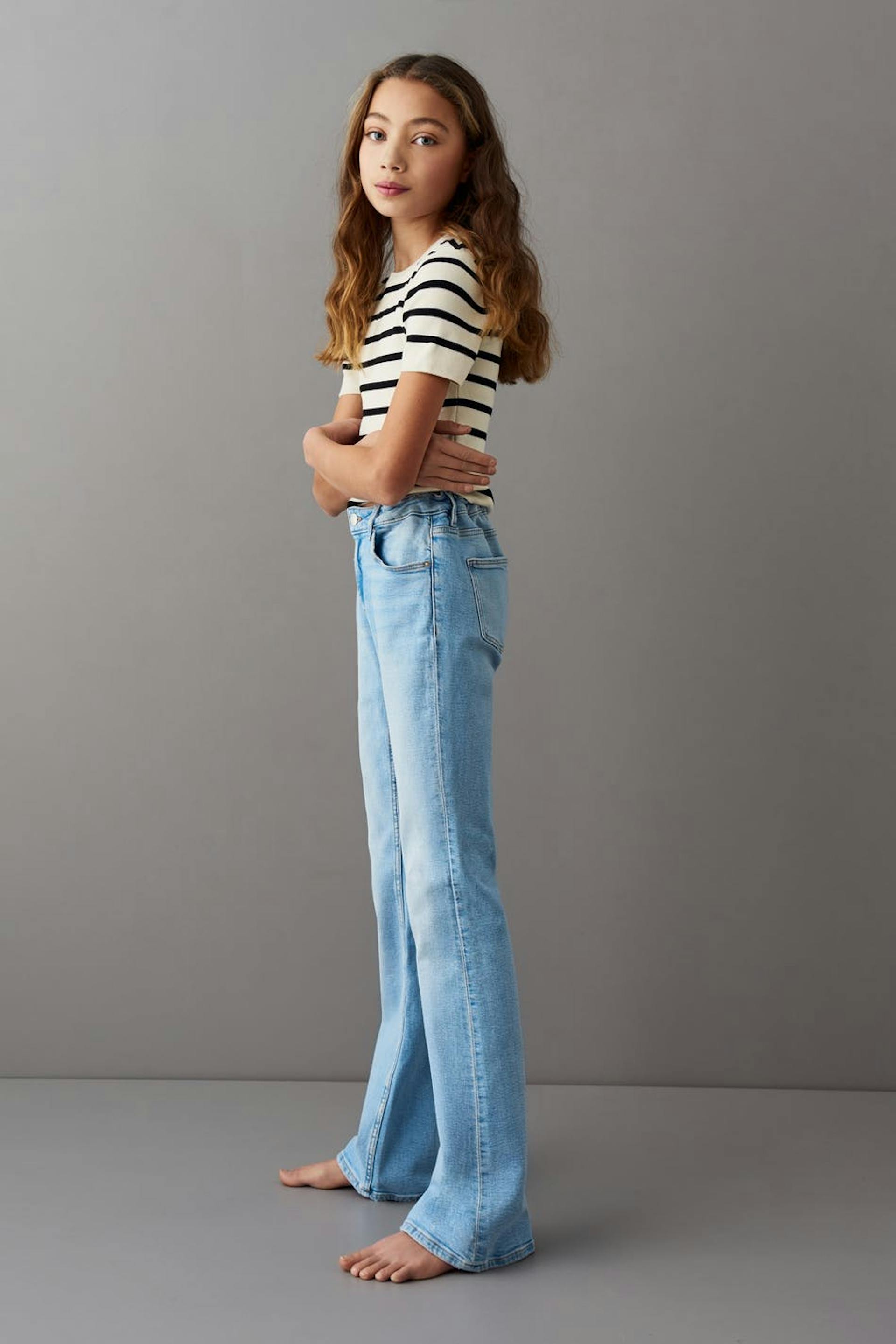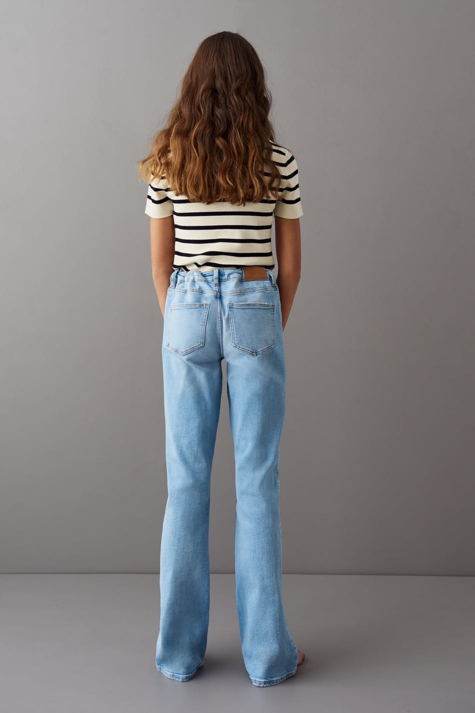 Boot cut jeans by Gina Tricot Young with low waist. The jeans are blue and have adjustable elastic at the waist. They have low stretch and extra long legs.