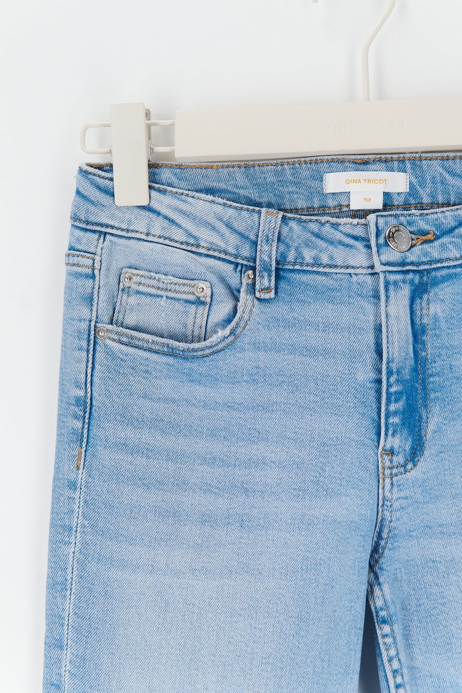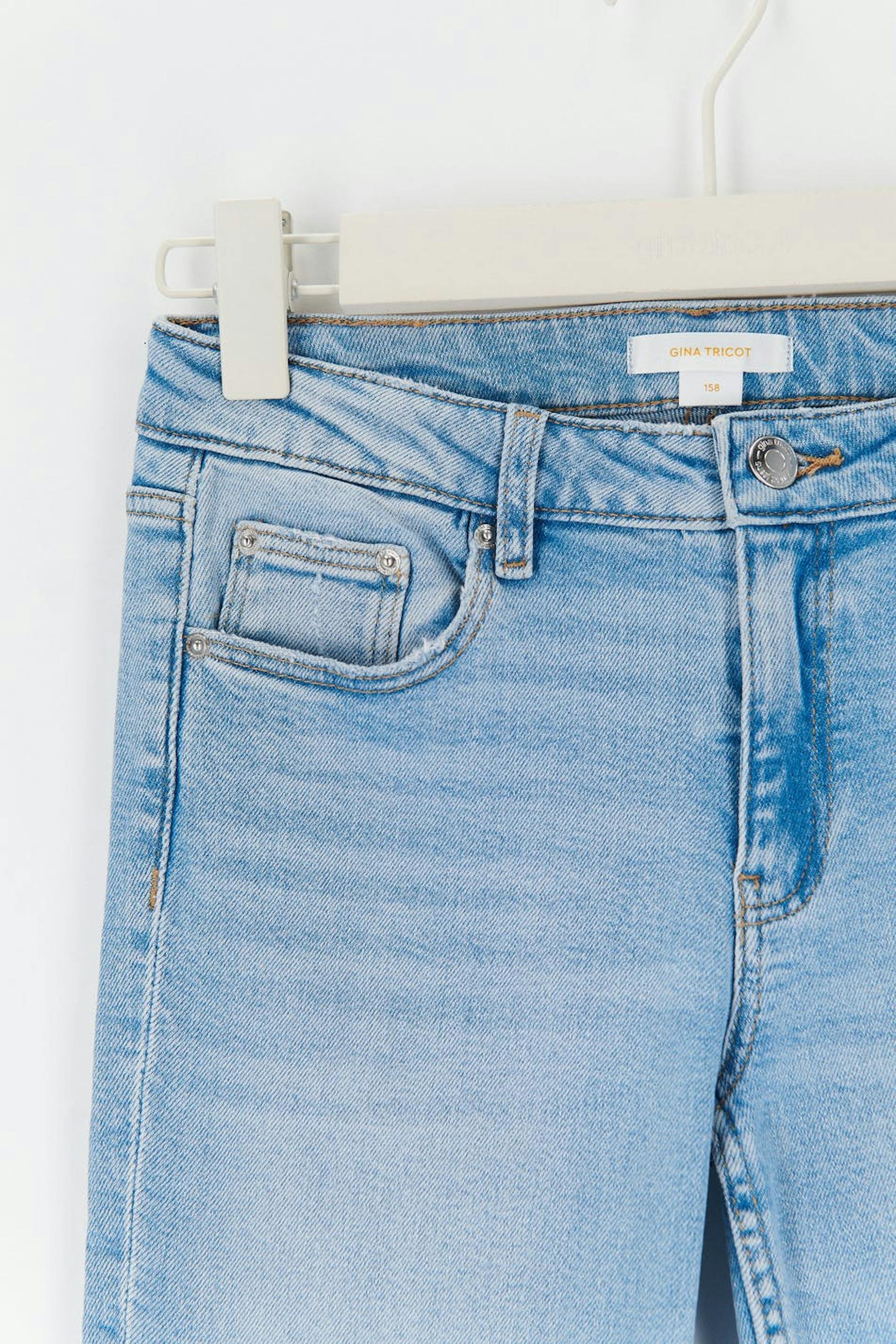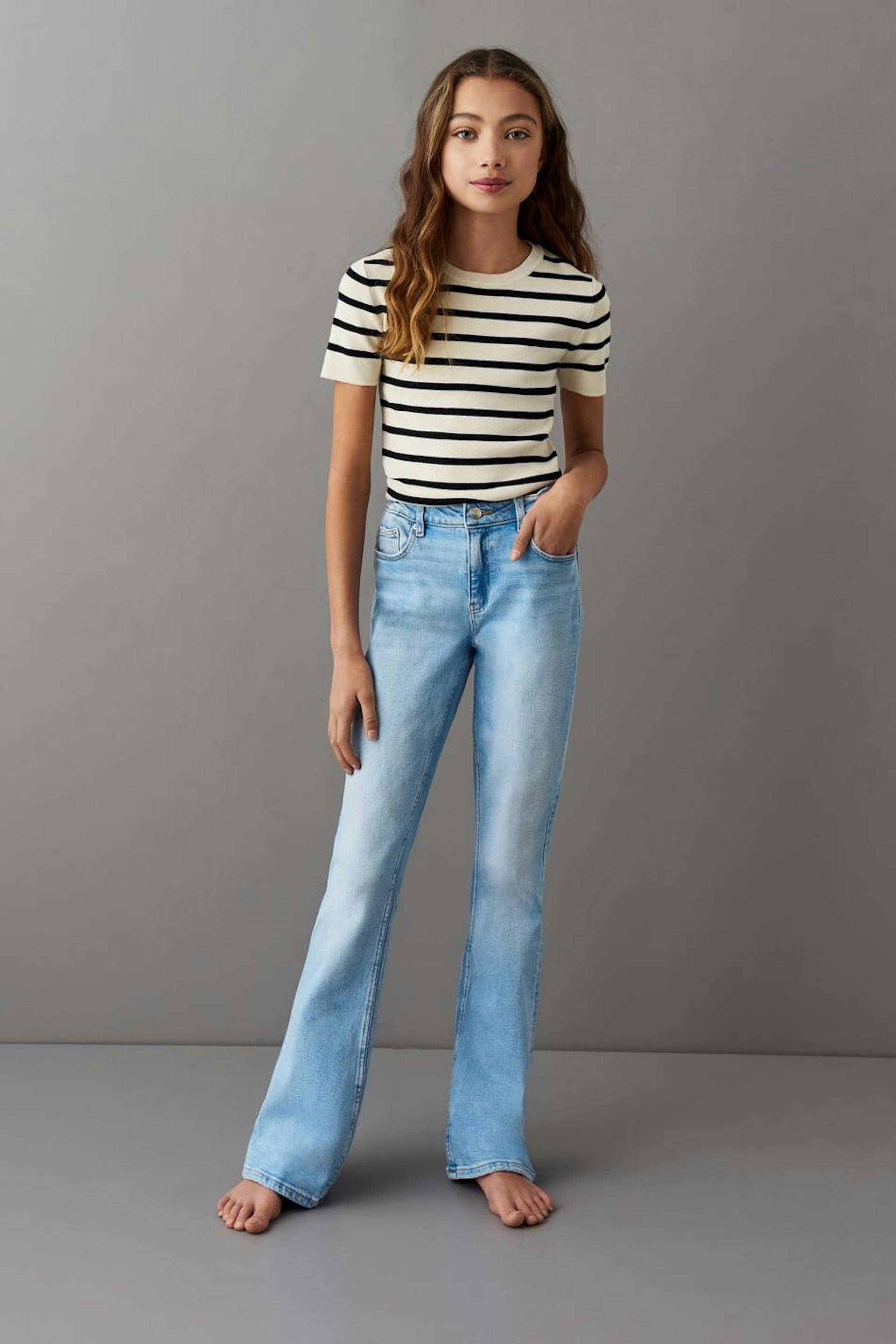 Boot cut jeans by Gina Tricot Young with low waist. The jeans are blue and have adjustable elastic at the waist. They have low stretch and extra long legs.